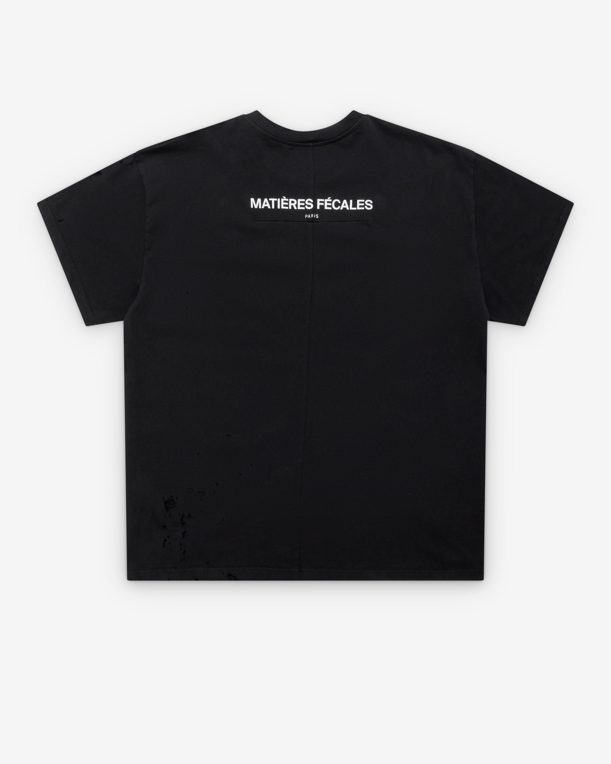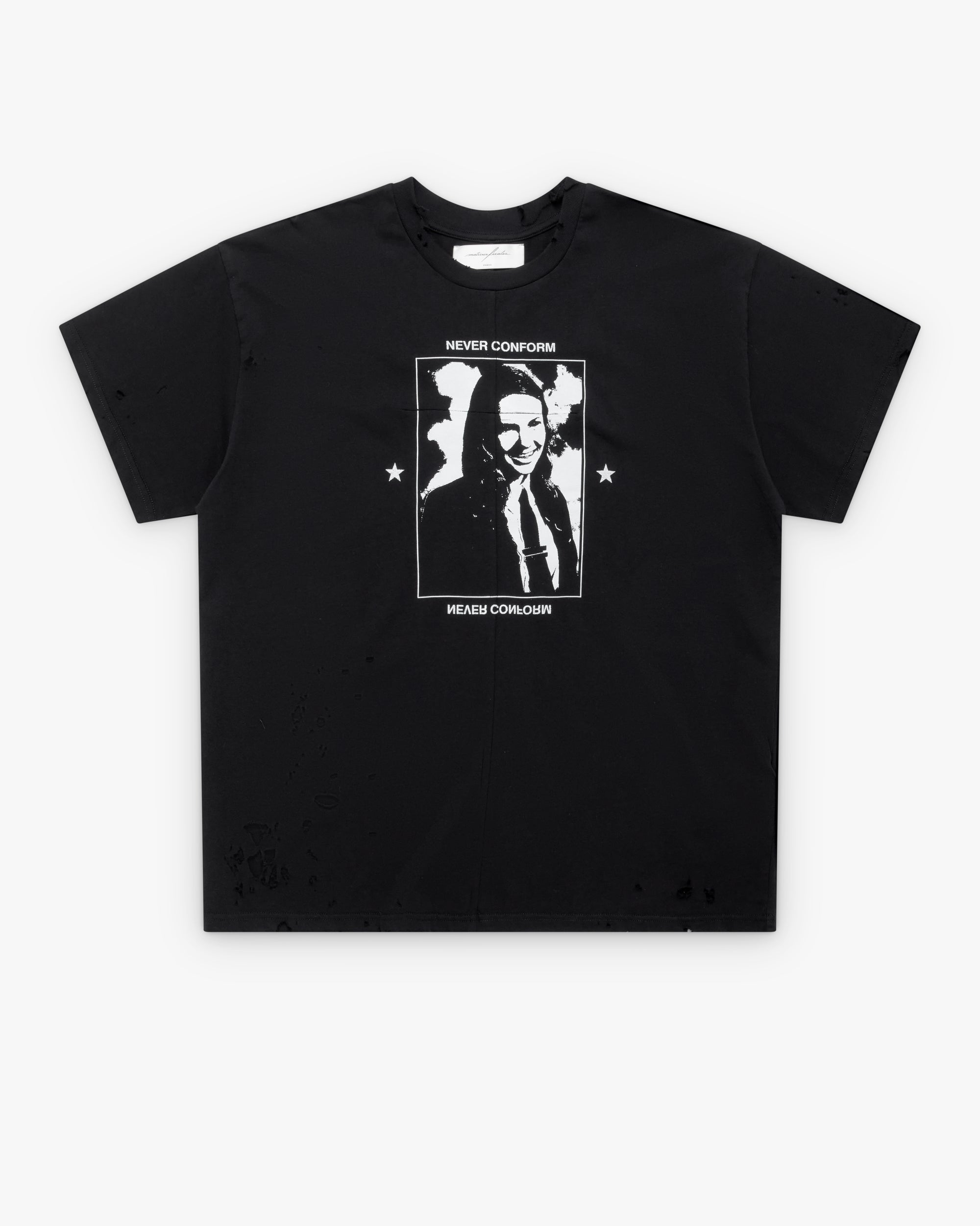 Cross seam on front and backRibbed crewneckDistressing throughoutPrinted graphic on front and back