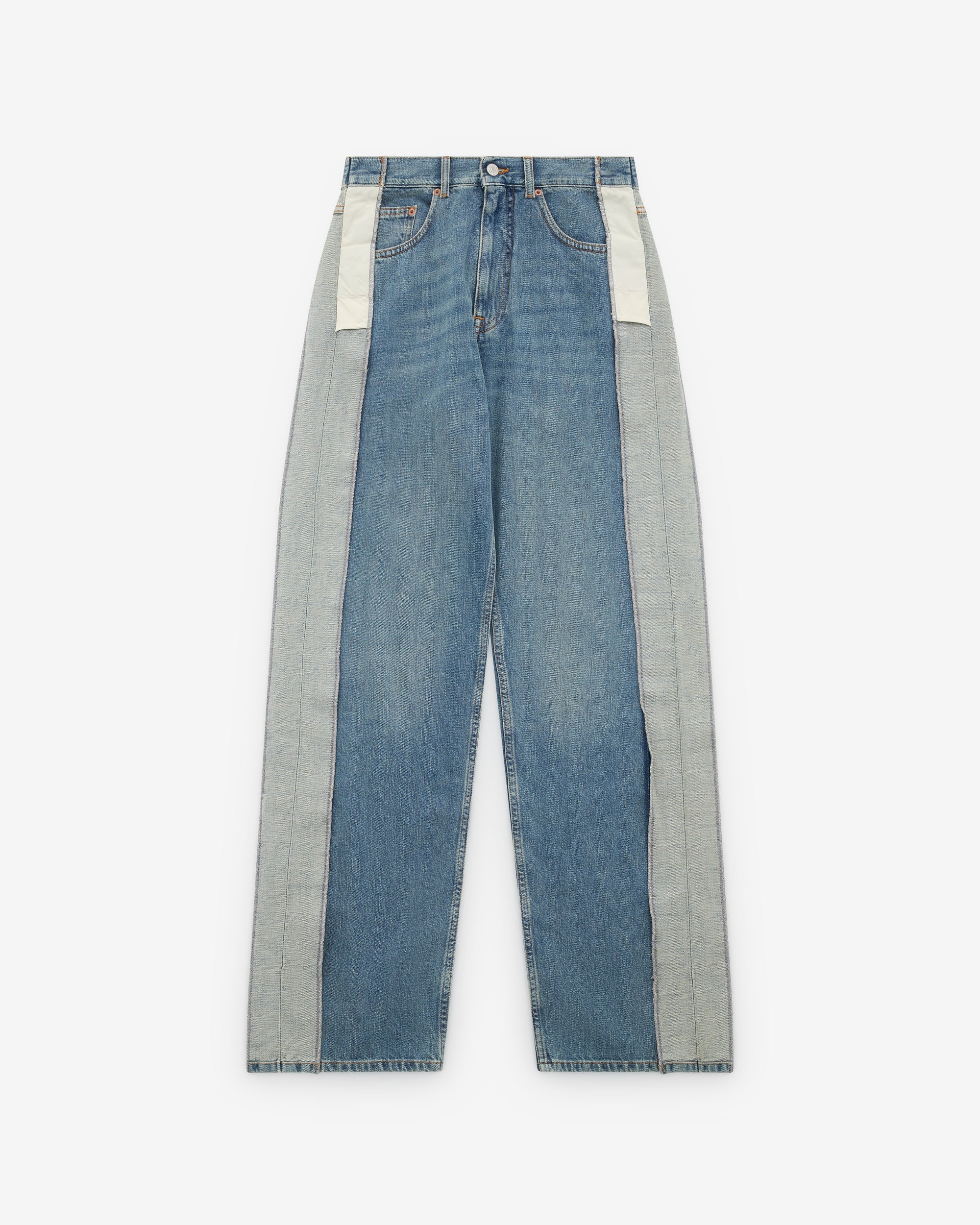 Straight-leg jeansReduced side panel detail5-pocket constructionButton and zip flyNumeric artwork to the rearWhite stitch line at the back