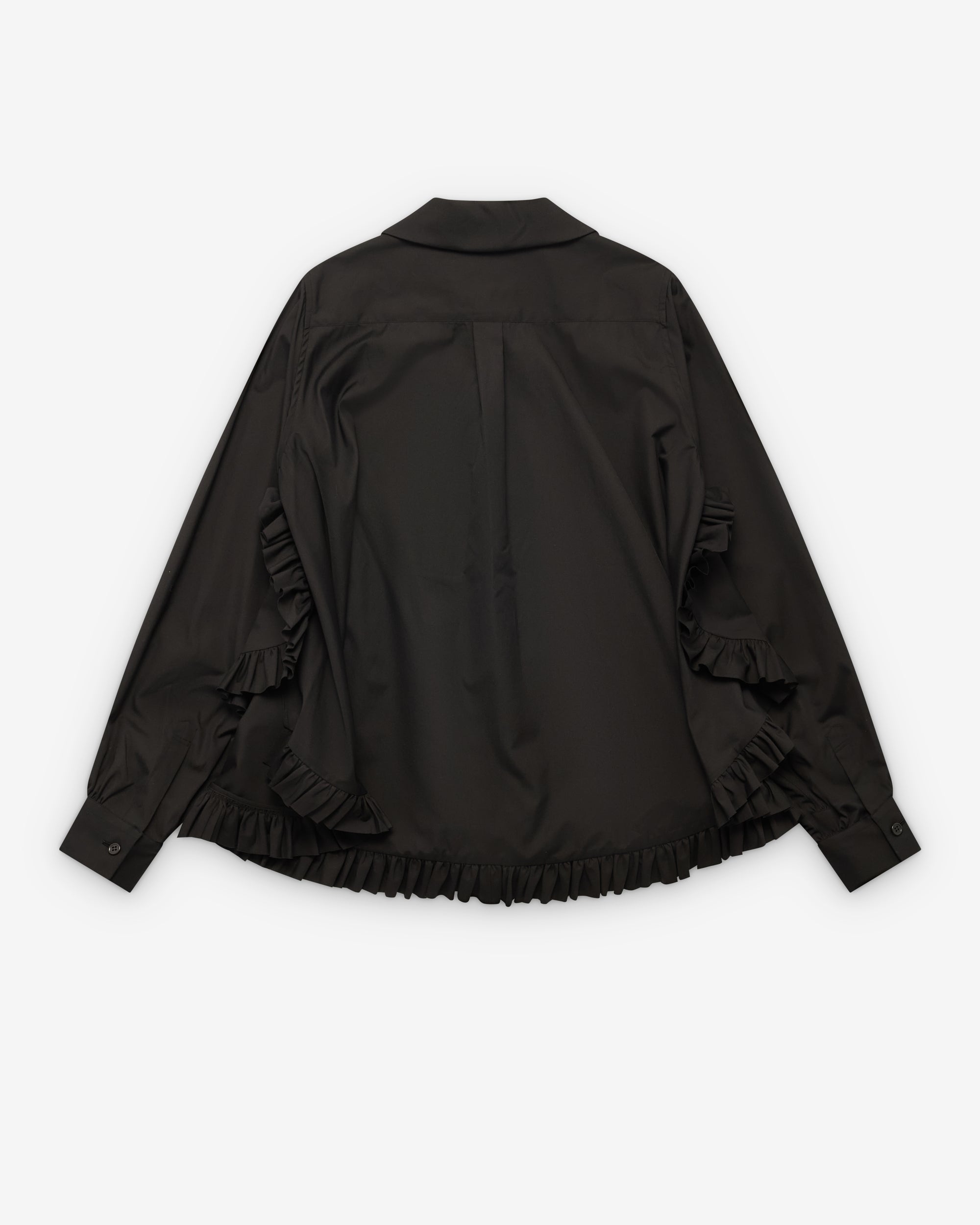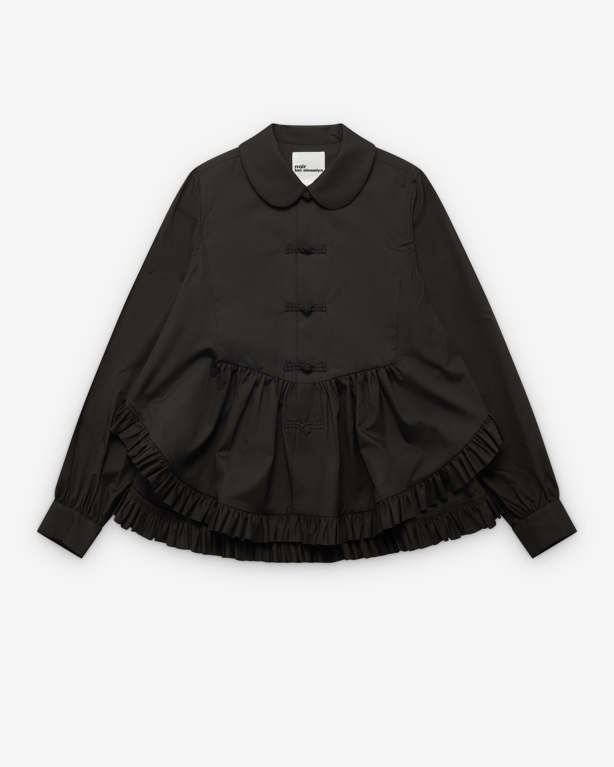 Peterpan collarFabric frog closureLong sleevesButton close cuffsRuffle hem
