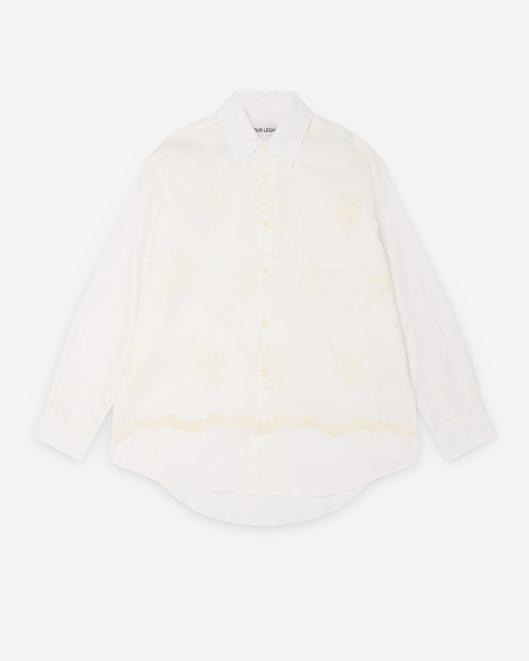 Contrast layer with flower motifApplied-on placketOne-piece collar and collar standMother of pearl buttonsElongated body100% CottonMade in Portugal