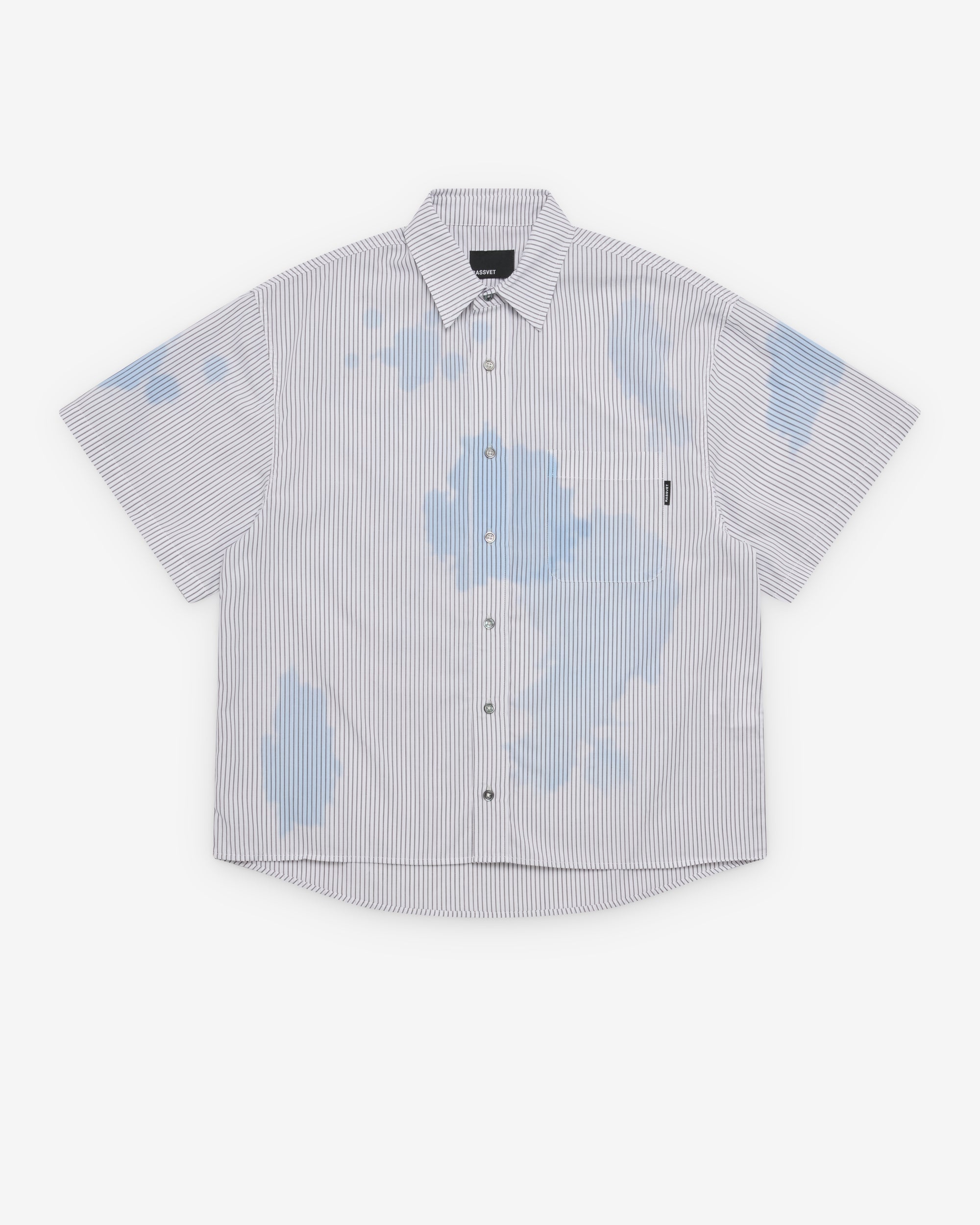Classic collarShort sleevesStriped fabric Chest pocketTab label at pocketShirttail hem