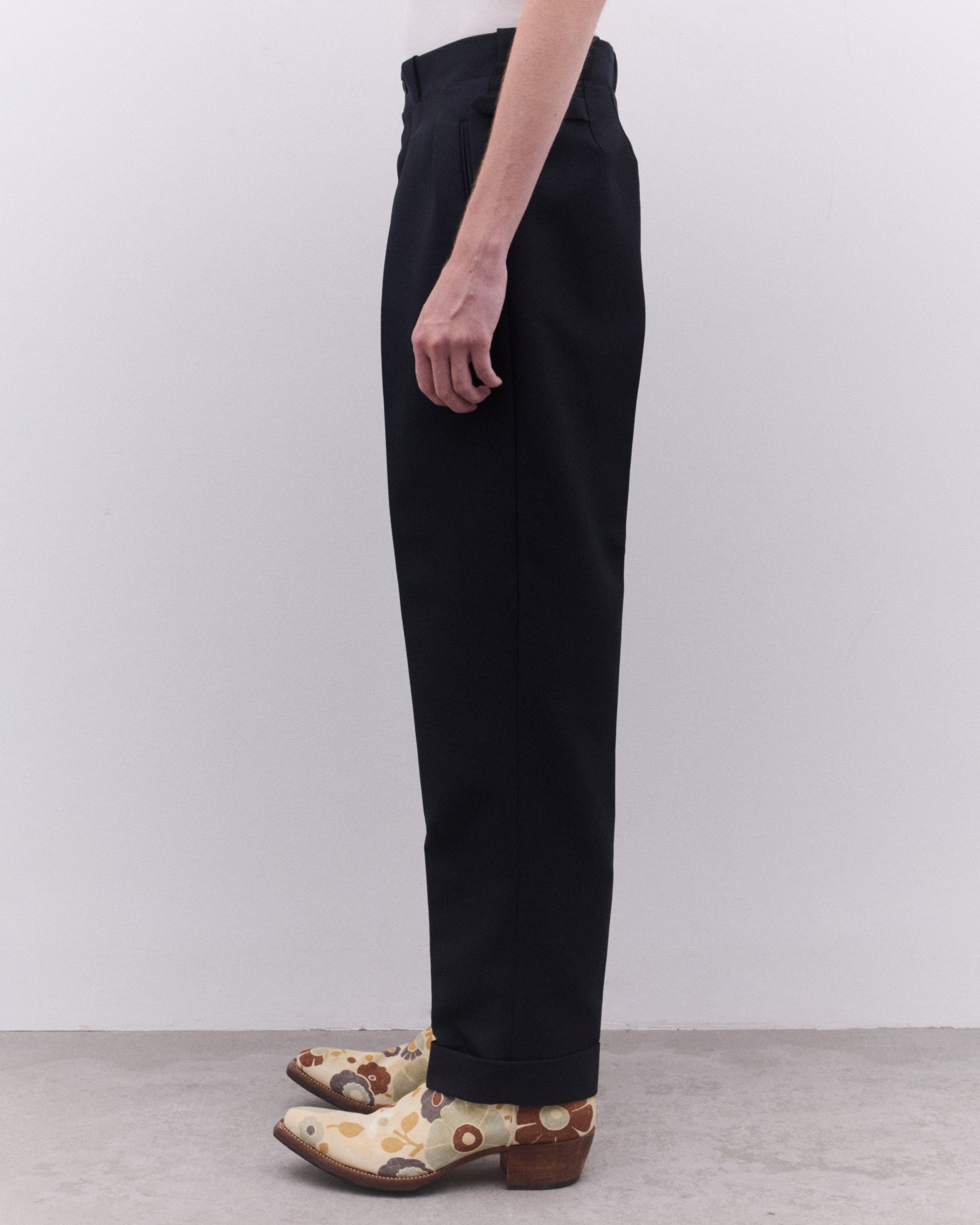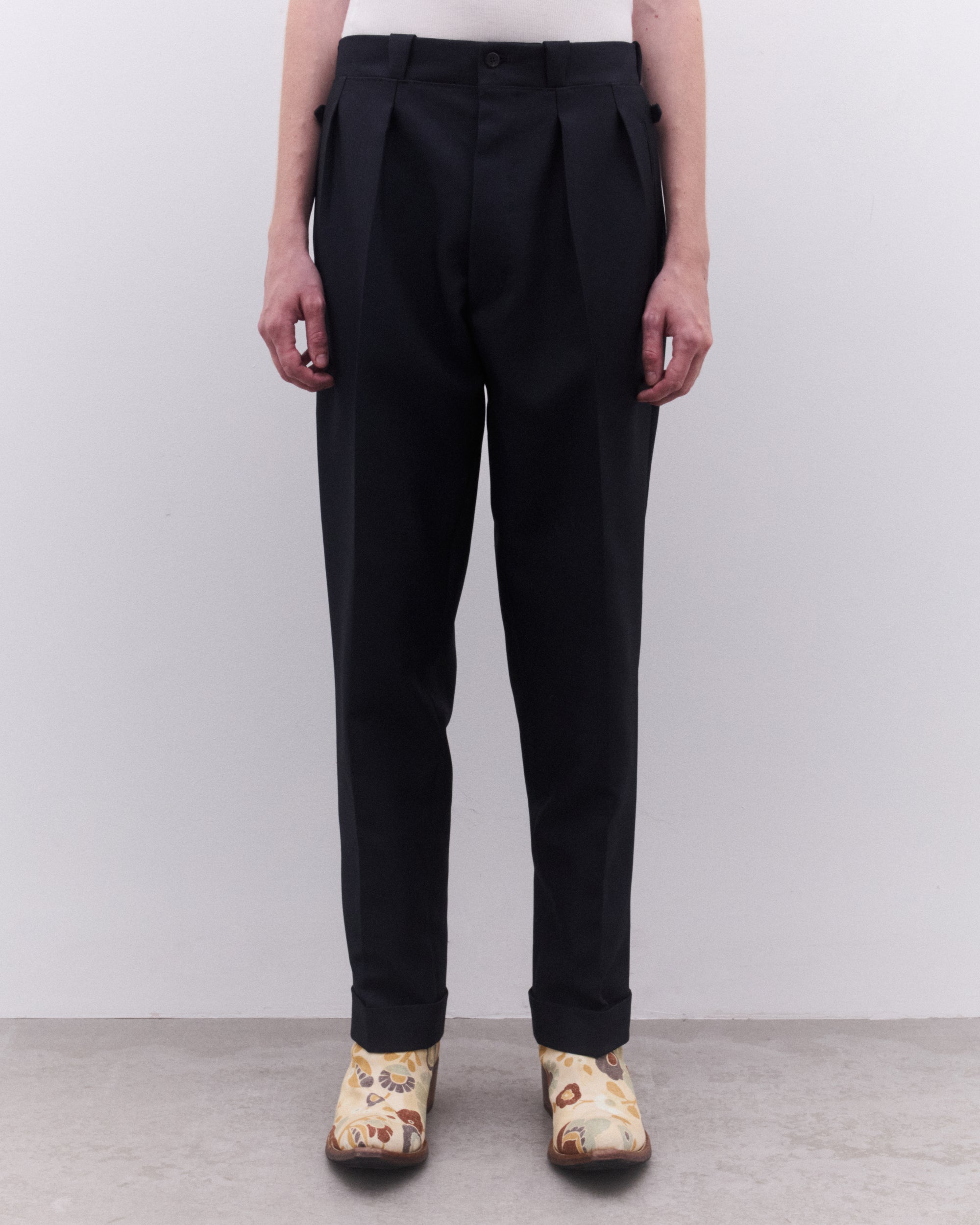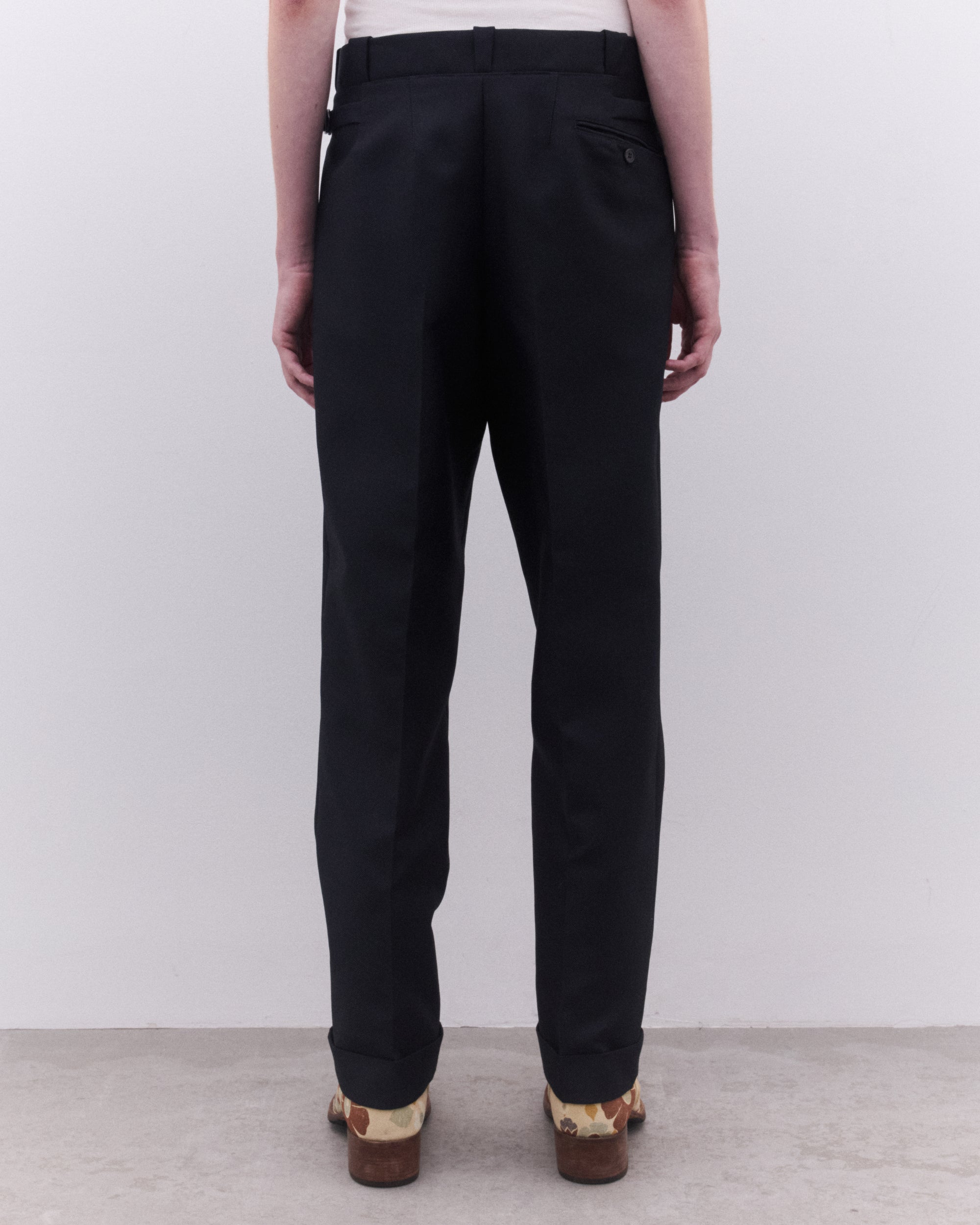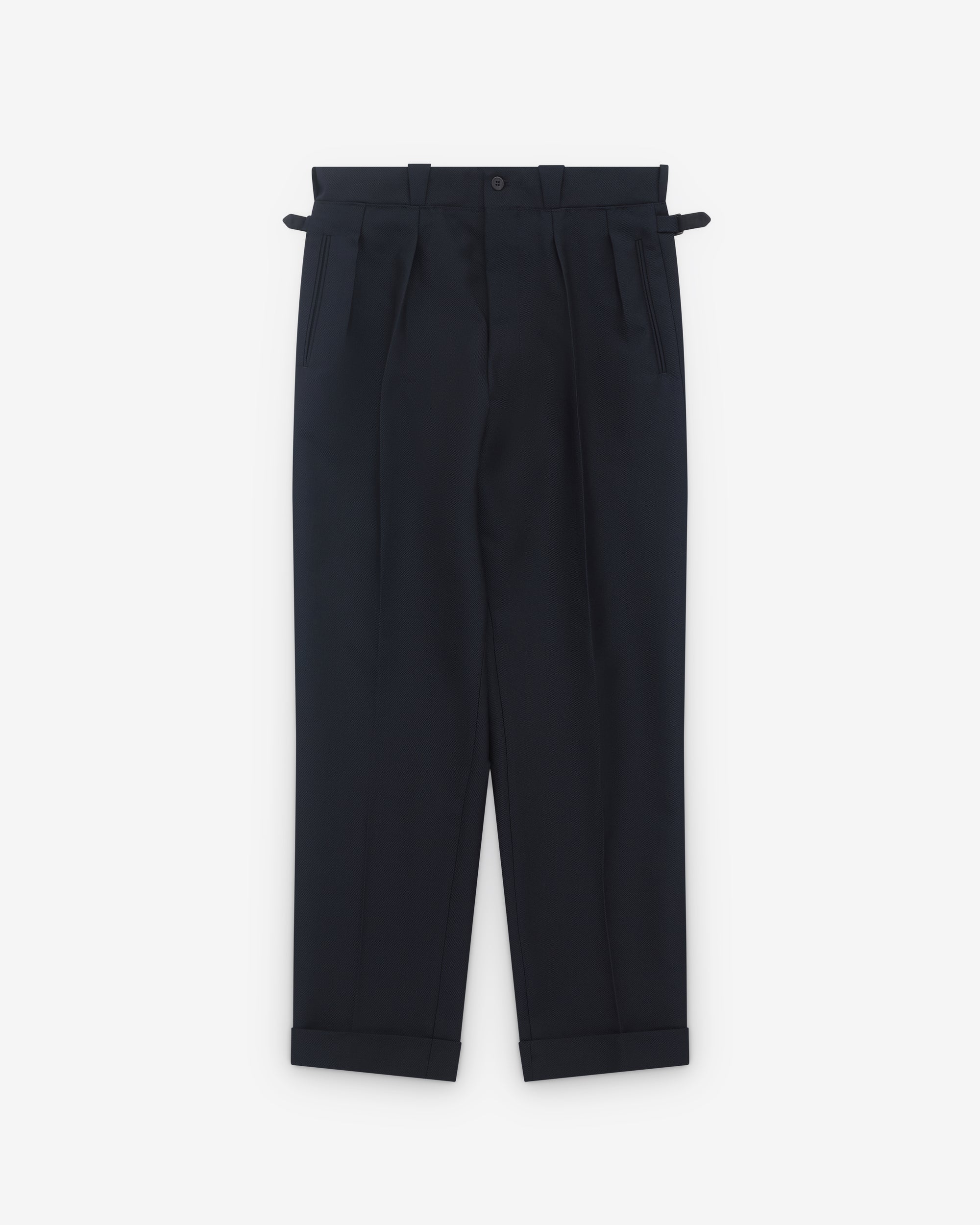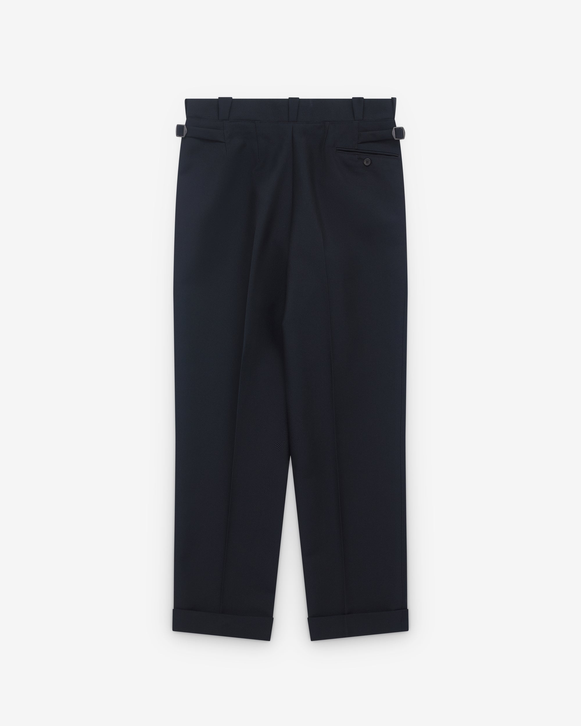 Classic fitConstructed waistband with adjustable straps on the sidesButton flyDouble welt front pocketsDouble welt back pocket with button