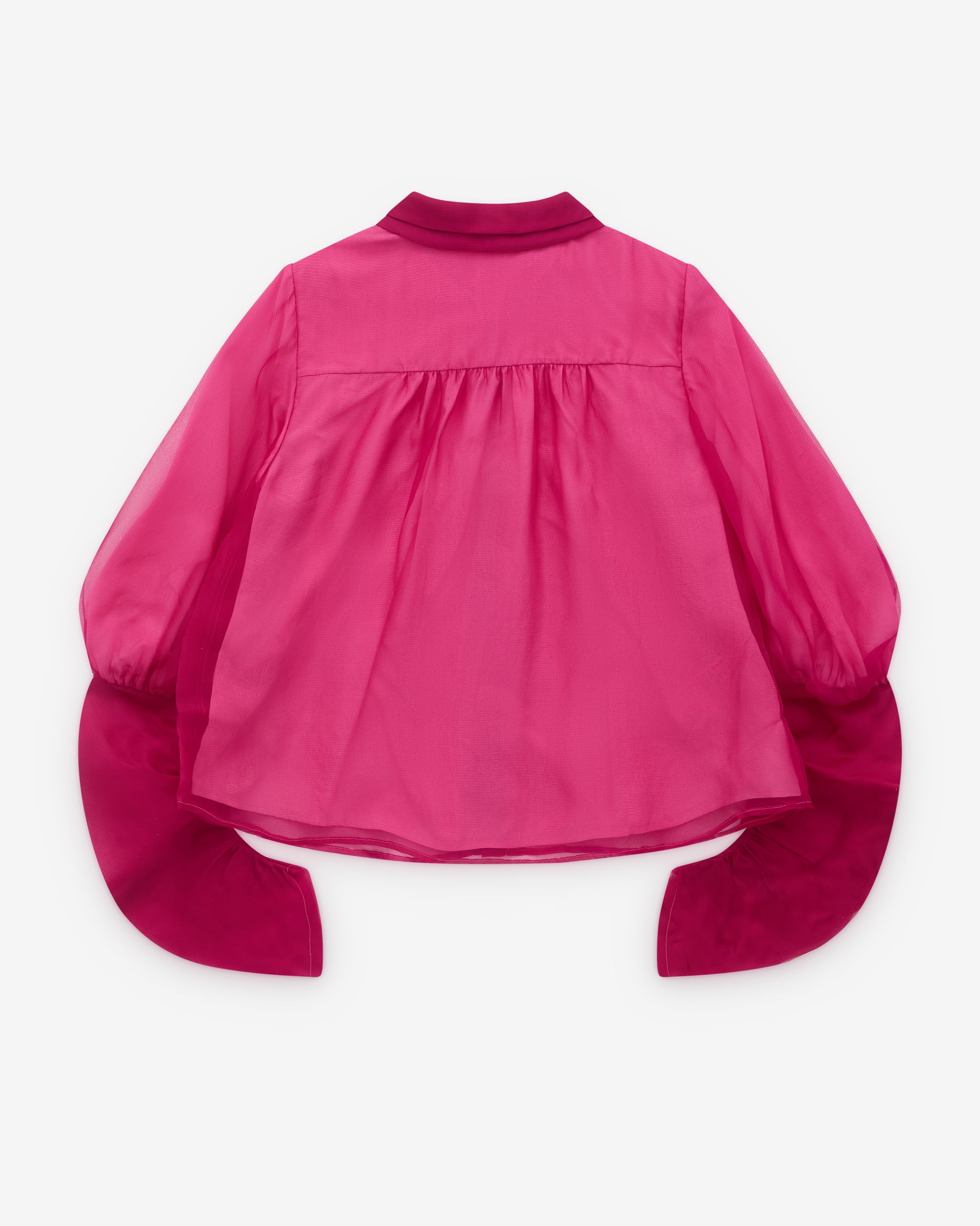 Double layer round collarButton closureCurved hemGathered detail at elbowRear pleated yoke