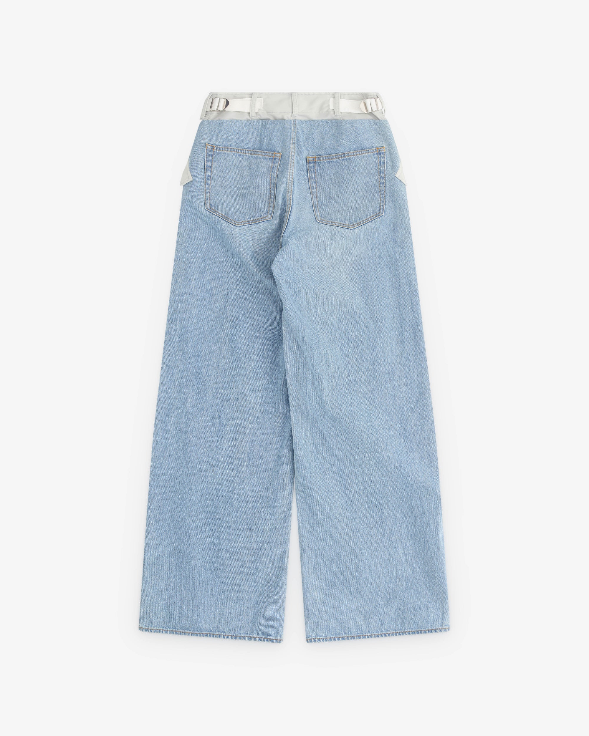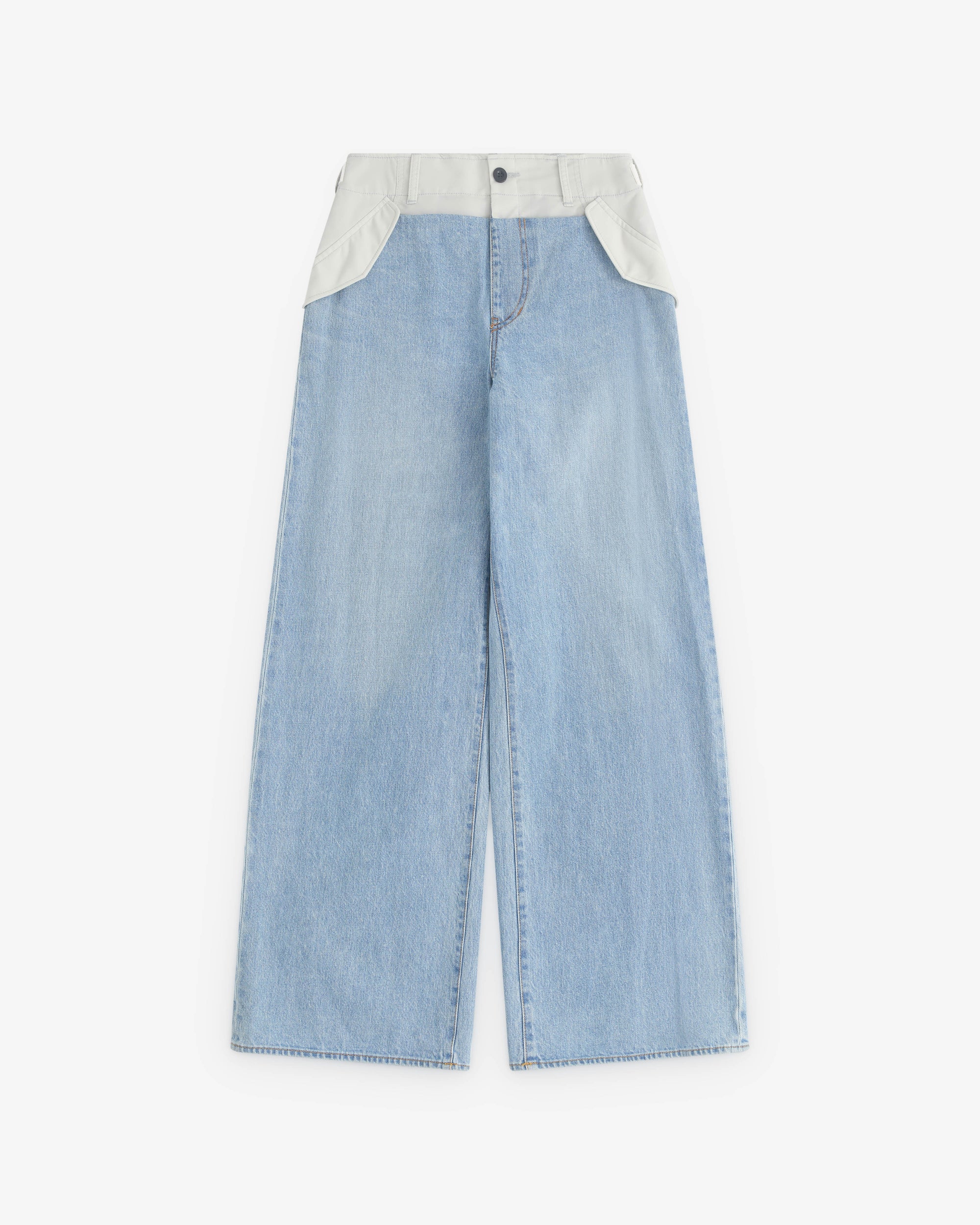 Nylon waist bandButton waist closureWide legSide seam pocketsTwo rear pockets