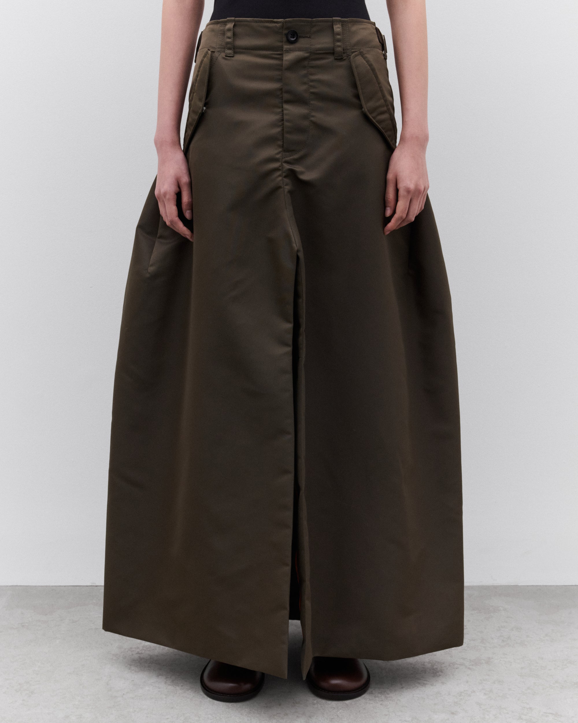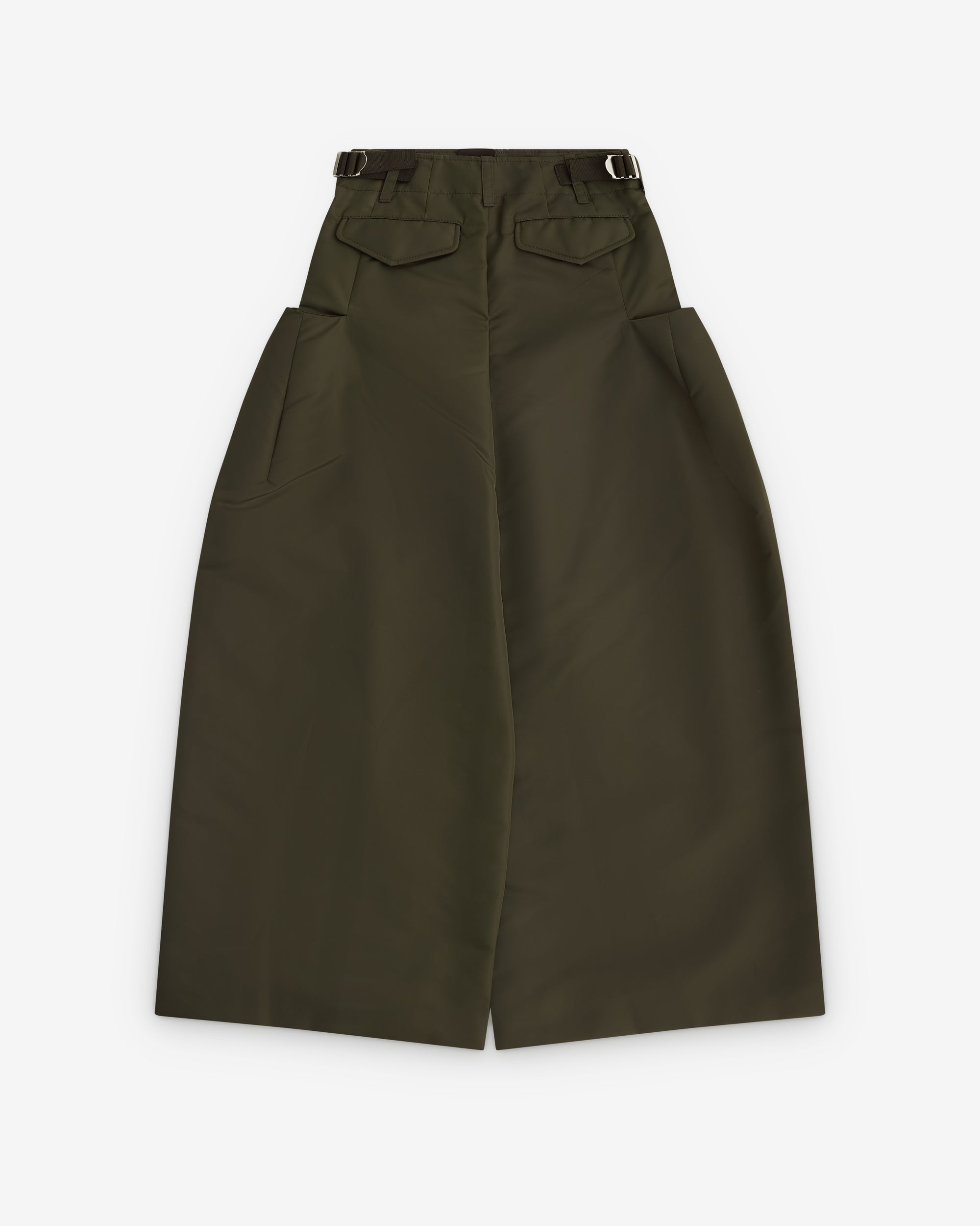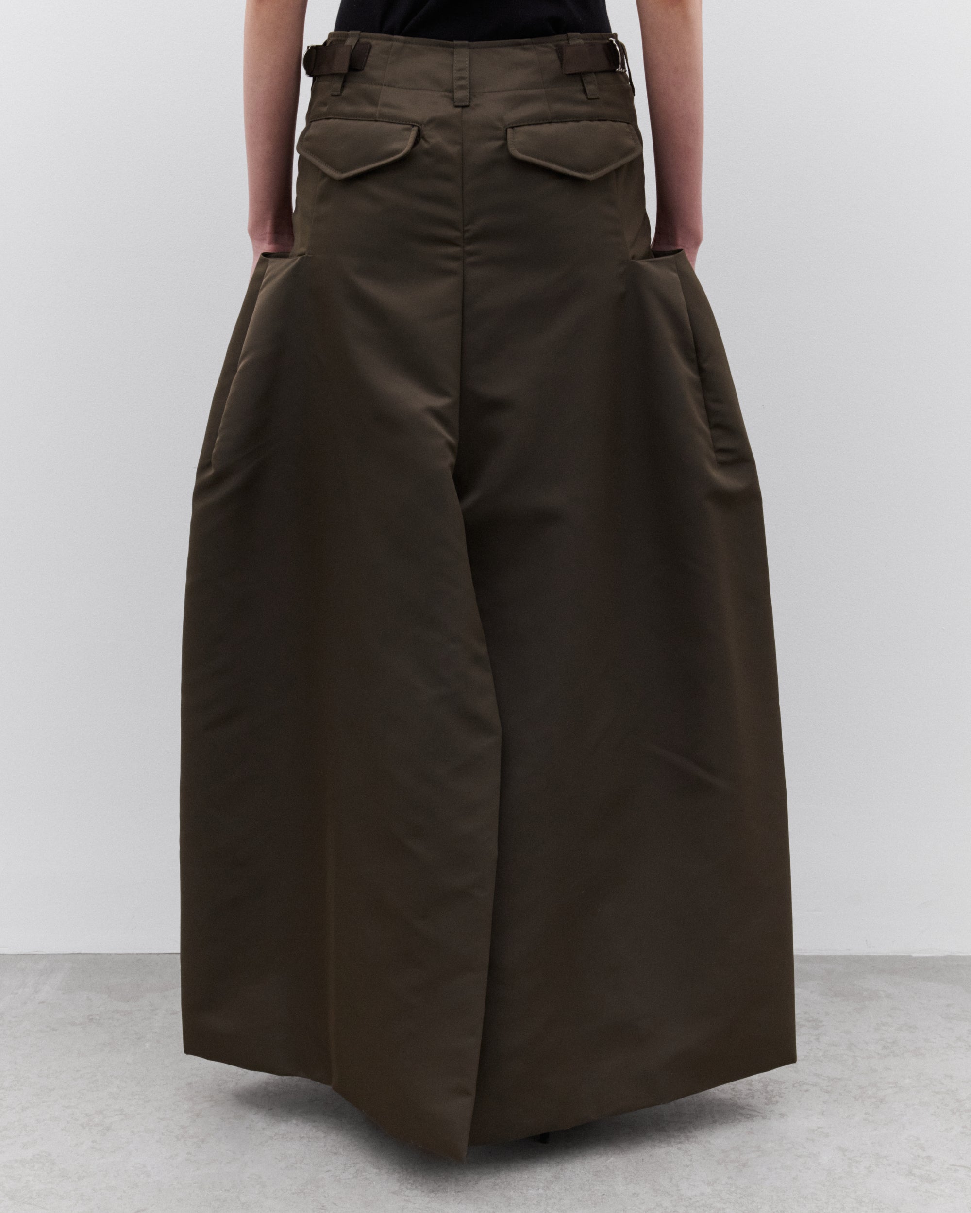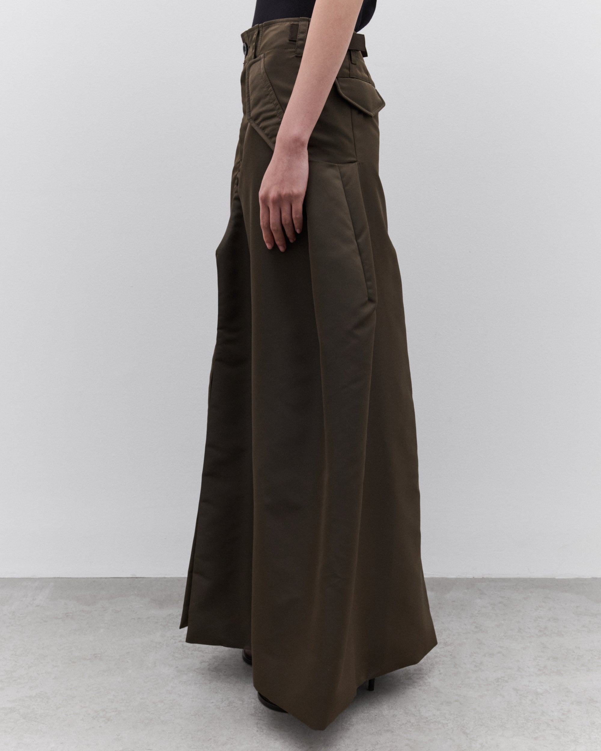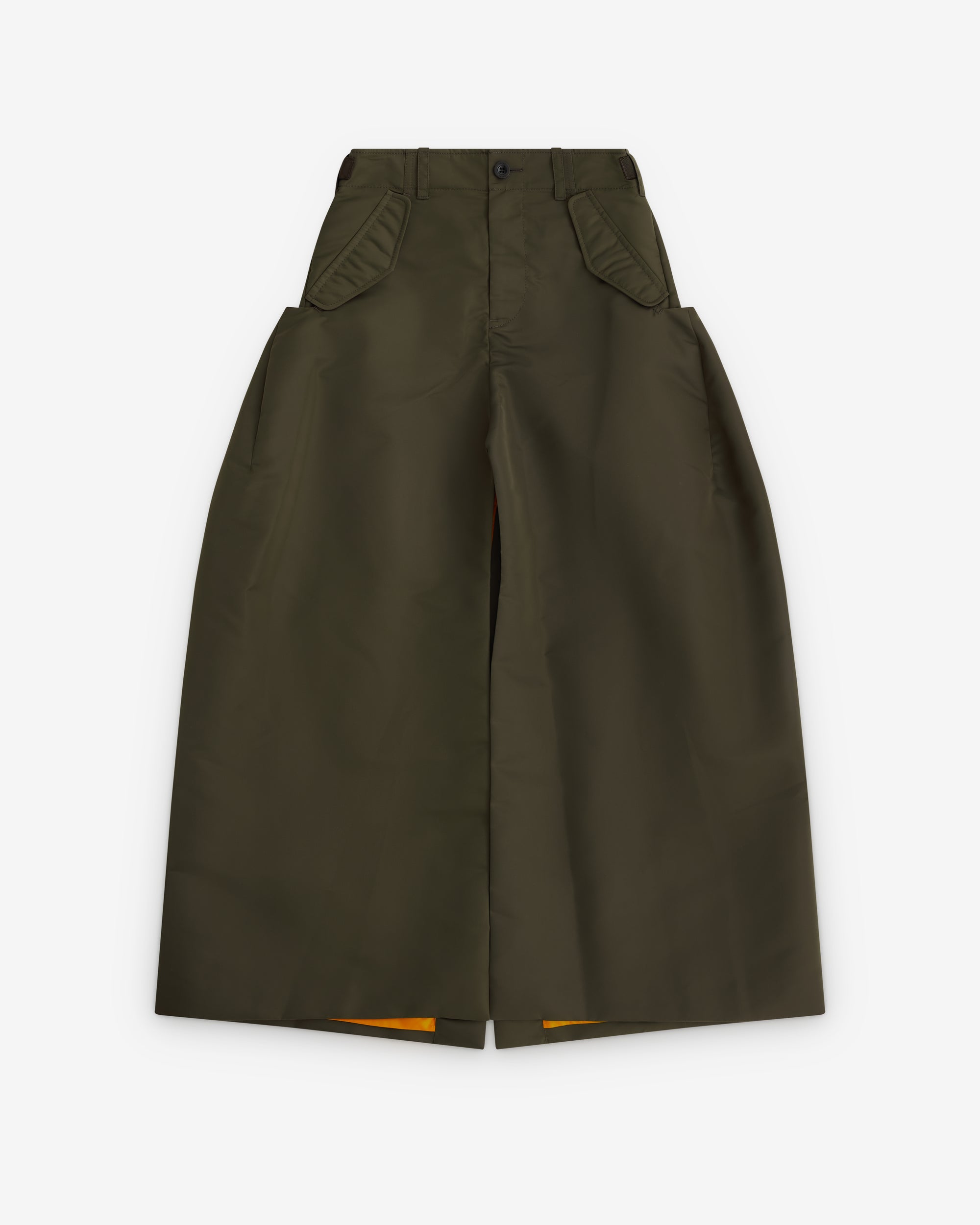 High waistVoluminous bodyFront and rear flap pocketsSide adjustersBUtton and zip fly fastening
