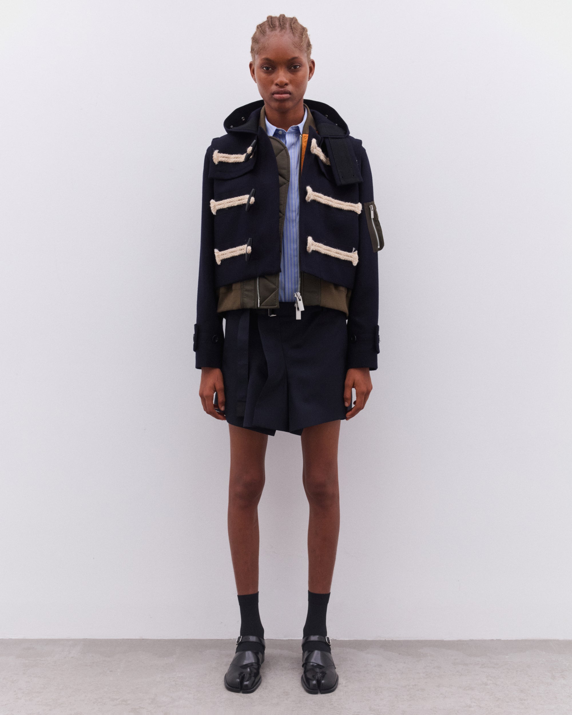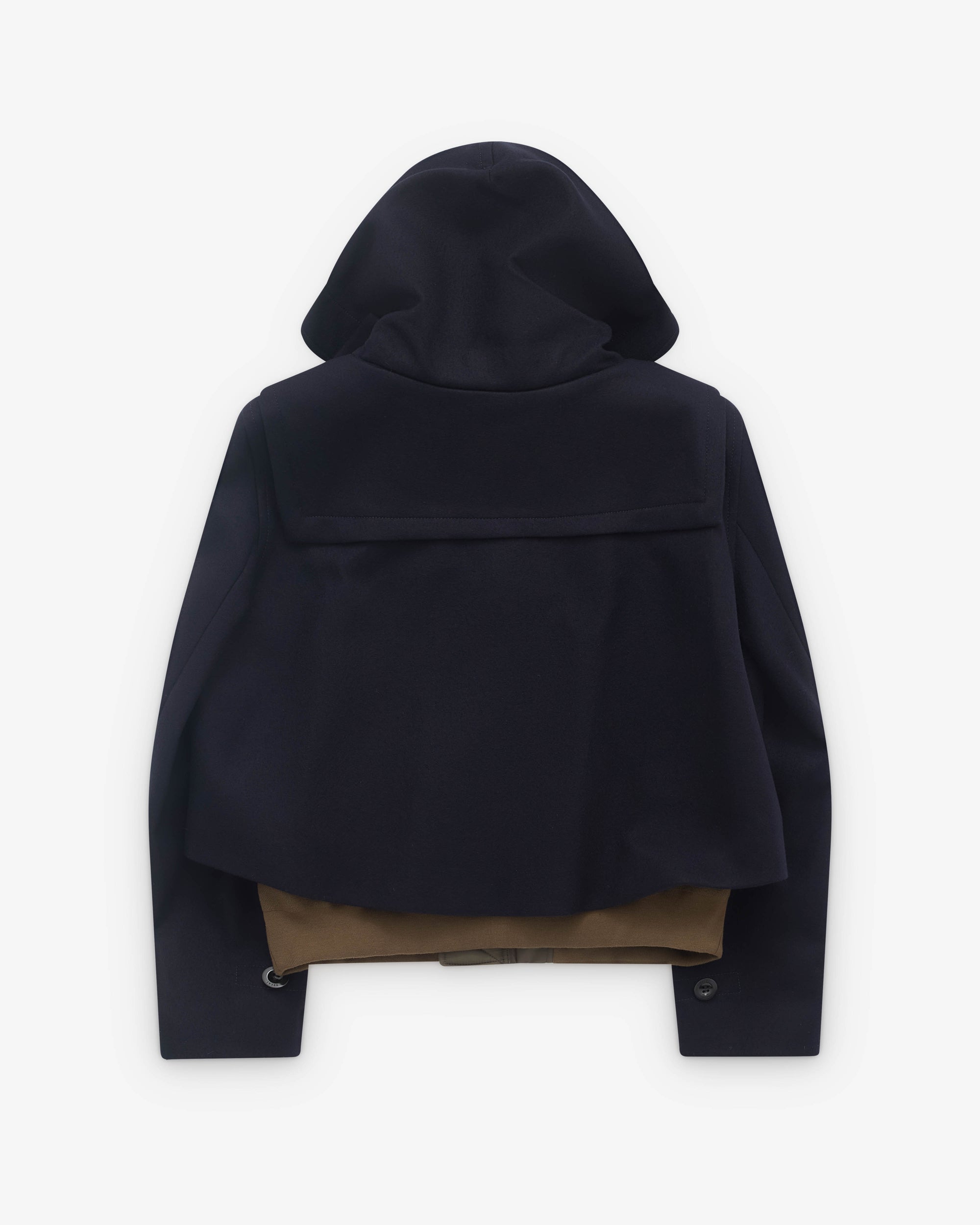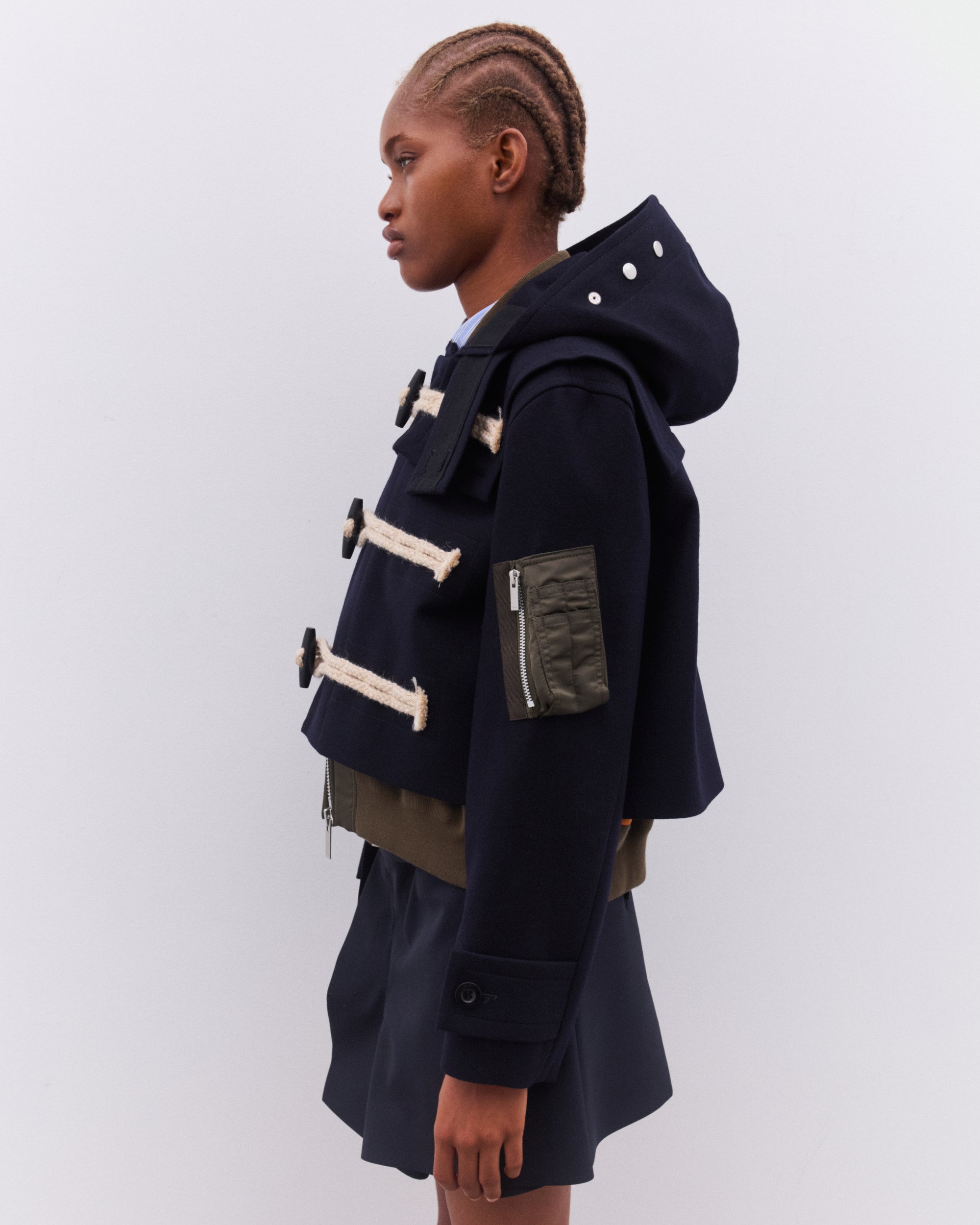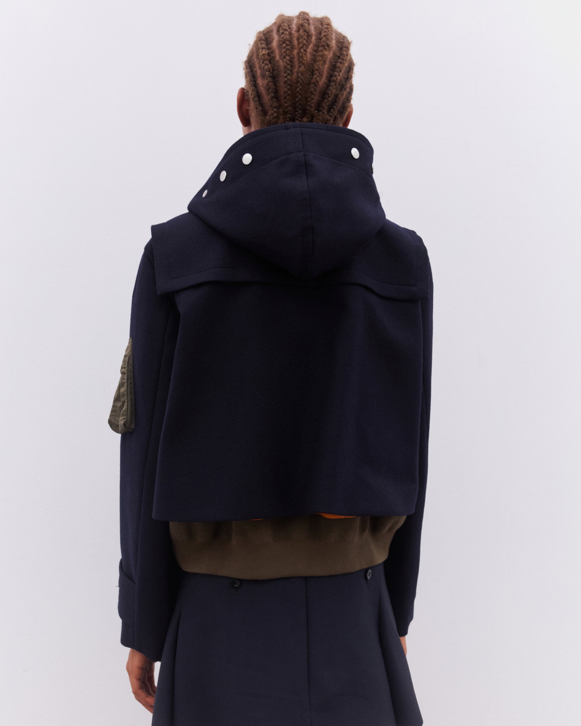 Melton wool fabricDuffle coat closureArm zip pocketStorm flap at collarInternal liningInternal bomber jacket constructionPress stud details