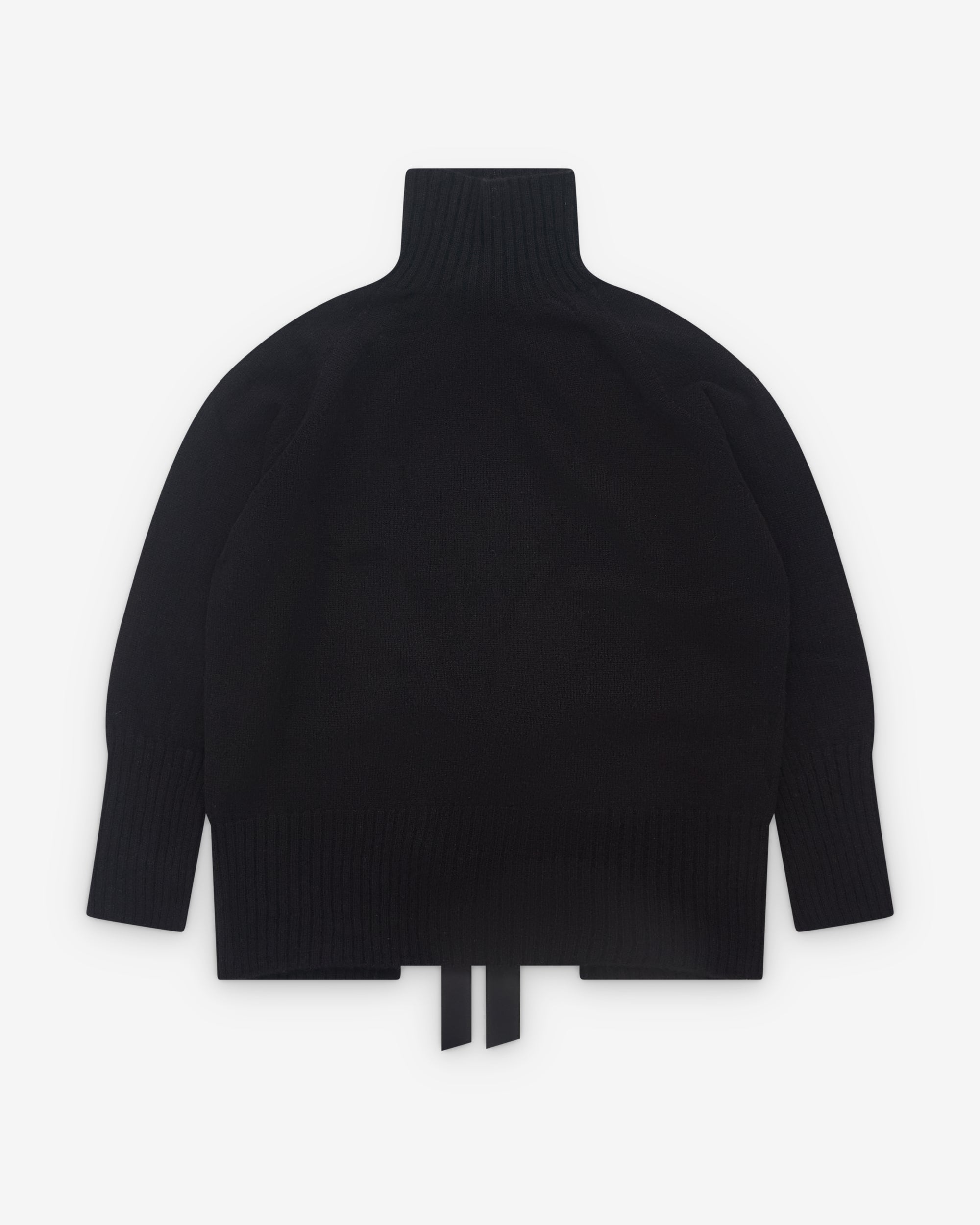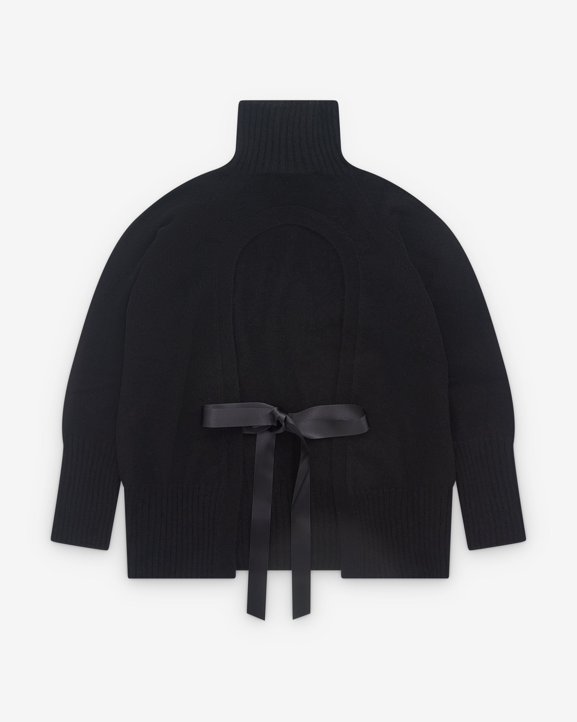Ribbed funnel neck lineRibbon detail at backCut out at backLong sleevesRibbed cuffs and hem