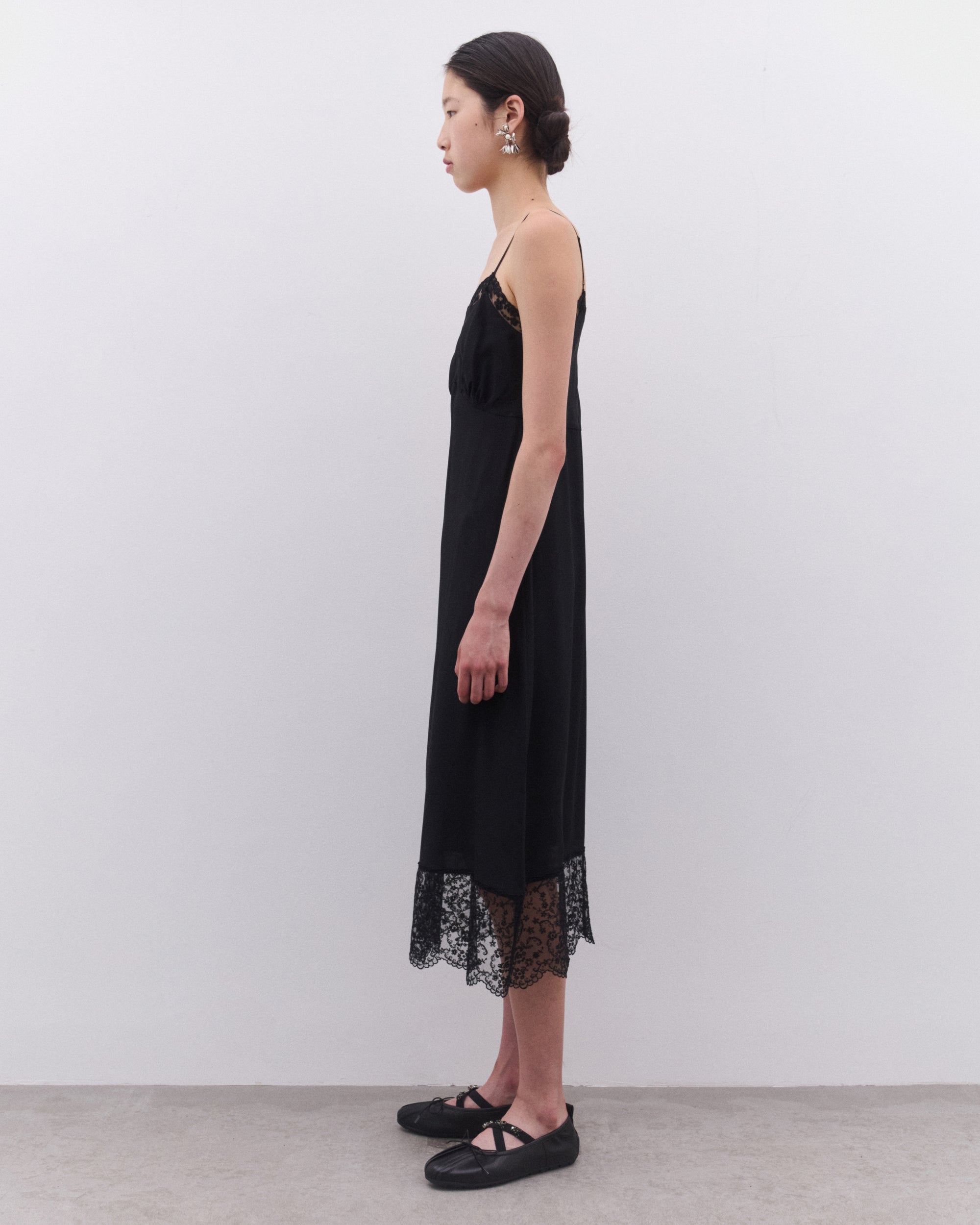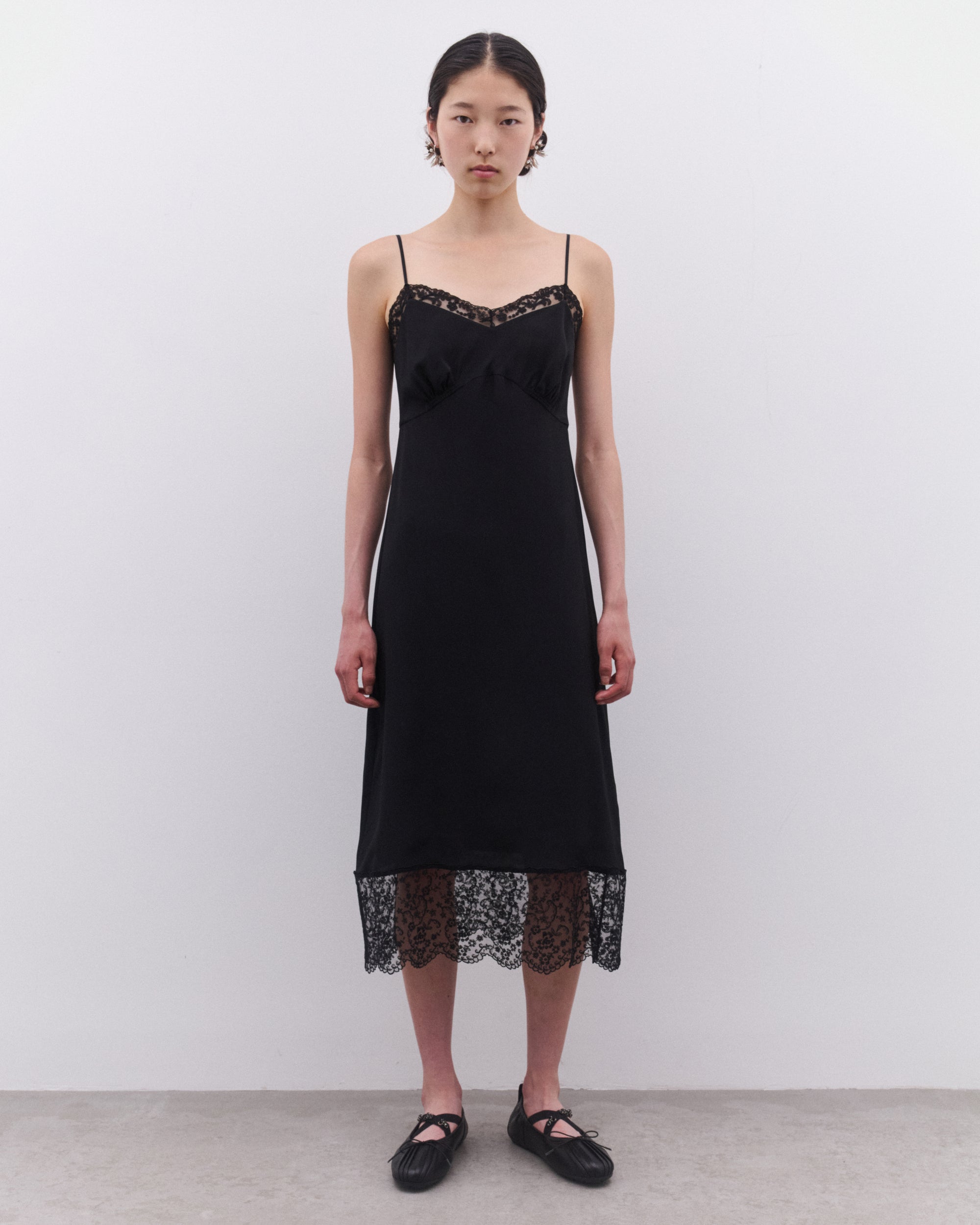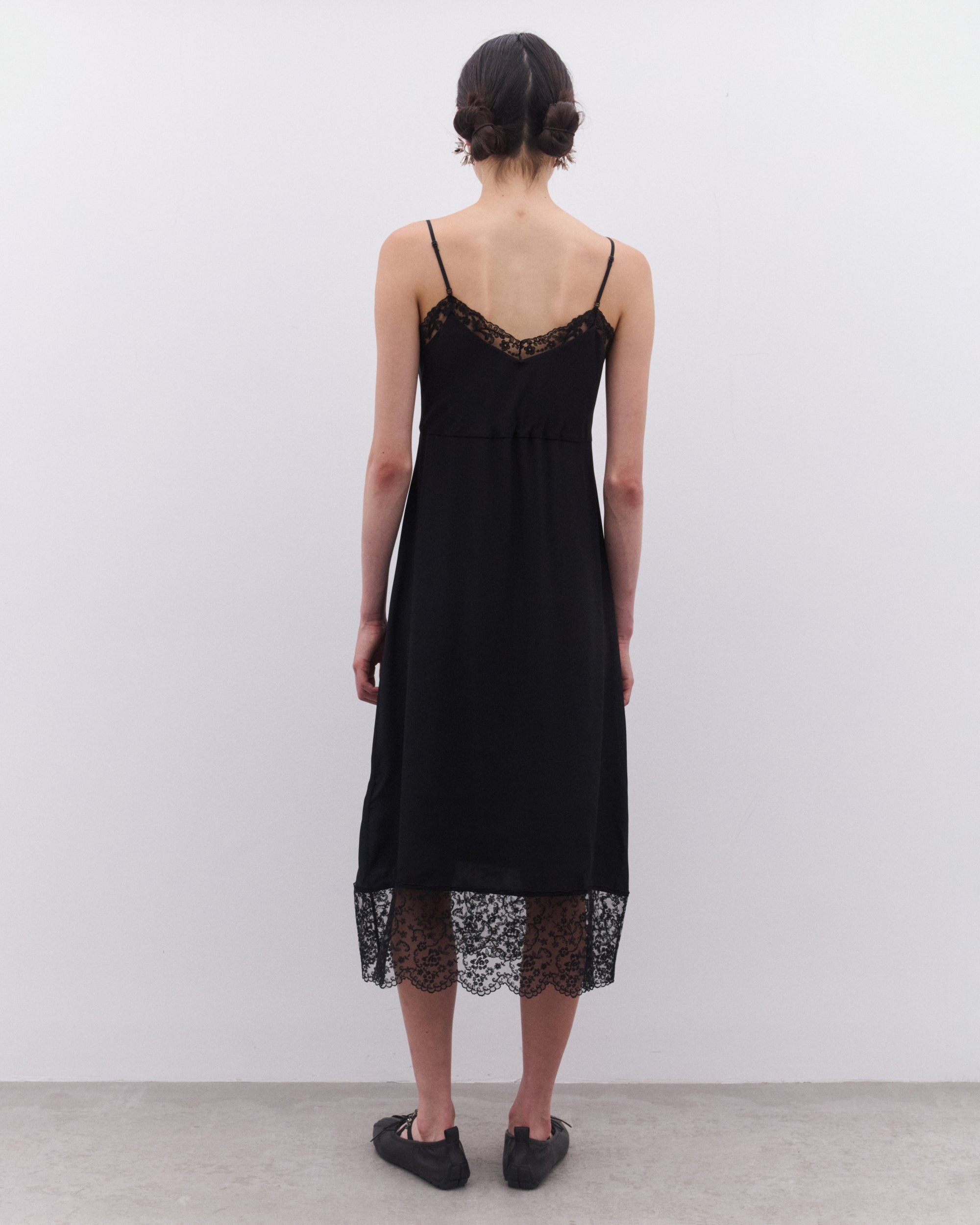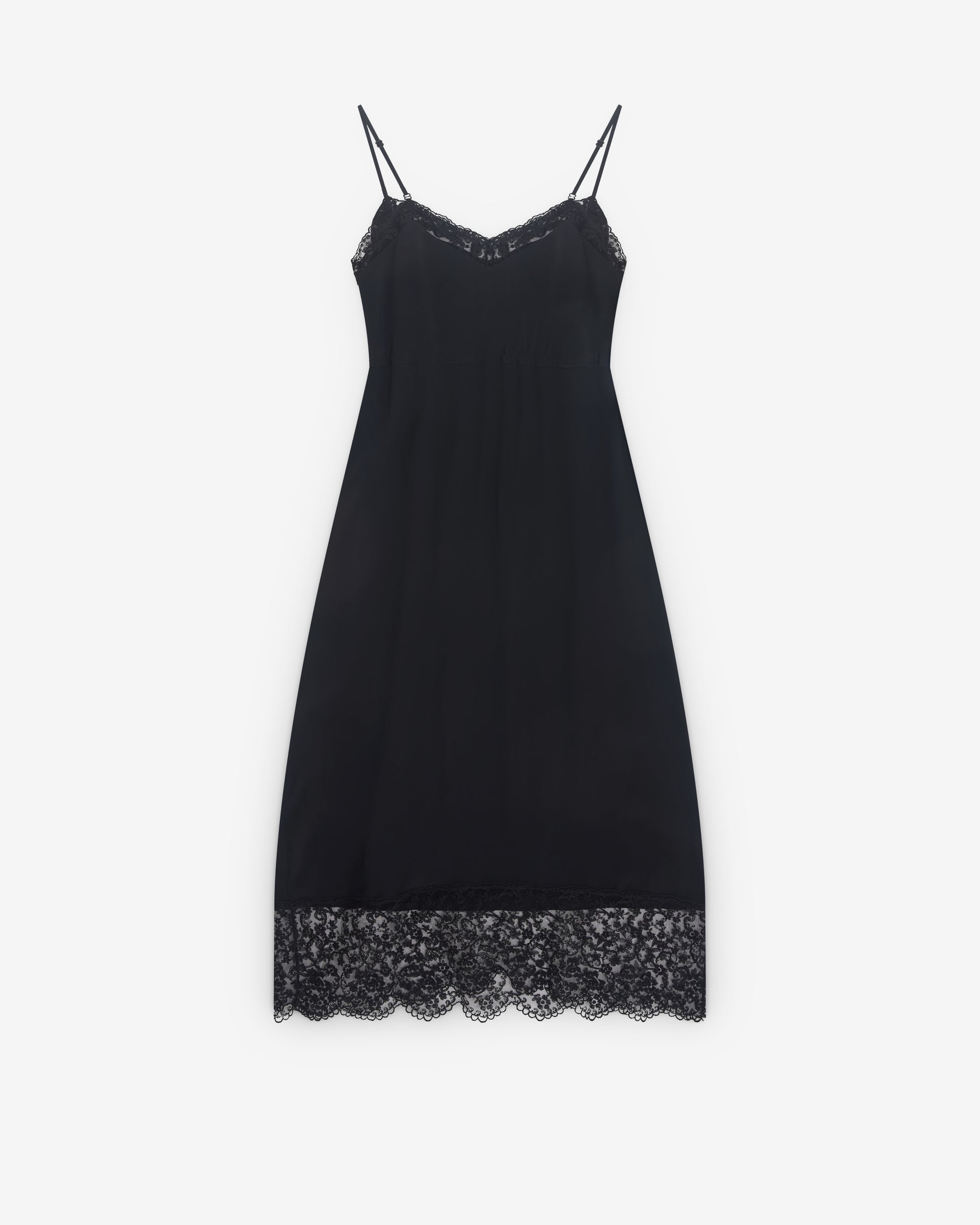 Slim strapsLace trim at neckline and hemEmpire waistline with gathering at bustA-line silhouetteMid-length