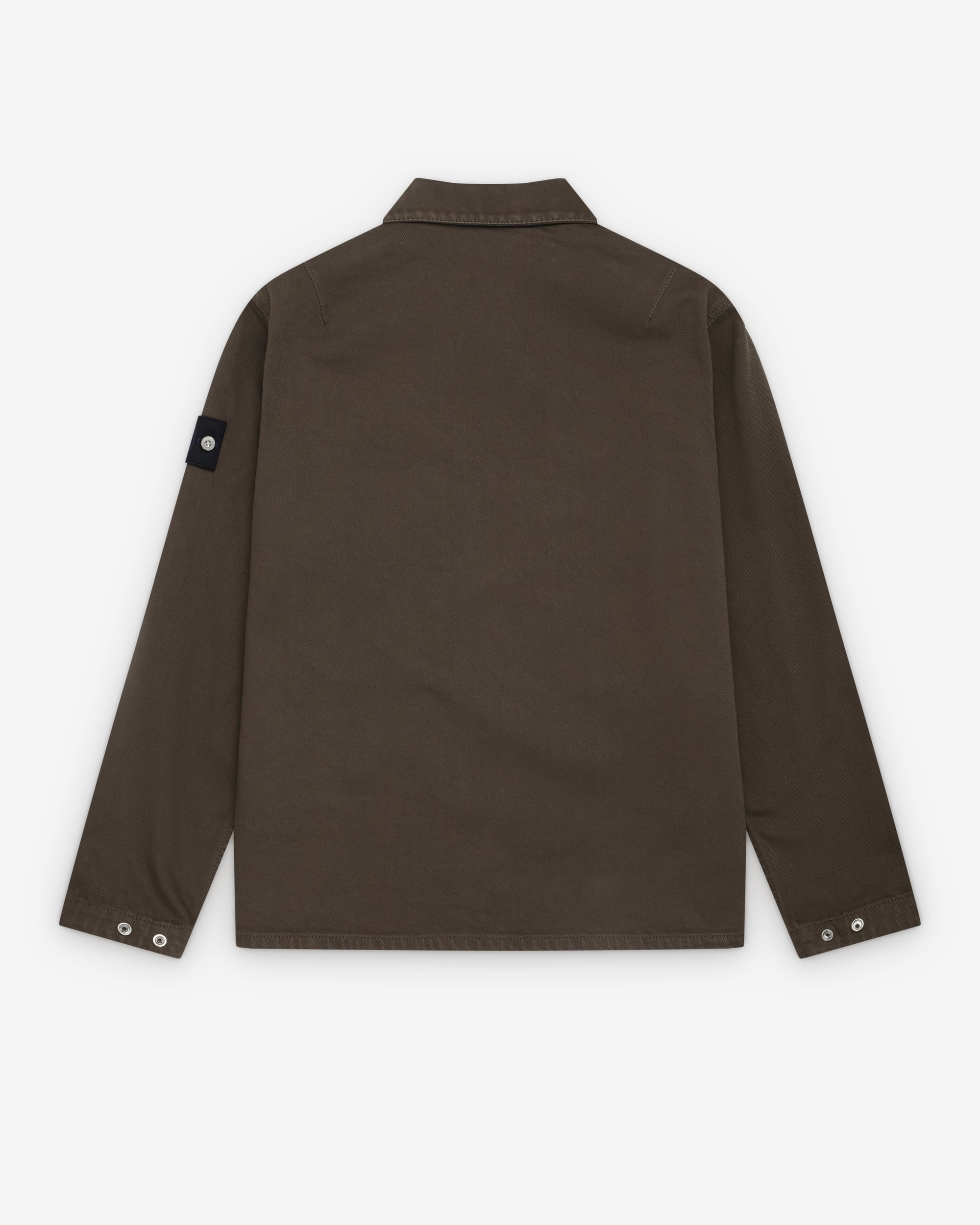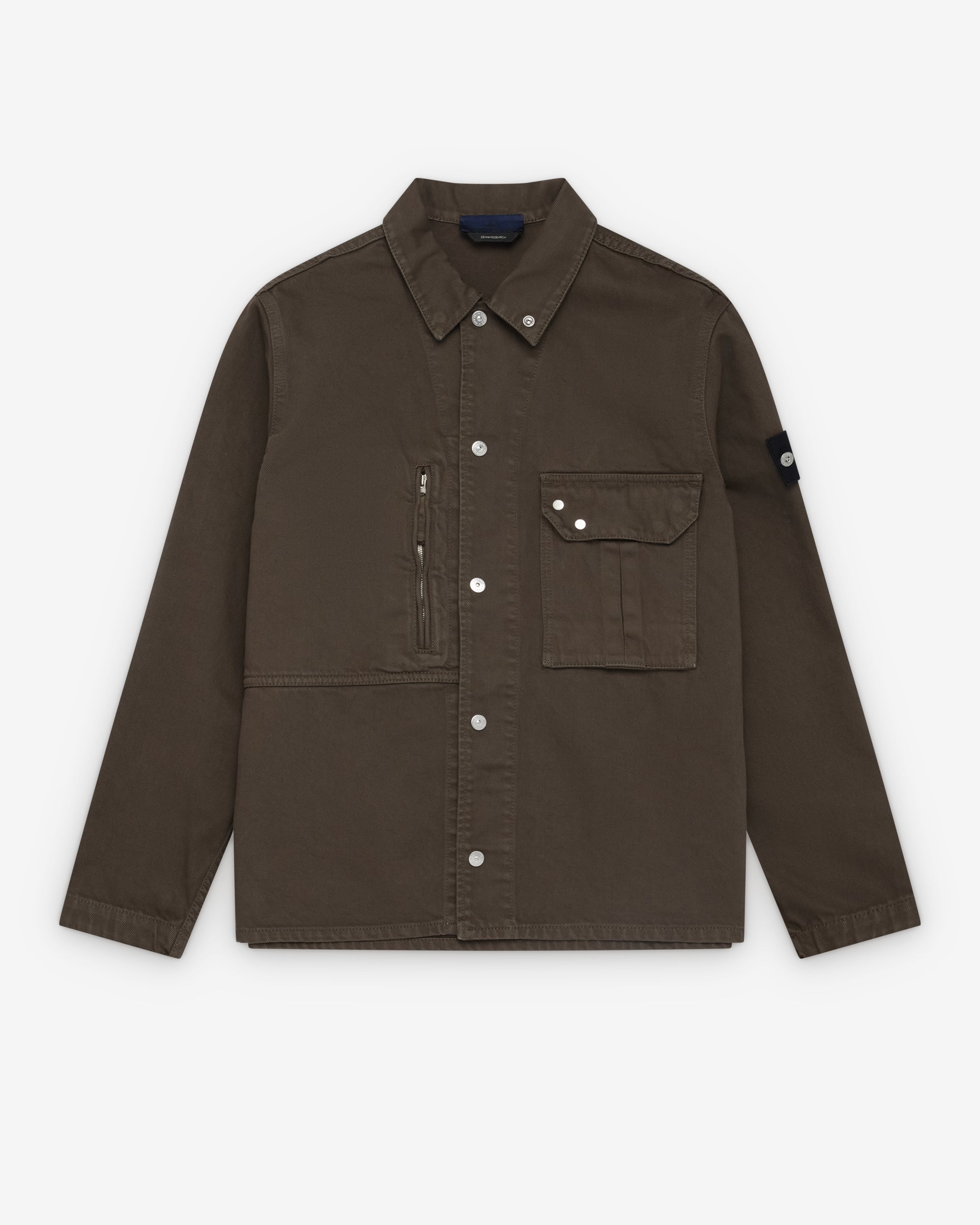 Classic adjustable collar Front press stud button placketZip and flap close chest pocketsDenim research Stone Island badge at sleeveGarment dyed denim fabric