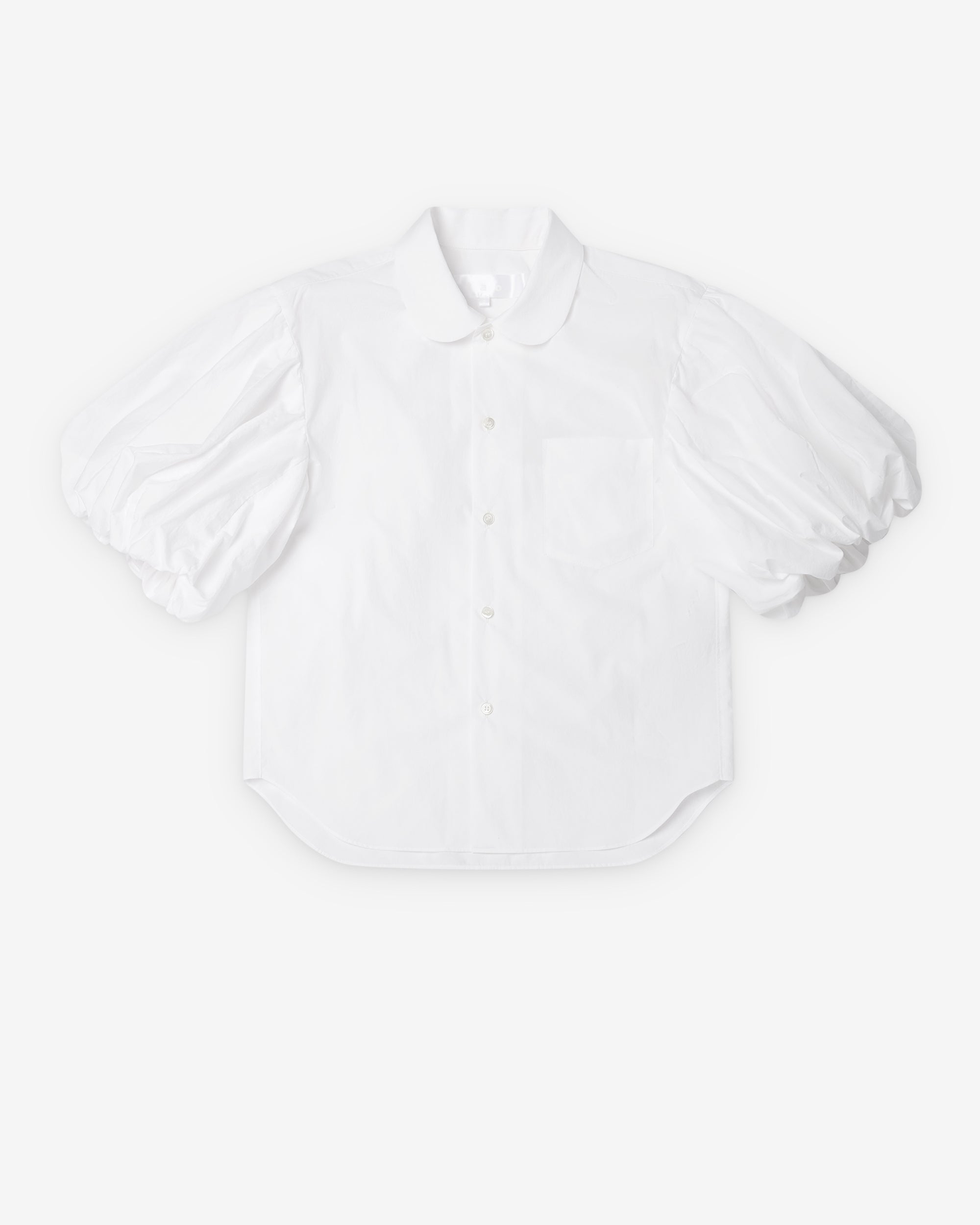 Peter pan collarButton front closureRuffled, short sleevesChest patch pocket100% CottonMade in Japan