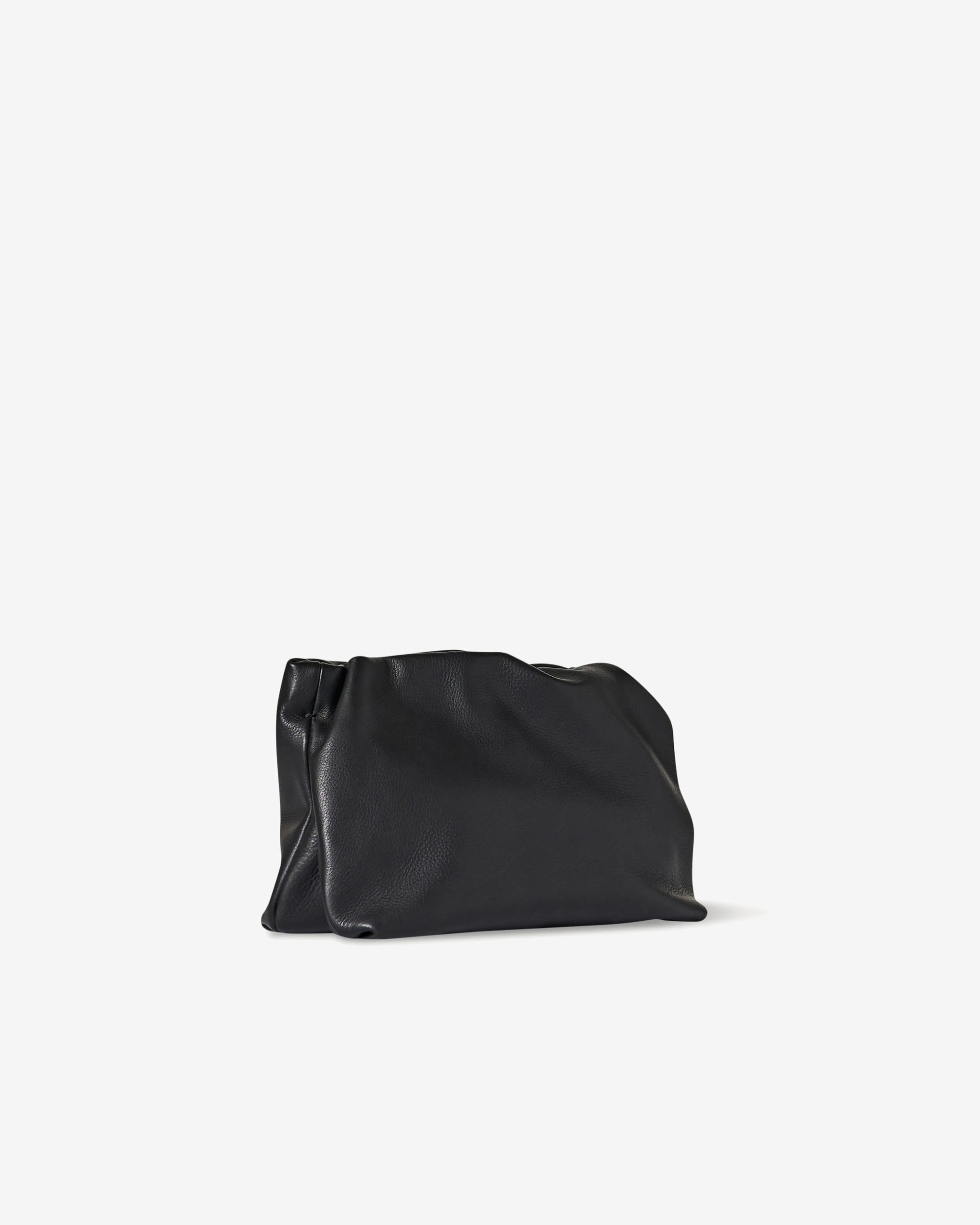 Ruched clutch in finely grained calfskin leather with hidden adjustable shoulder strap and hinged frame closure