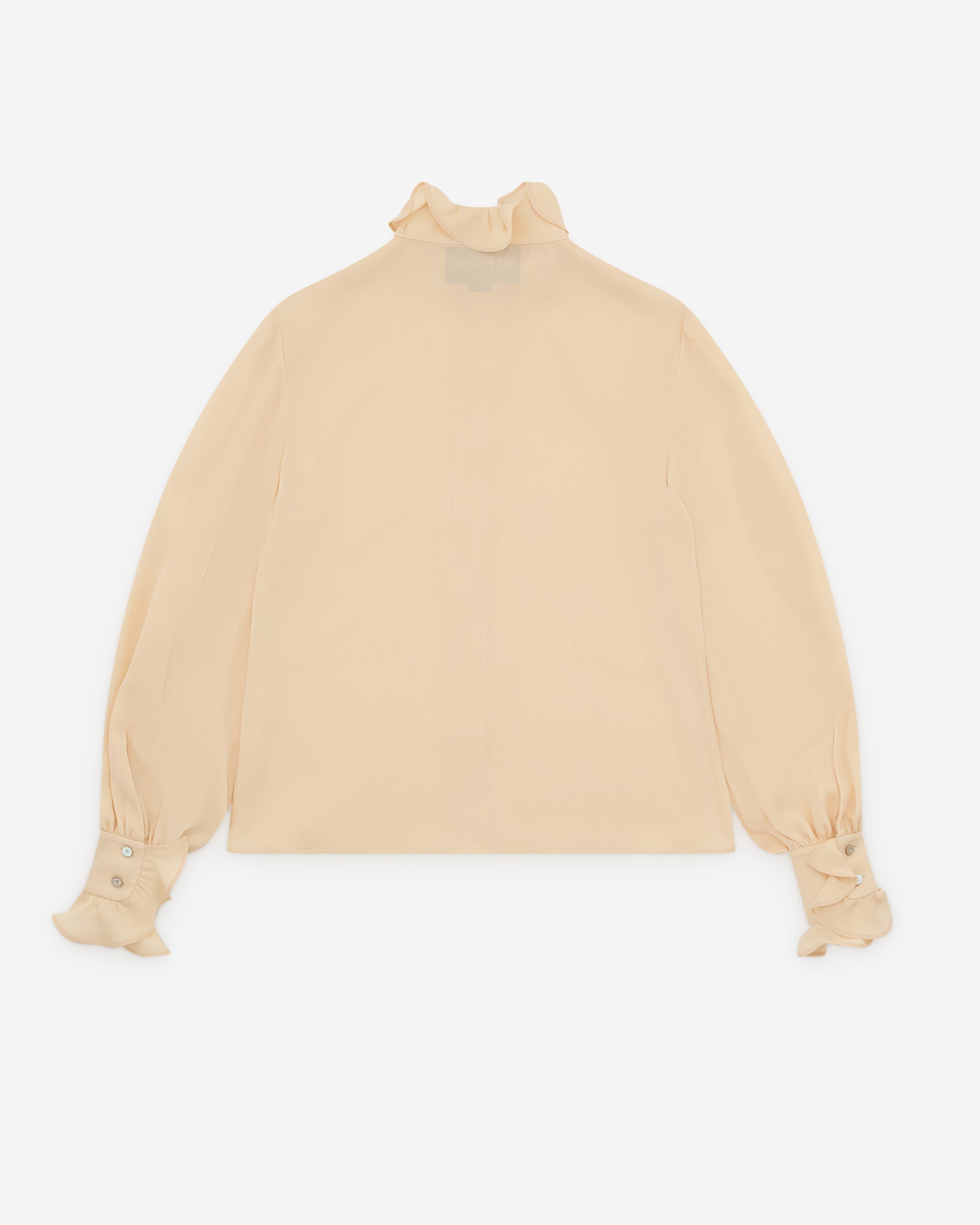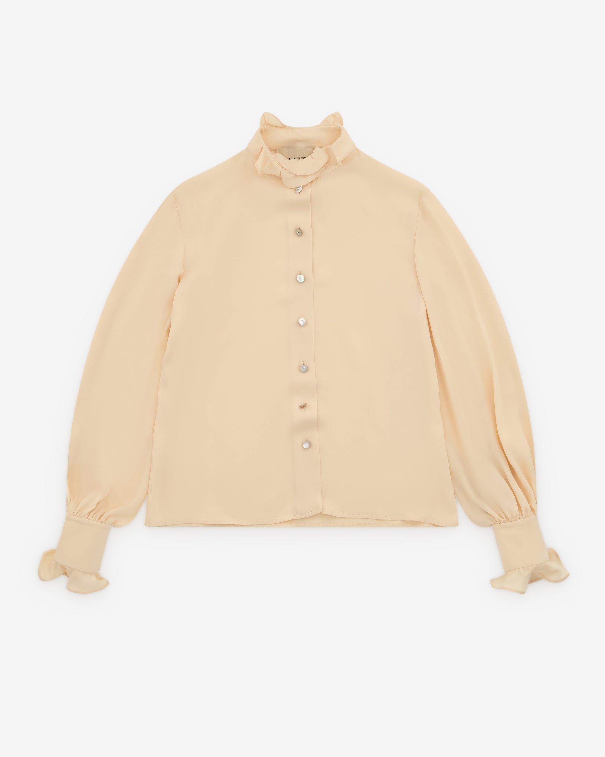 Ruffle detail on collar and cuffsFront button closureLong sleevesFlowy silk fabric