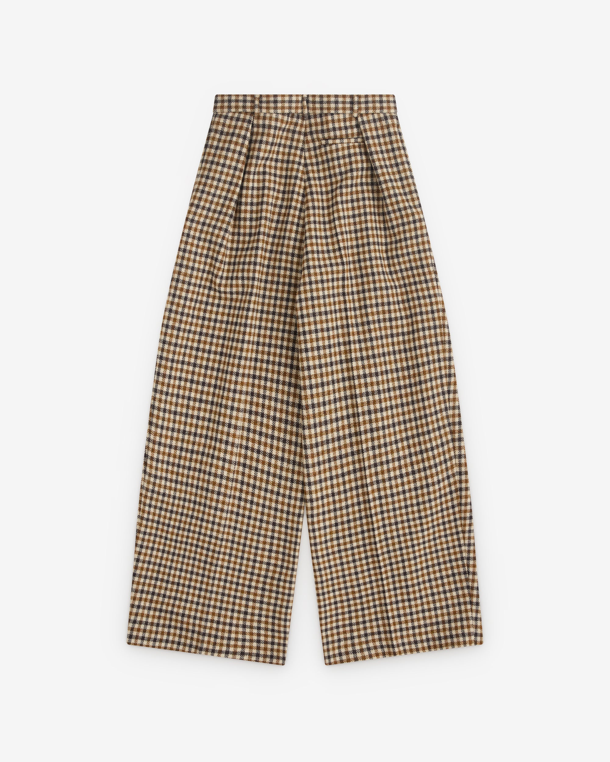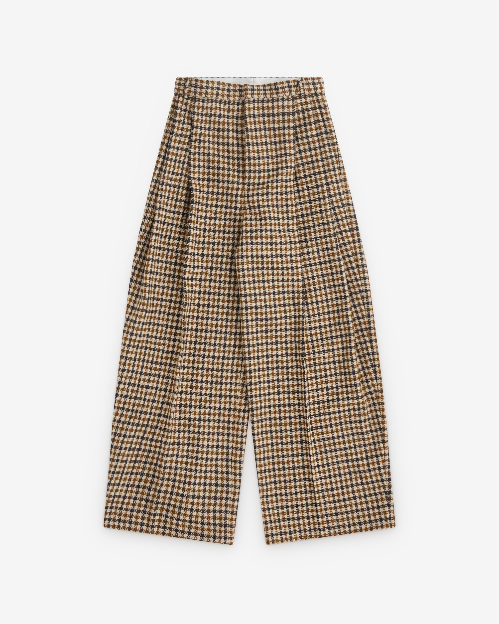 Wool houndstooth checkHook and eye waist closureZip flySide seam pocketsPleated front and backLoose fit