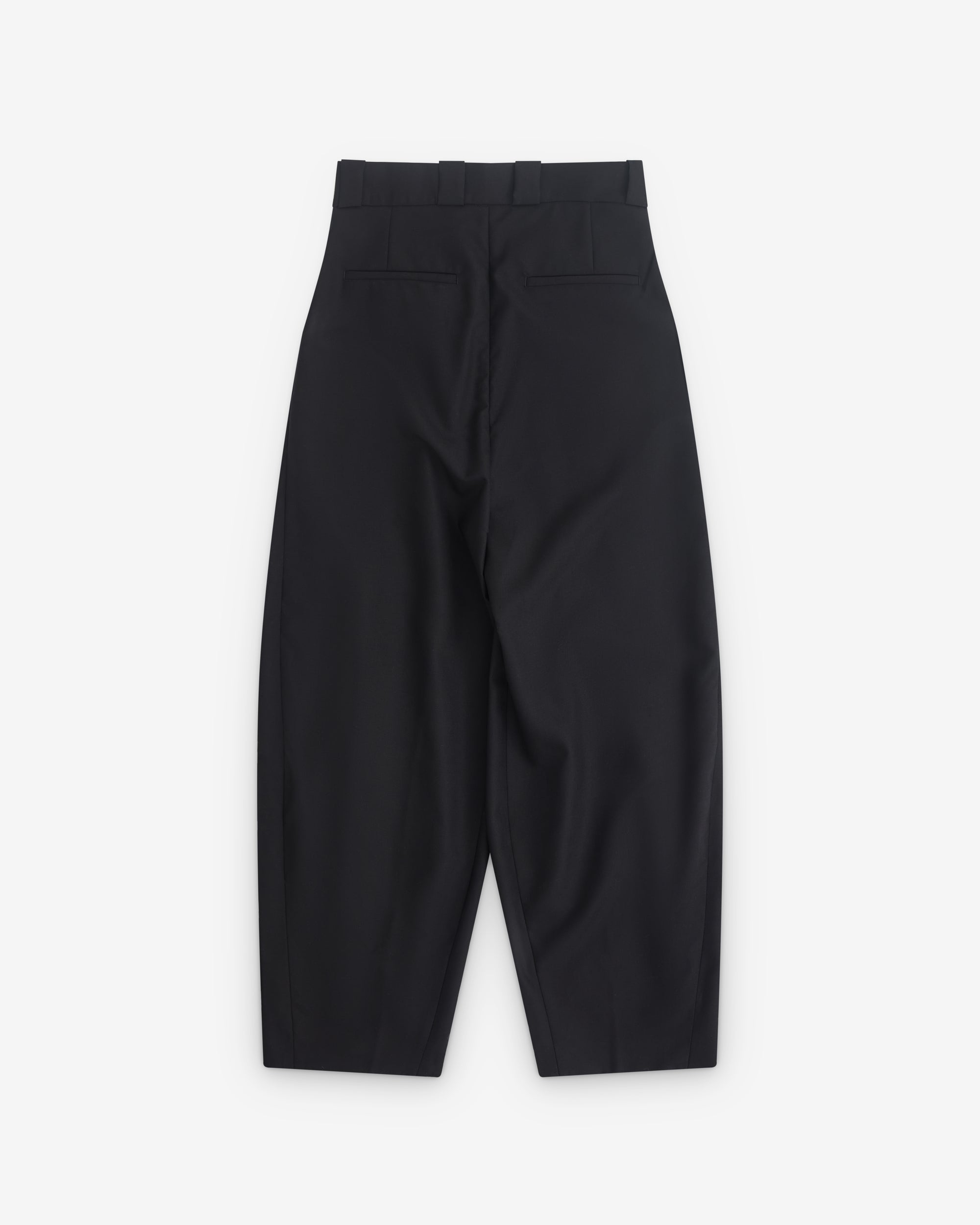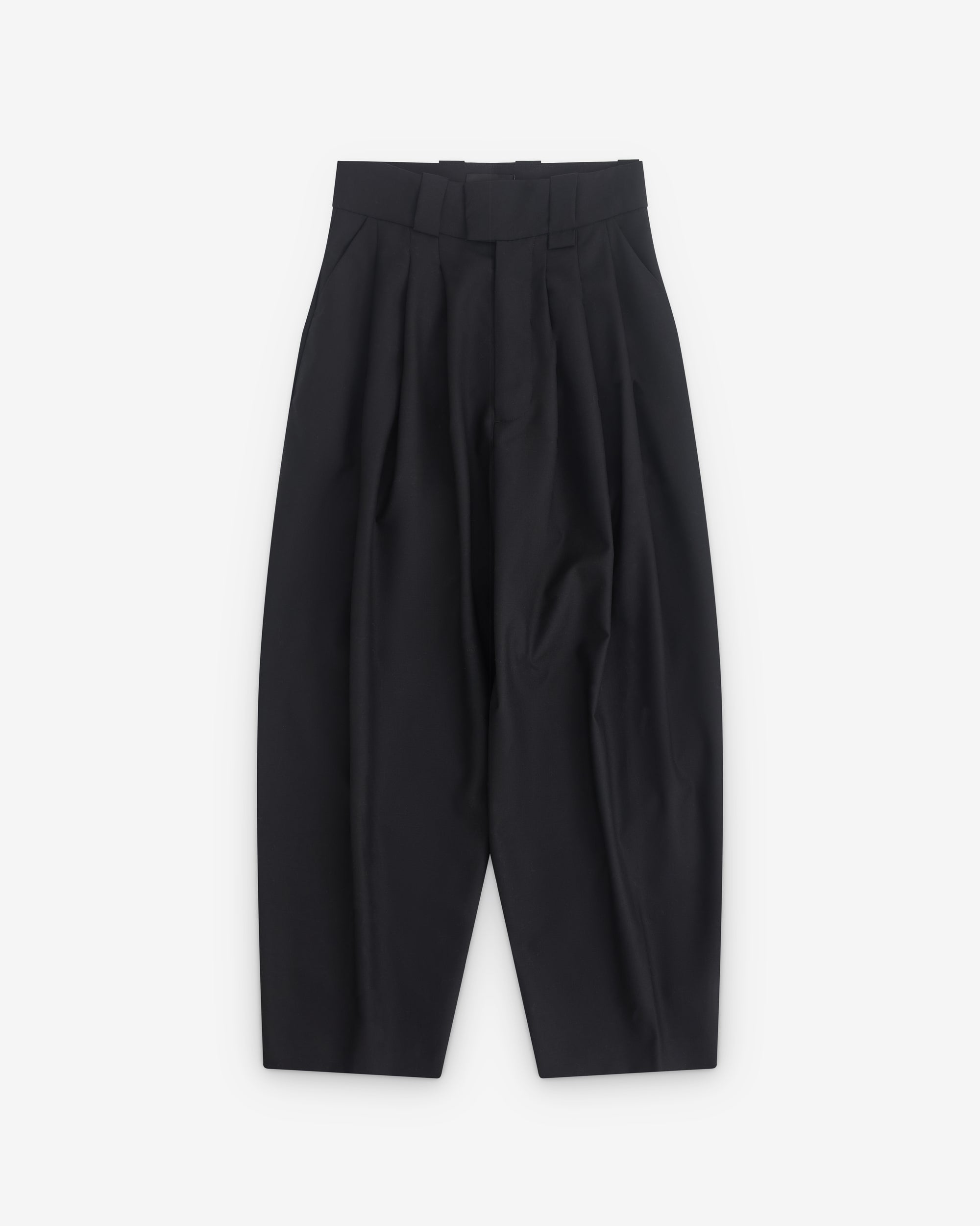 Loose fitDouble pleated frontHook and eye waist closureSide seam slip pocketsDrawstring at waistZip flyTwo rear pockets