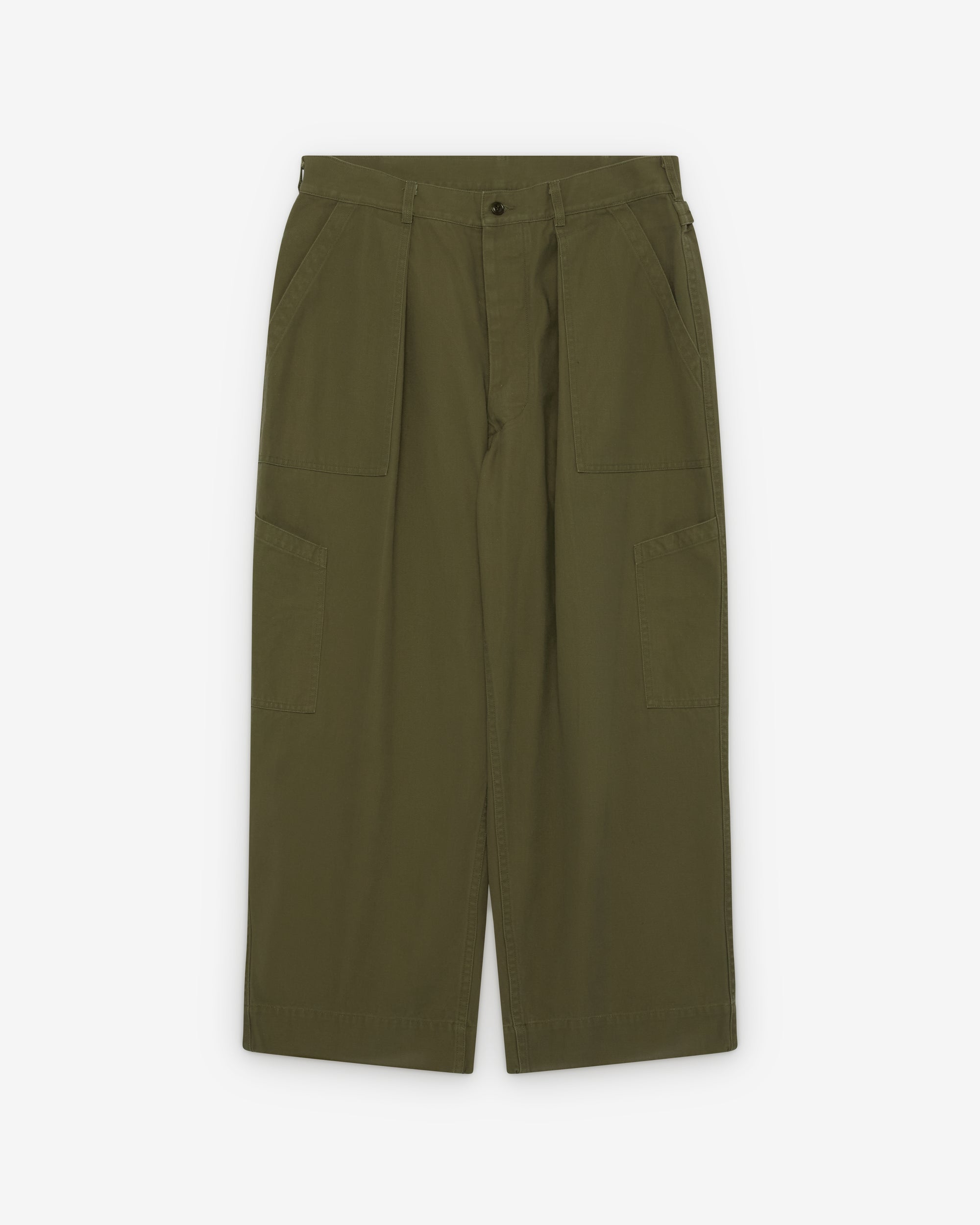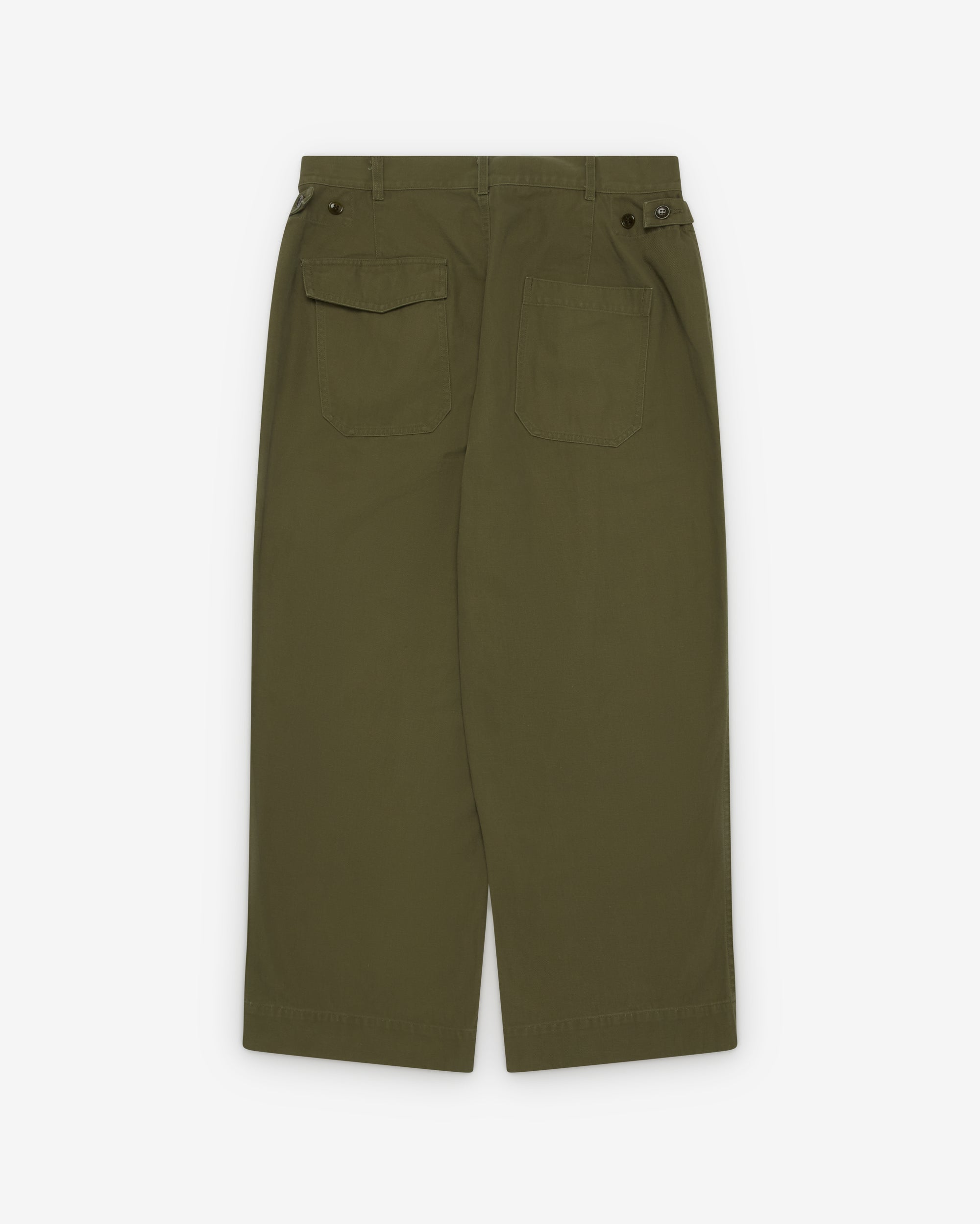 Button waist, zip flyFront fatigue pocketsPleated frontTwo leg pocketsAdjustable button tabs at backTwo rear pocketsWide leg
