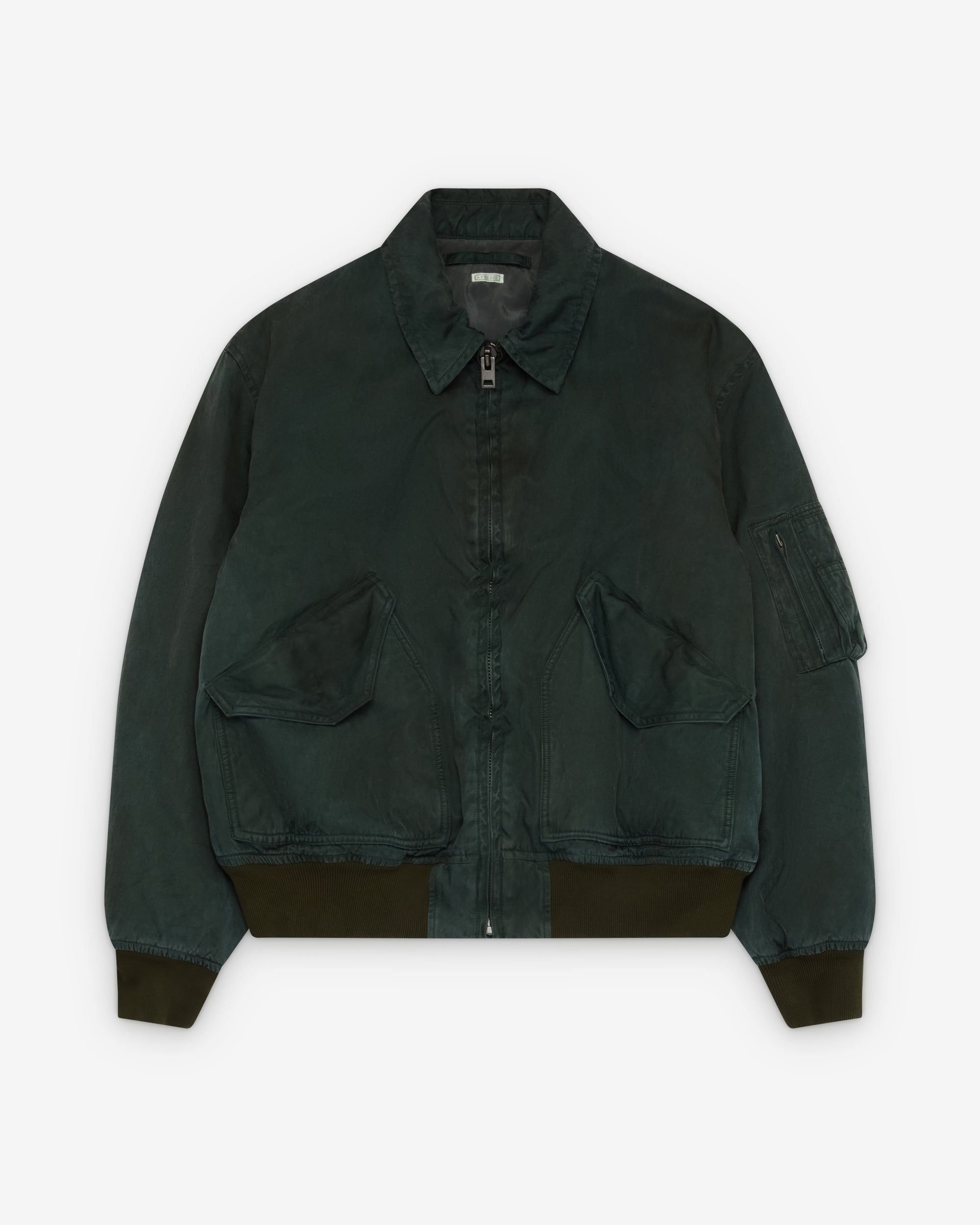 Classic collarFront zip closureFront flap close pocketsRibbed cuffs and hemSilk and nylon internal lining Zip arm pocket