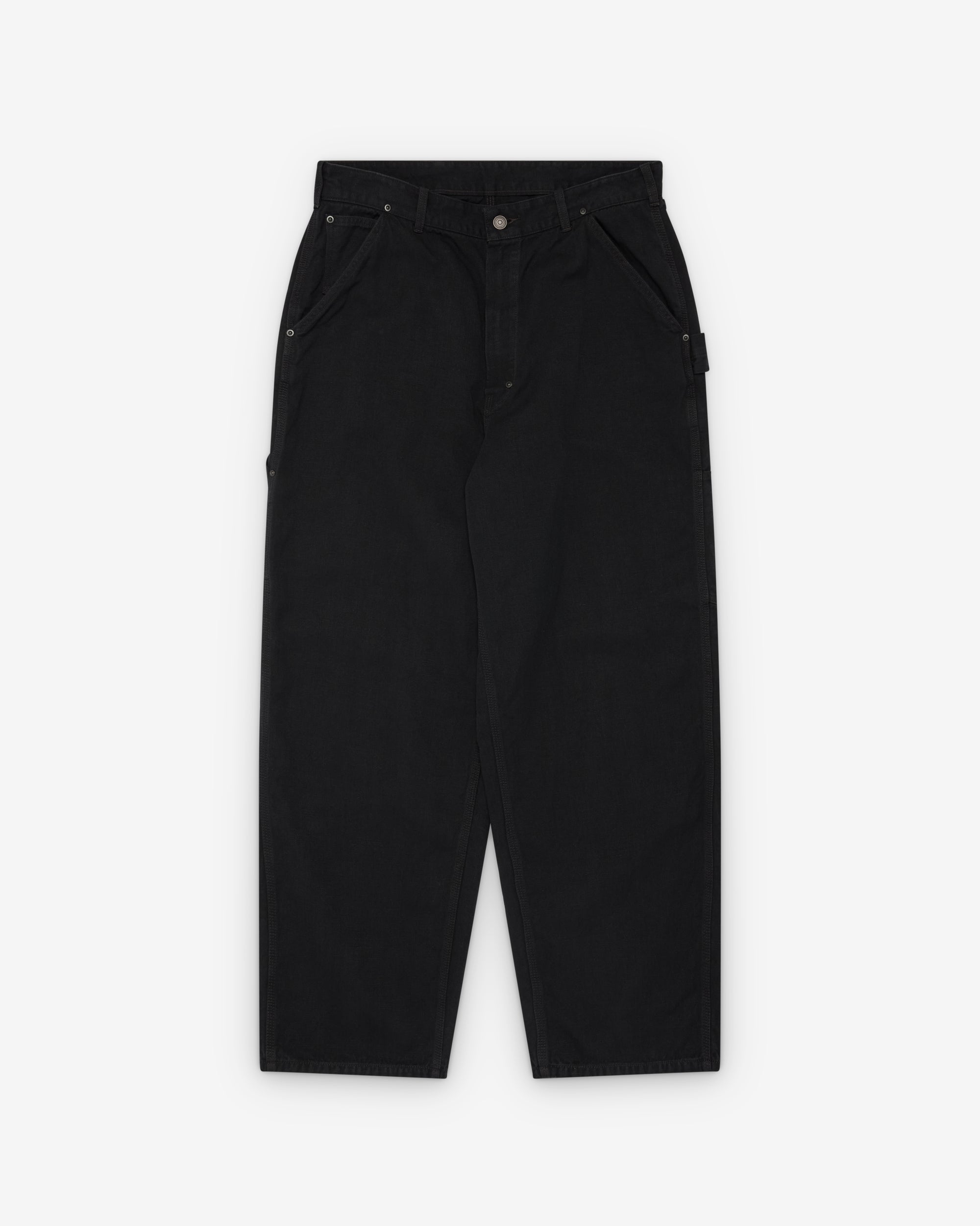 Loose fitButton waist, zip flyMetal rivet detailingFront pocketsTwo back pocketsLeg pocket and hammer loop