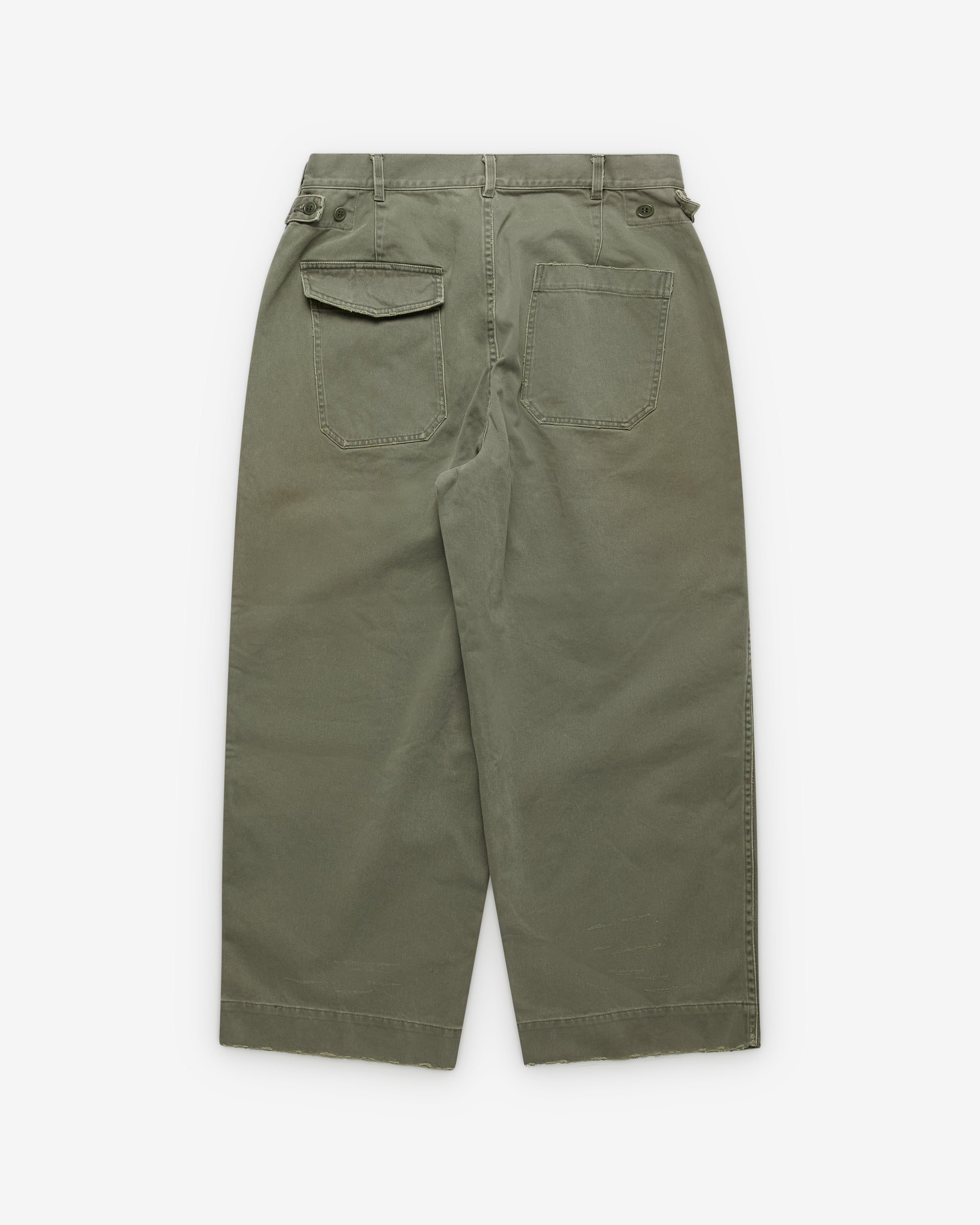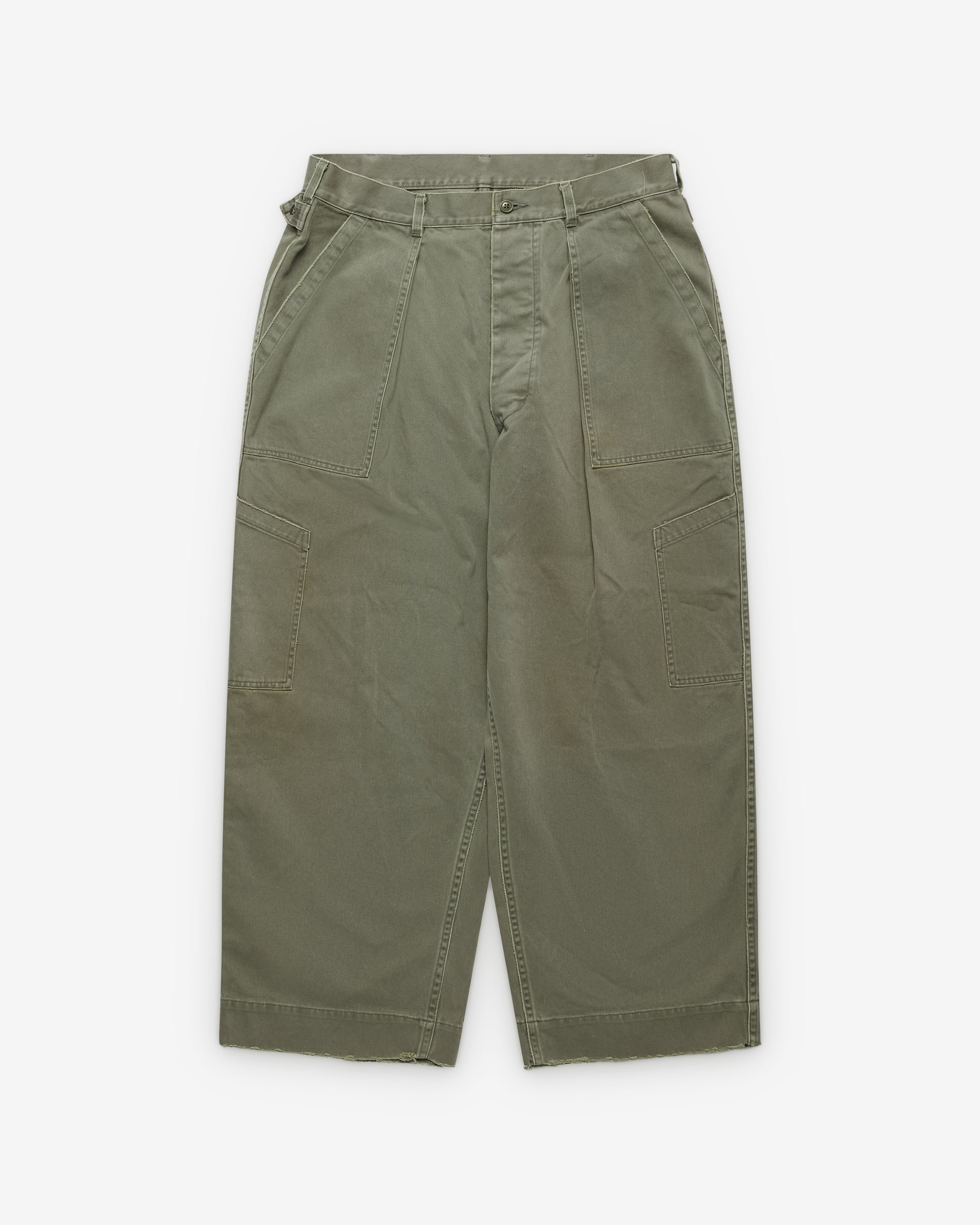 Wide silhouetteFrom pleatsUtility patch pocketsBelt loopsDistressed to replicate vintage wear100% CottonMade in Japan