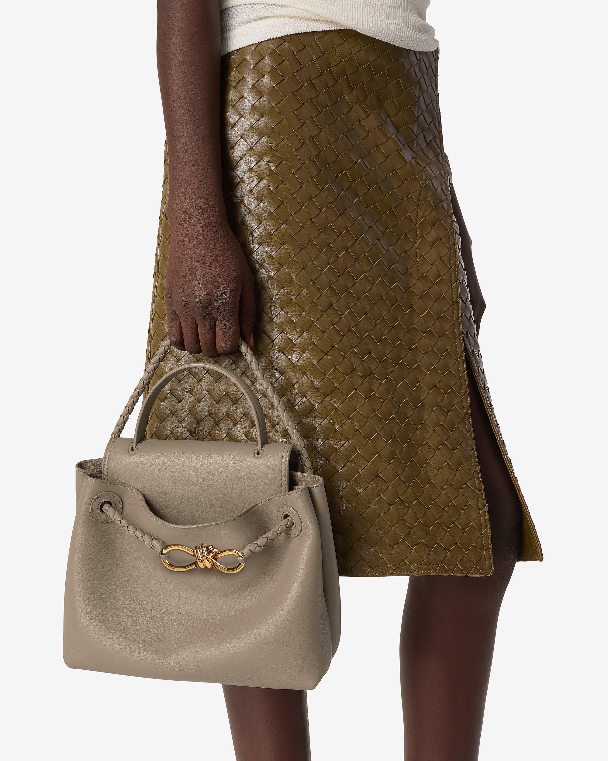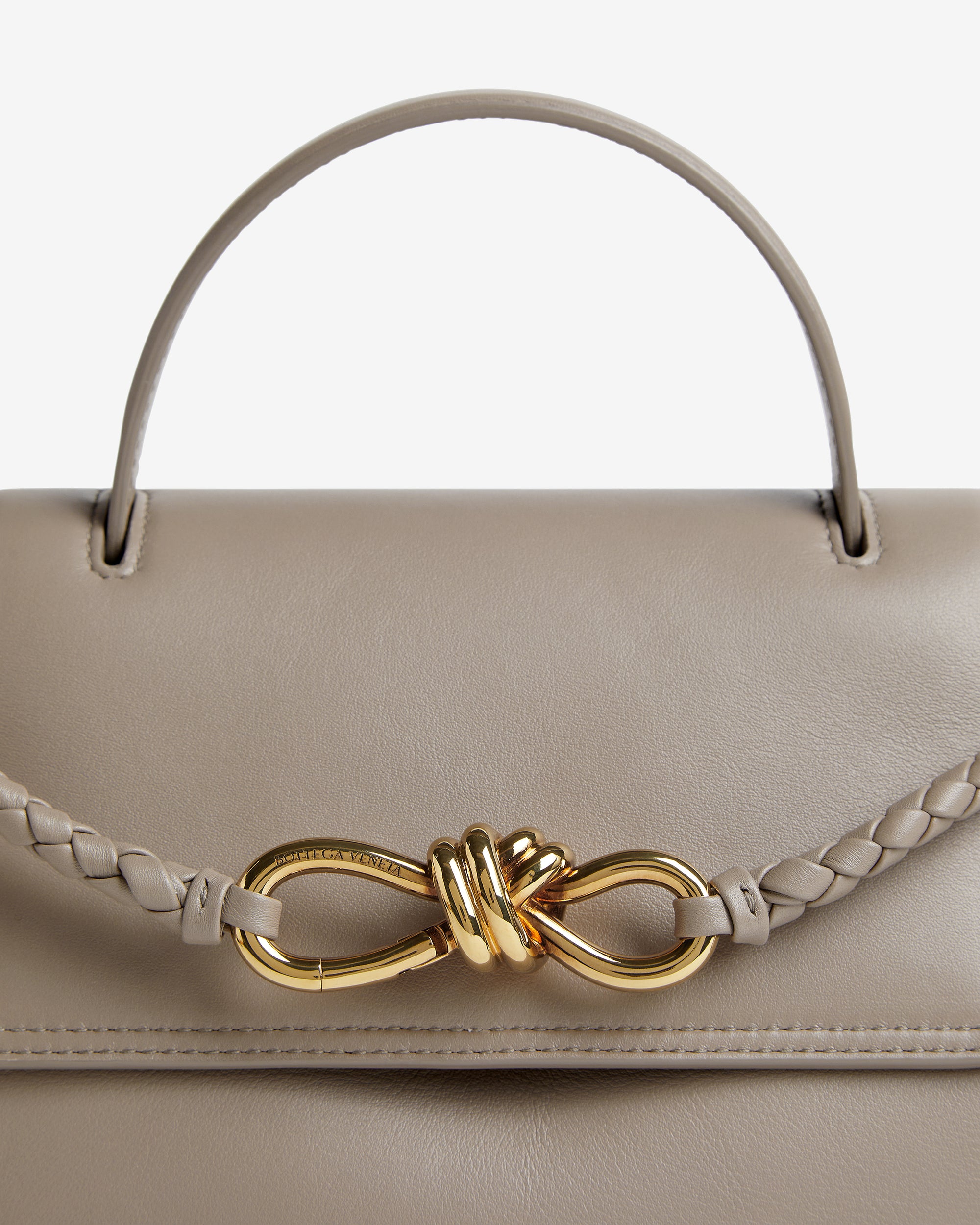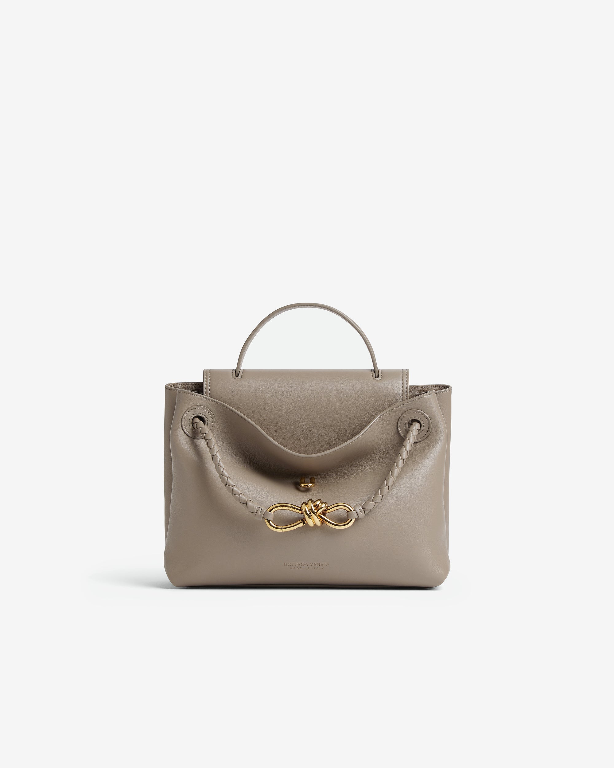 Top handle bag in silky calf leather with two-way flap and signature knot detail. Features a hidden hook closure, allowing the flap to be closed in the front or attached to the interior Intrecciato pocket.