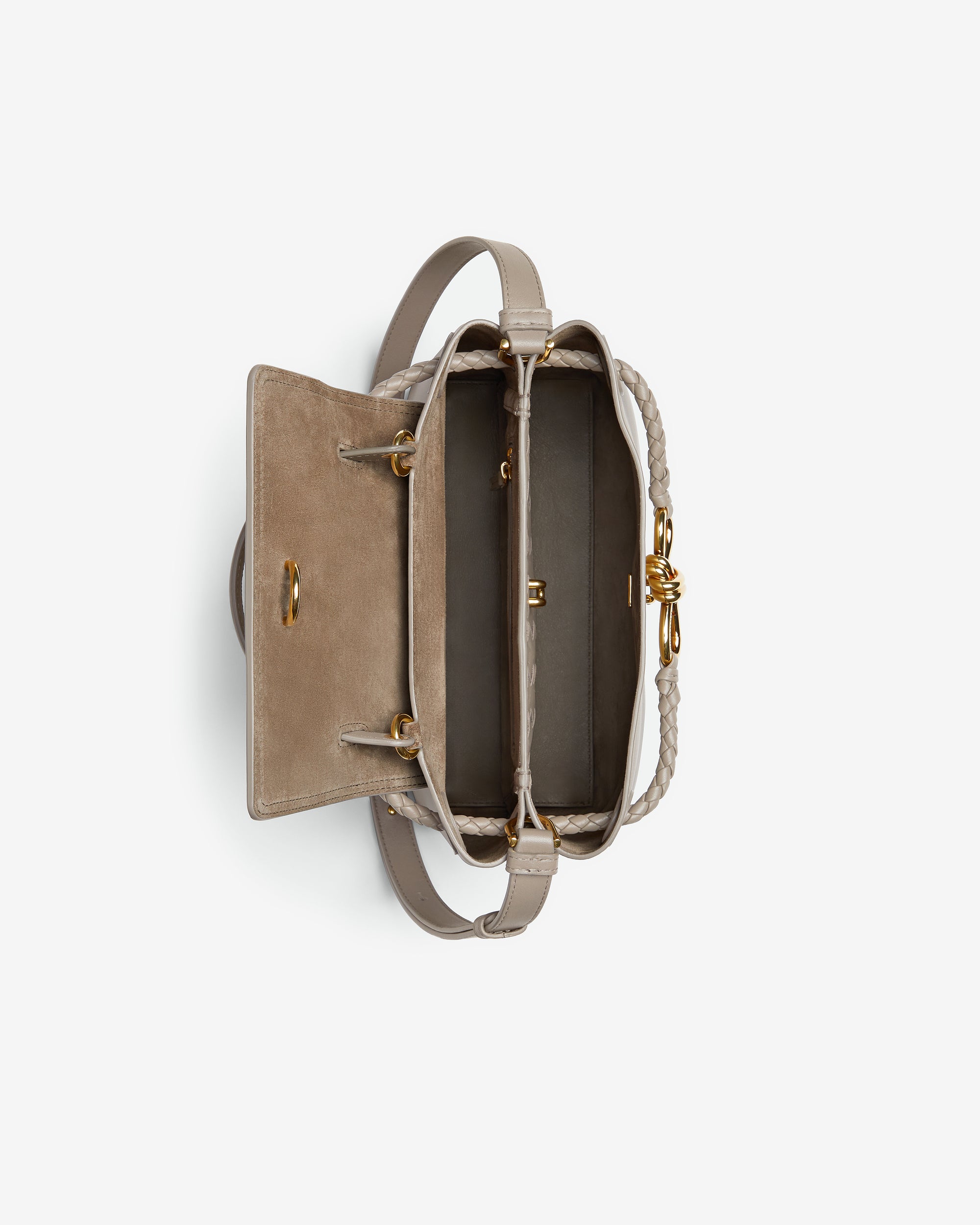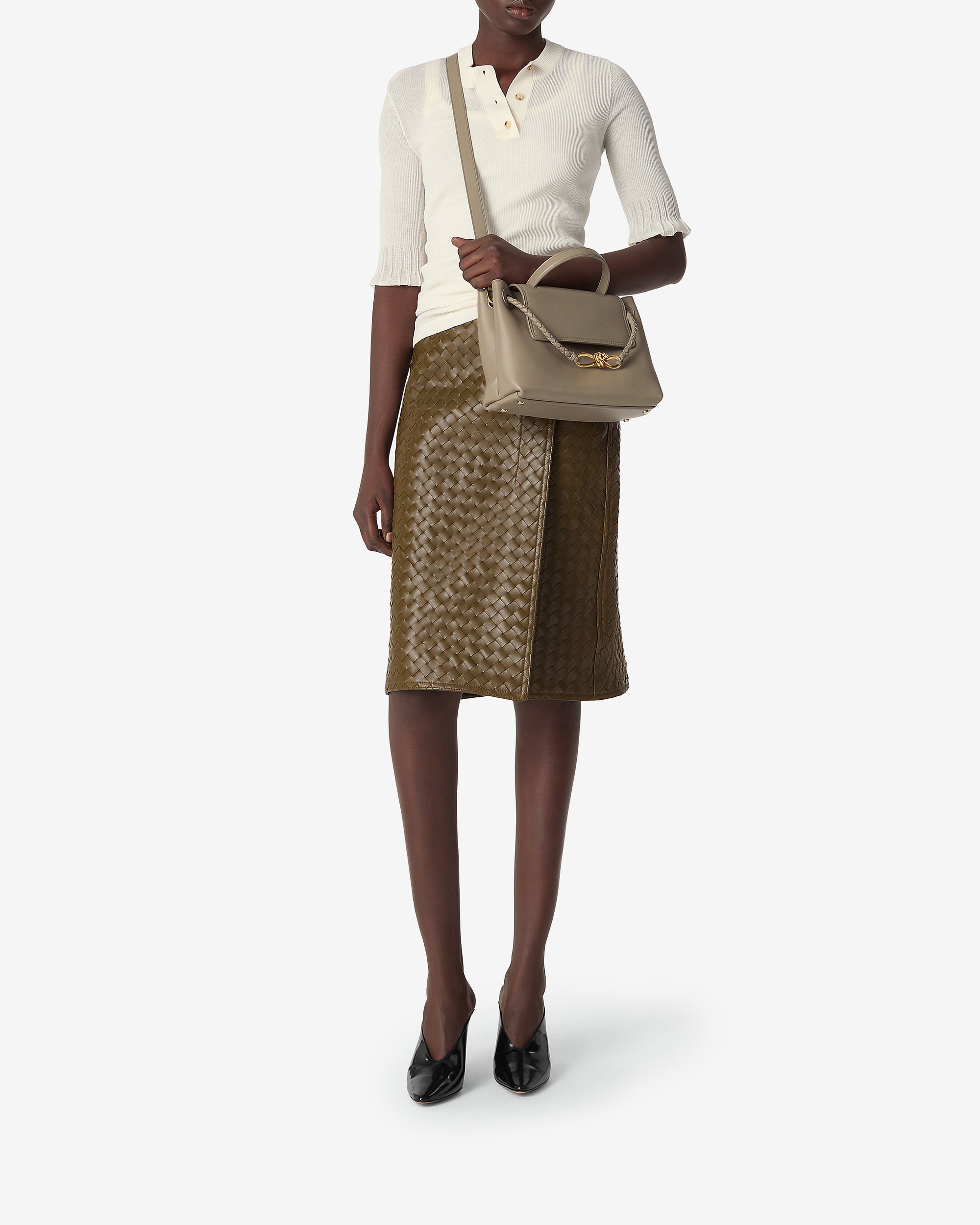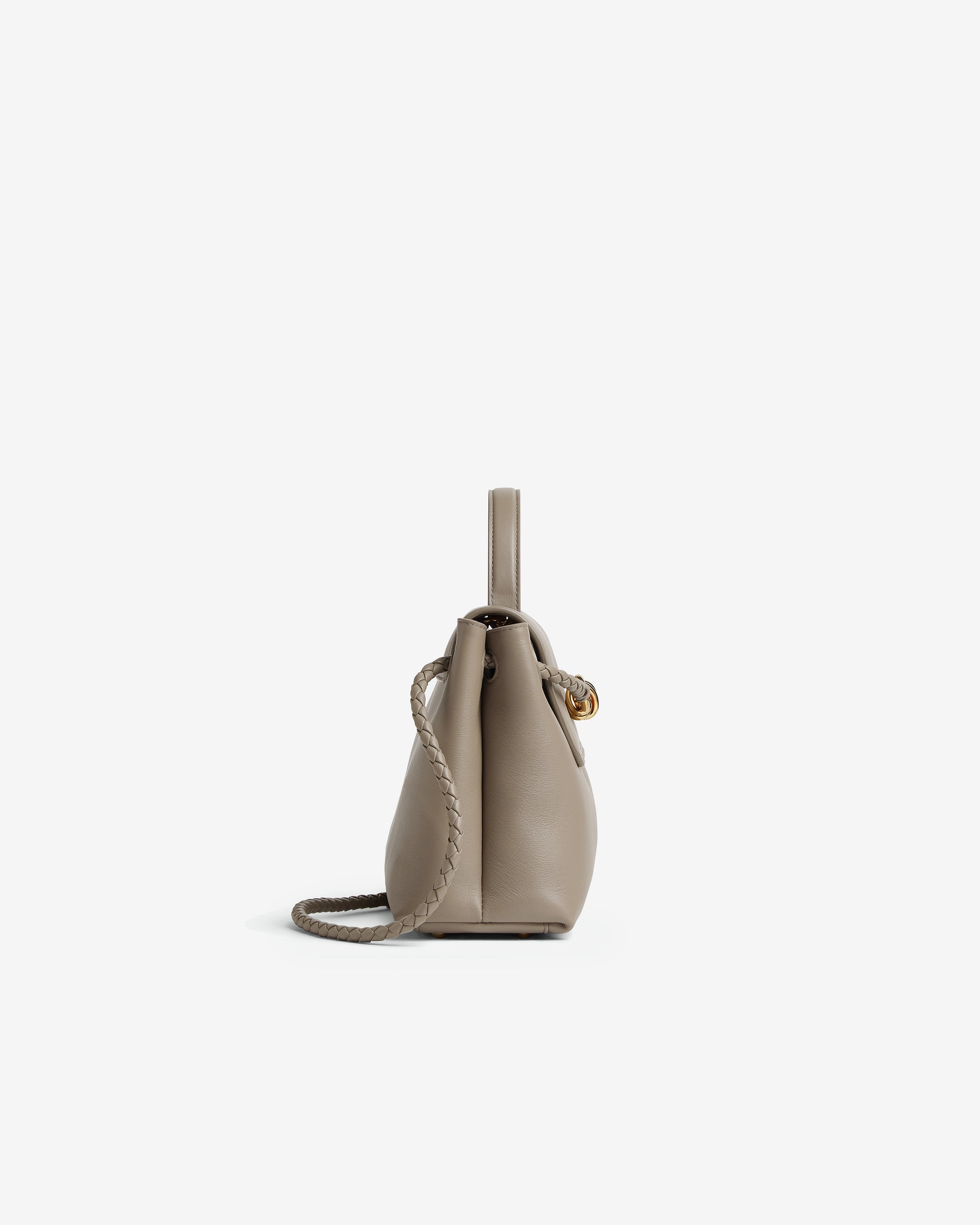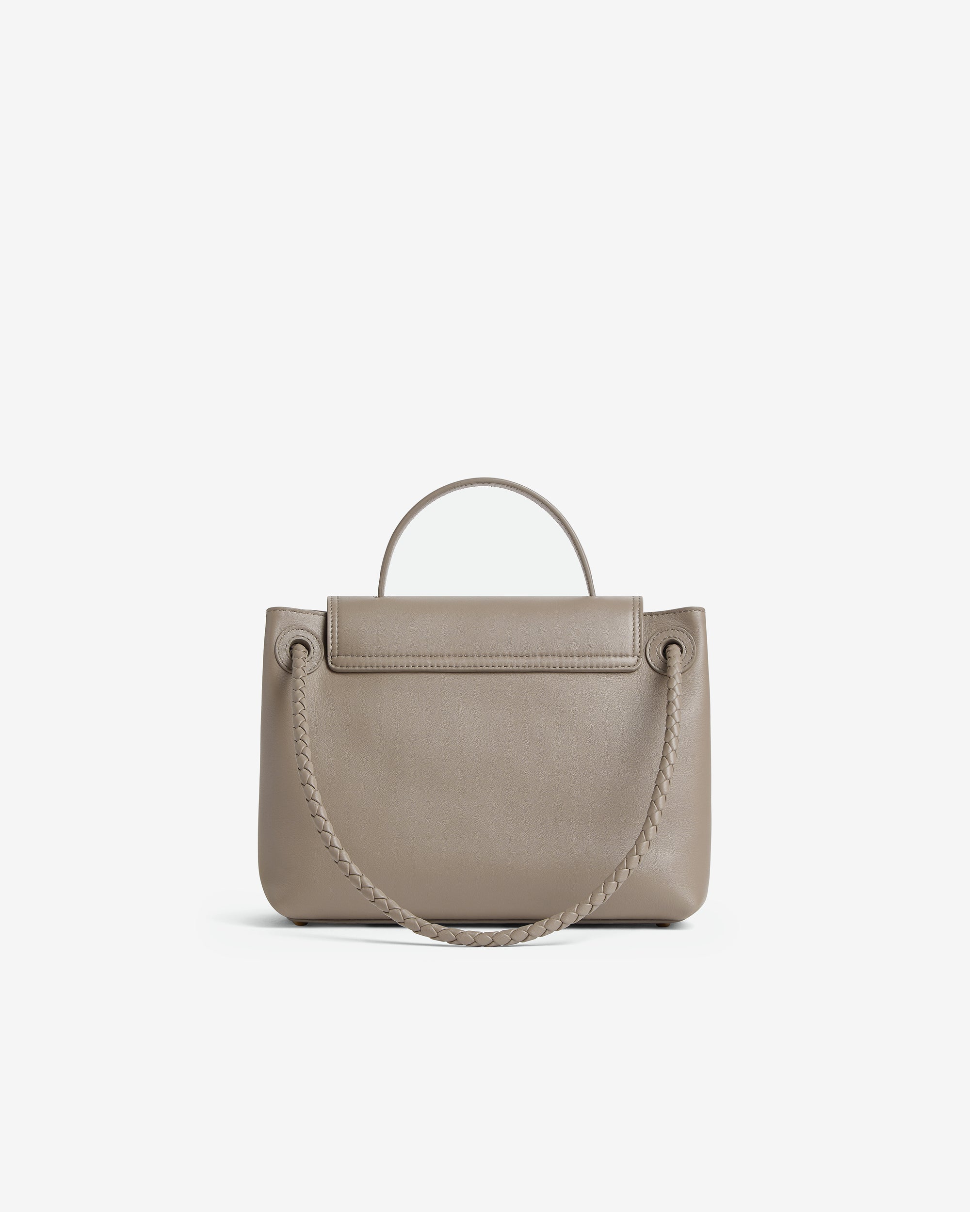 Top handle bag in silky calf leather with two-way flap and signature knot detail. Features a hidden hook closure, allowing the flap to be closed in the front or attached to the interior Intrecciato pocket.