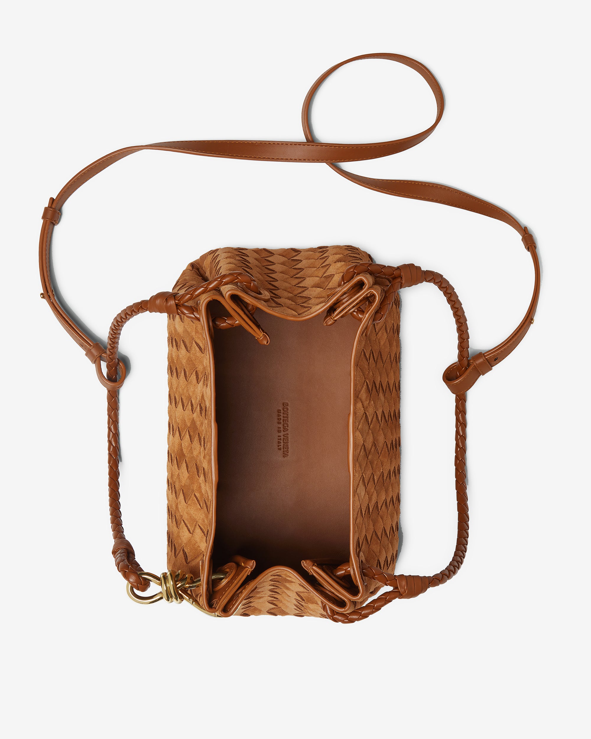 Shoulder bag in supple Intrecciato suede with signature knot detail and detachable cross-body strap.