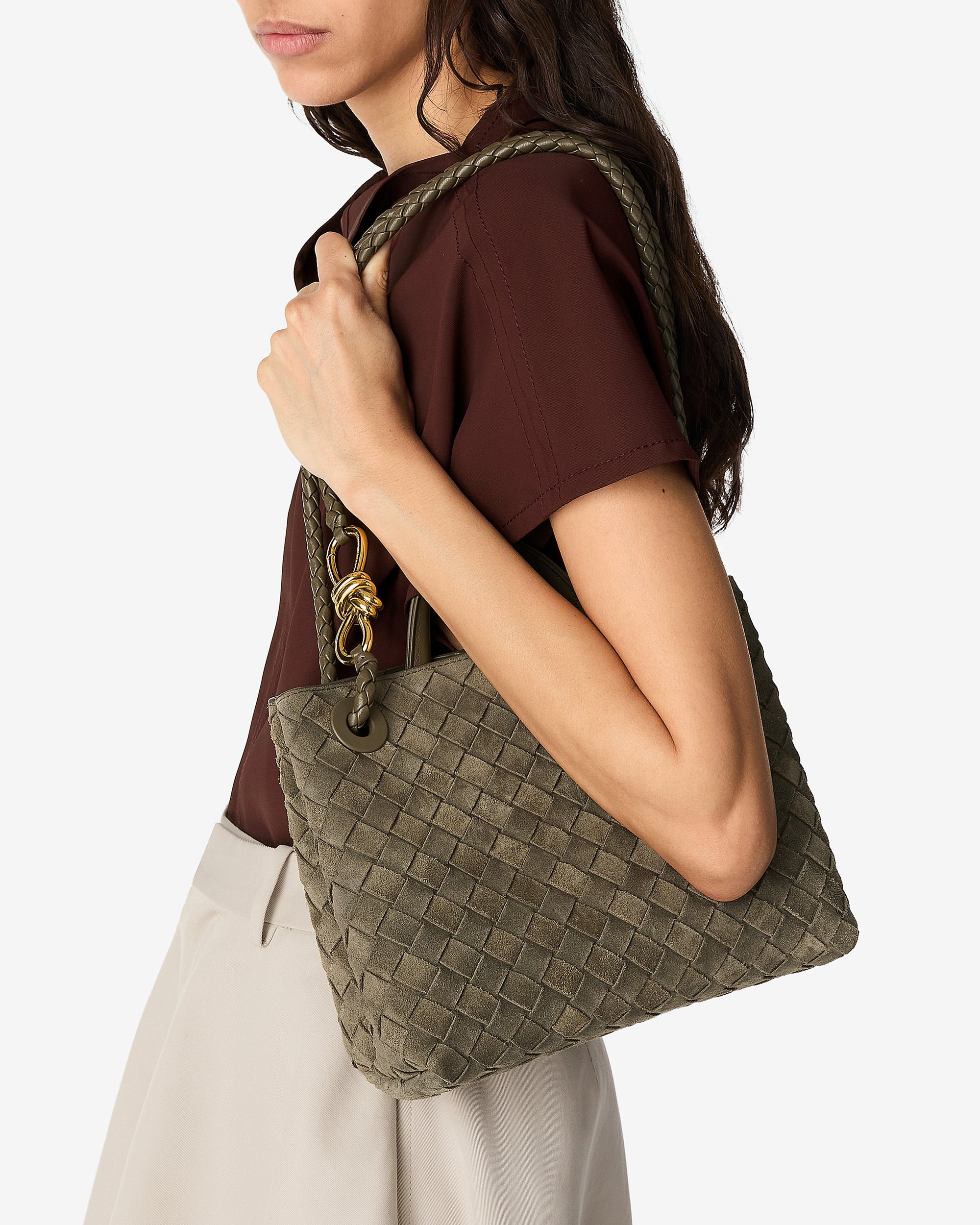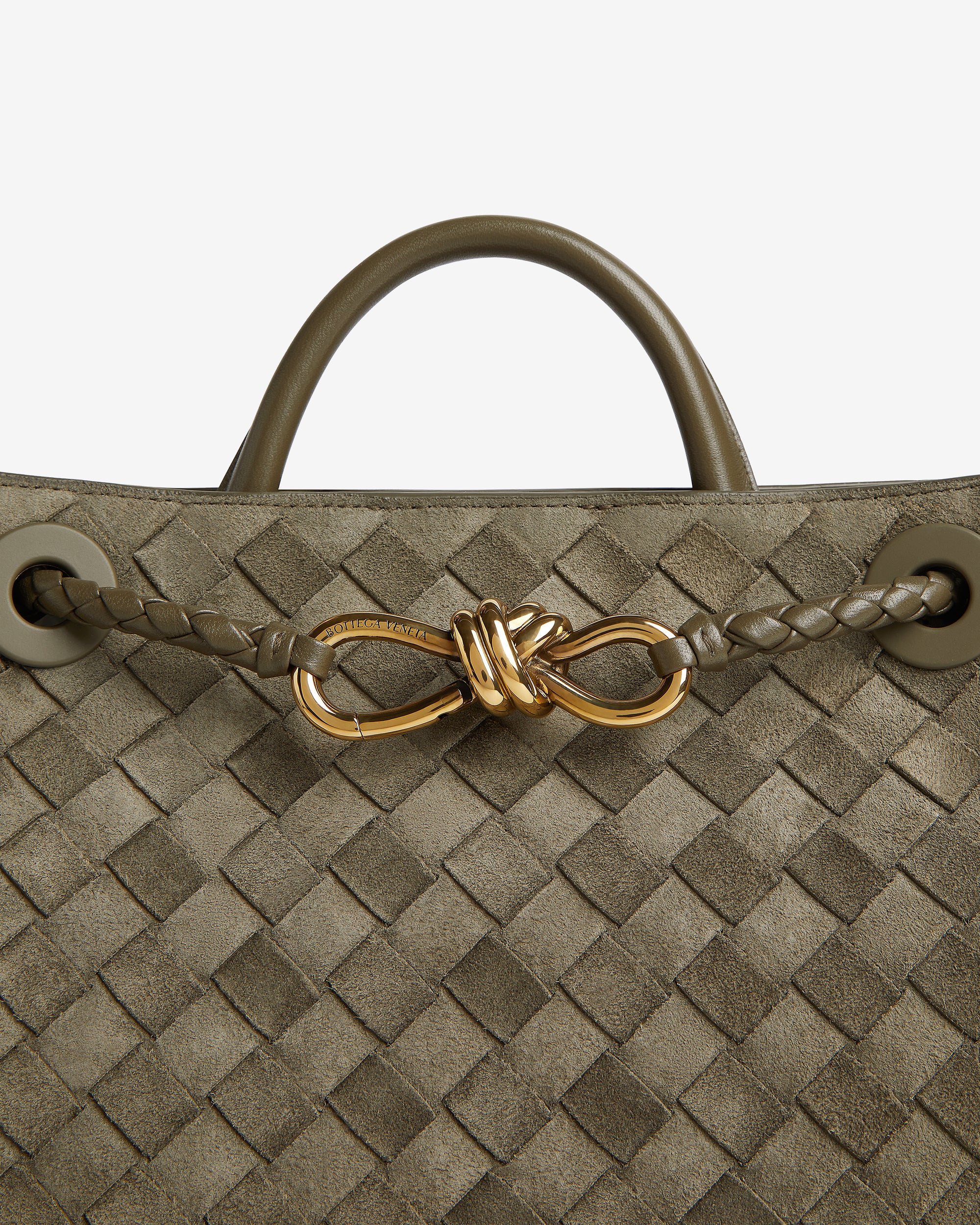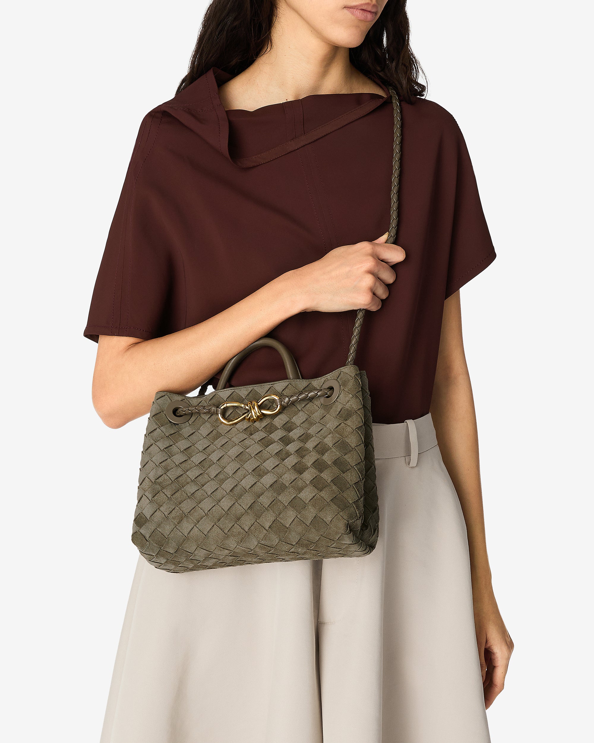 Top handle bag in Intrecciato suede with signature knot detail and sliding cross-body strap.