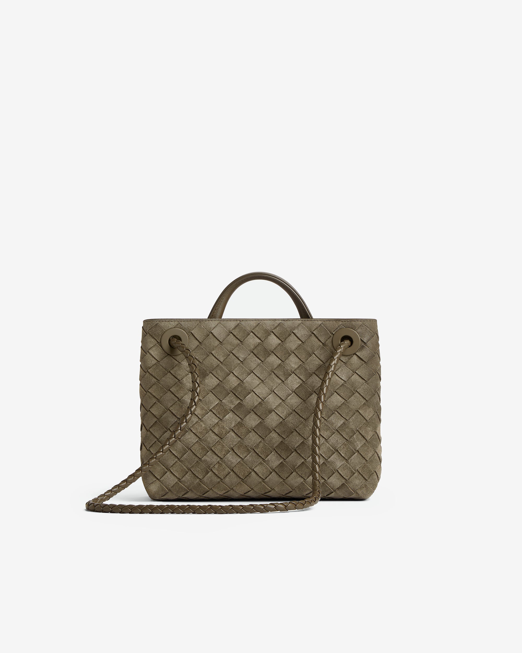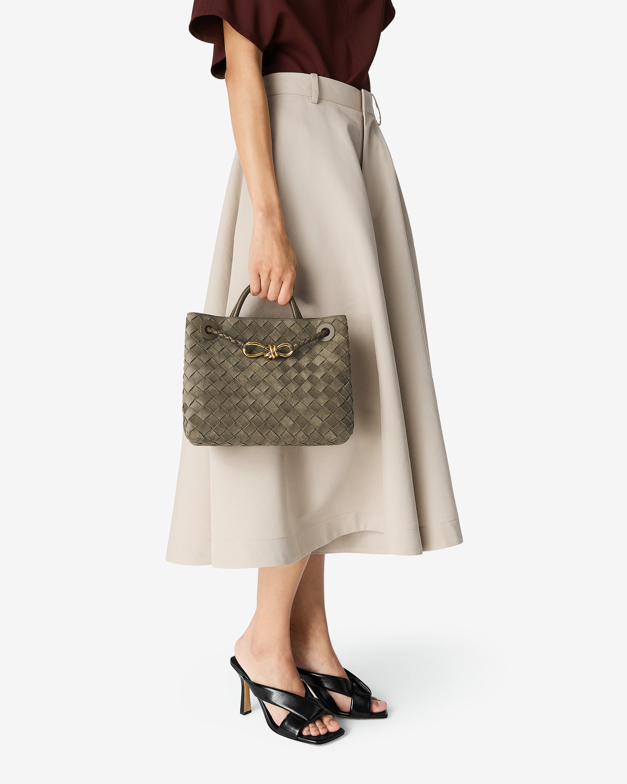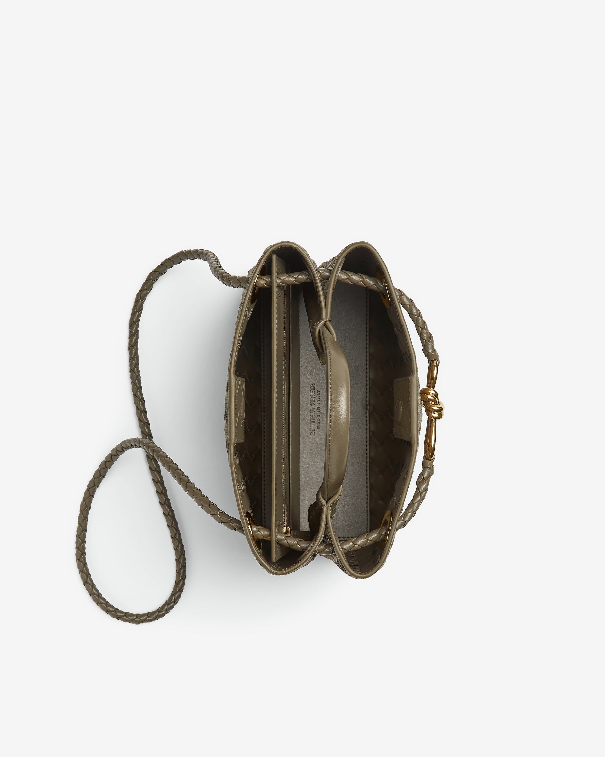 Top handle bag in Intrecciato suede with signature knot detail and sliding cross-body strap.