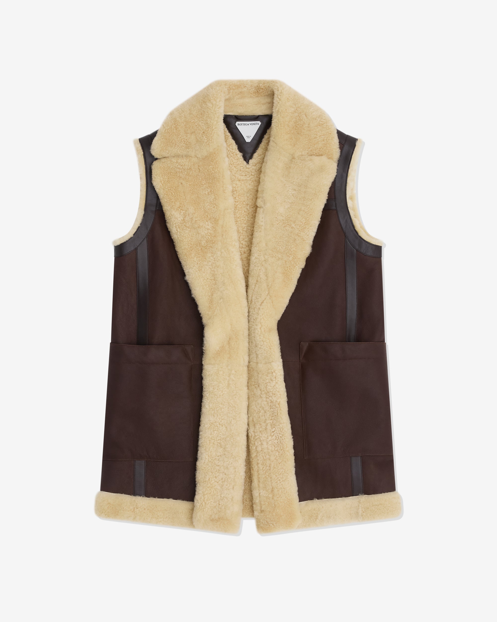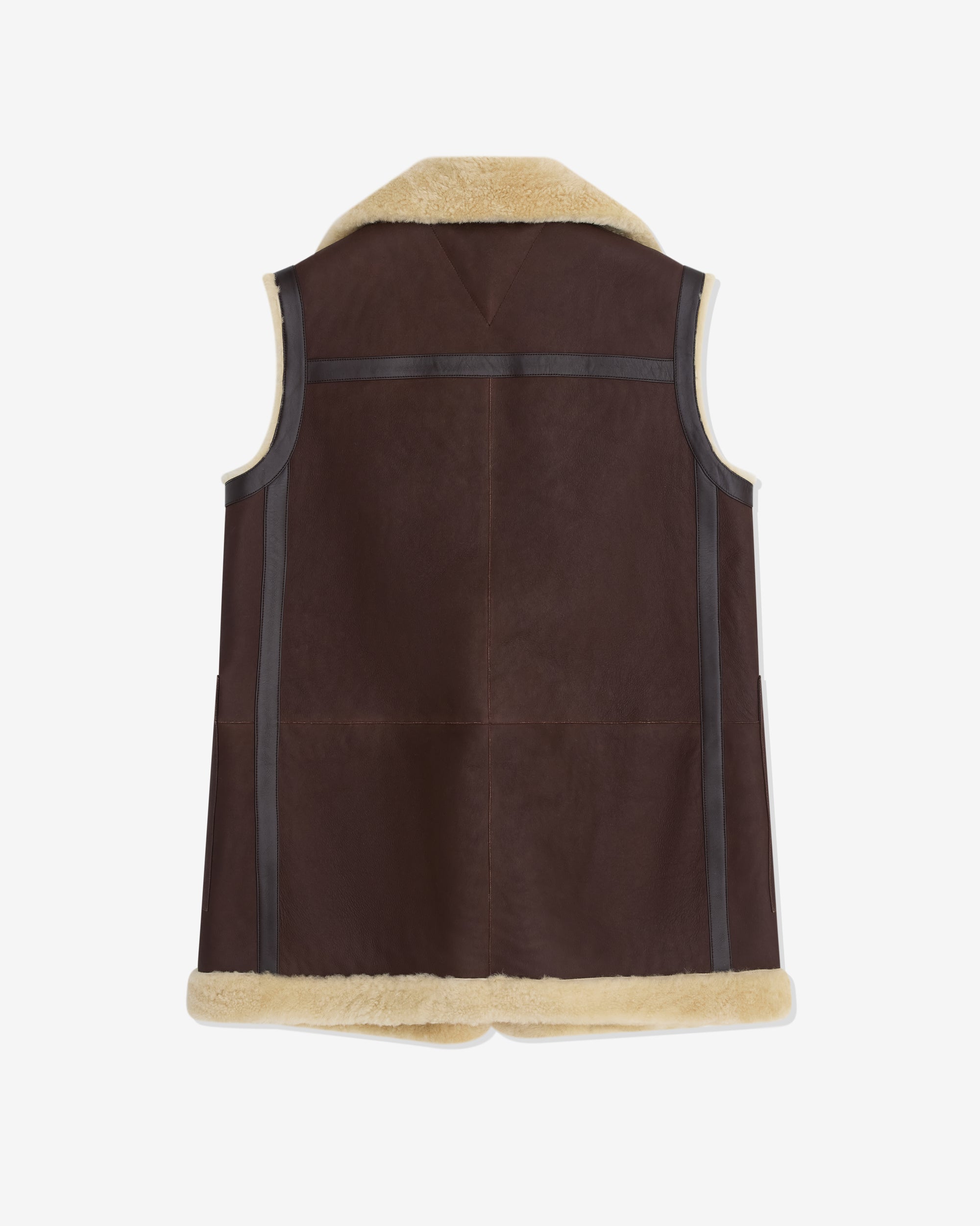 Gilet in soft shearling and leather with crackled effect, featuring a tie closure.