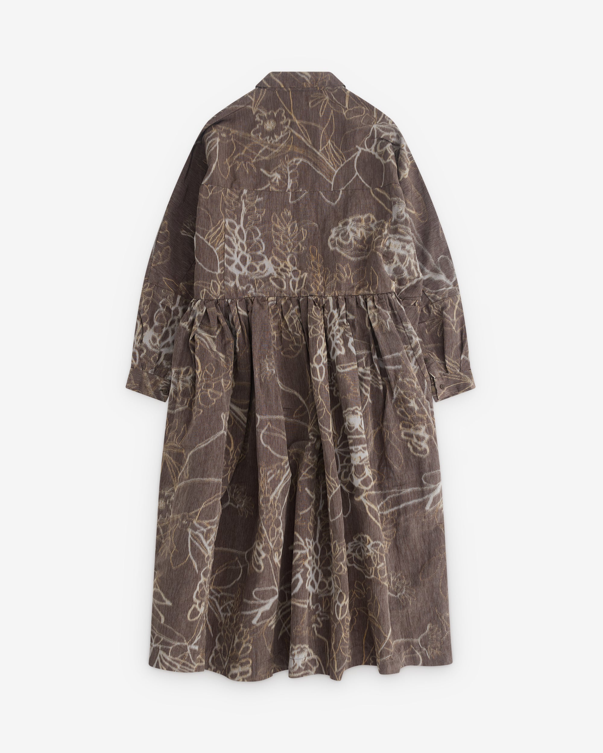 Point collarGathered skirtFull-lengthLong sleevesButton fastening and cuffsDrop shouldersAll over pattern