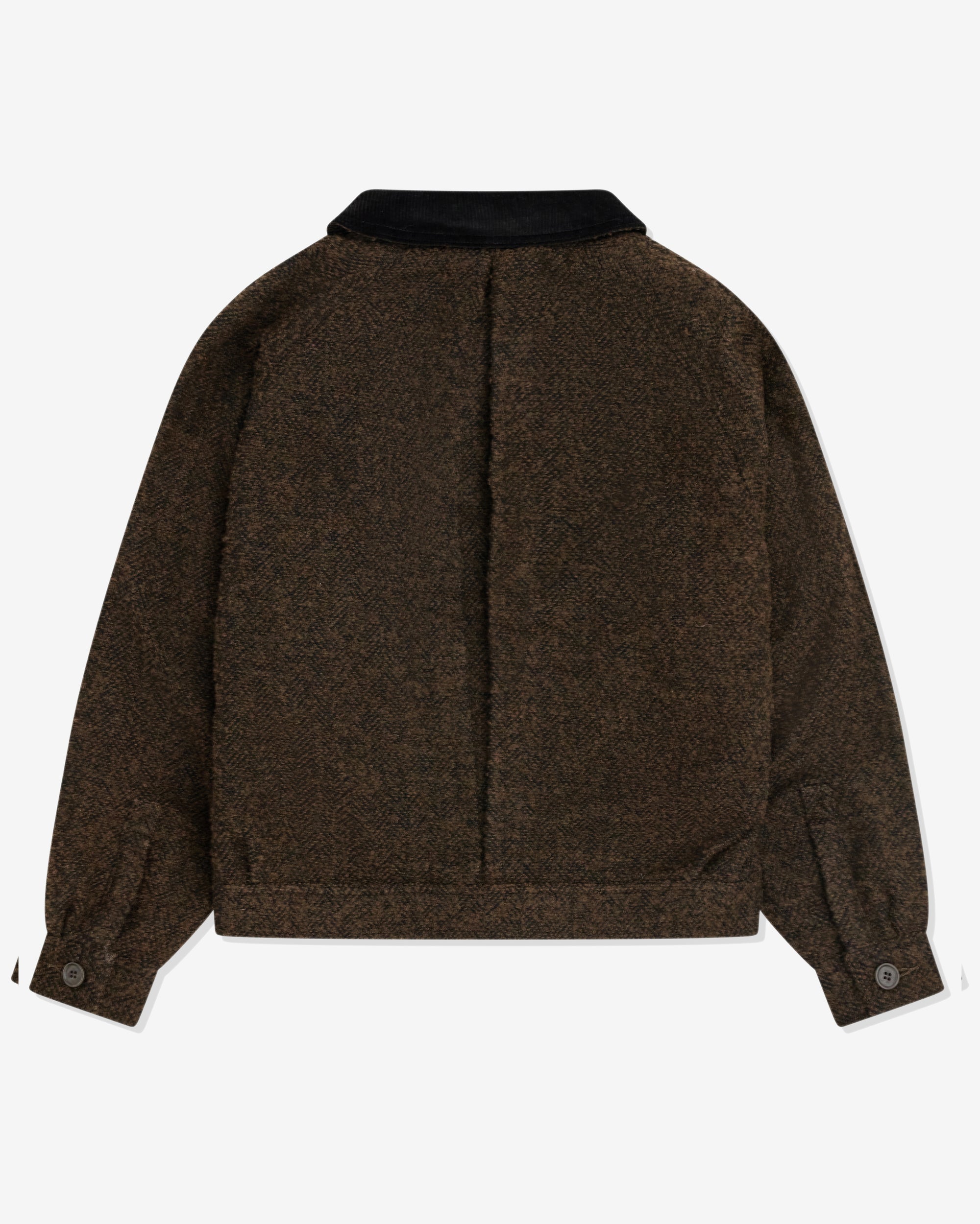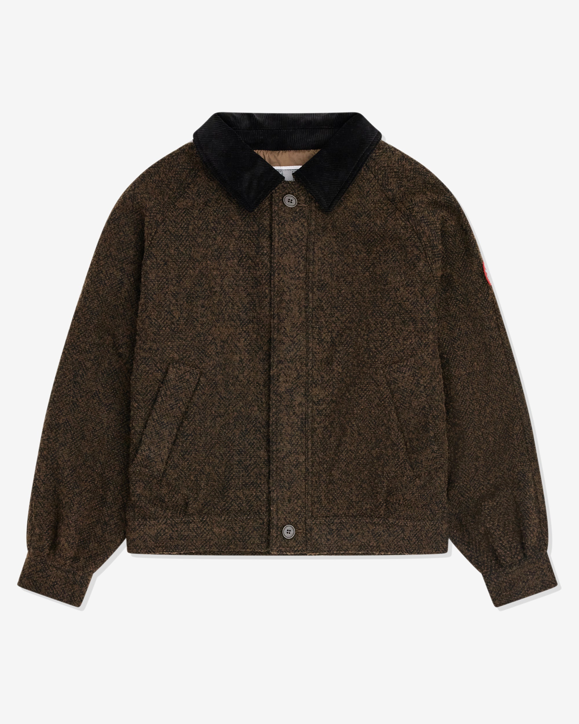 Wool tweed fabricButton closure at neckConcealed zip closureClassic corduroy collarFront slant pocketsInternal liningCav Empt patch at sleeveButton close cuffs