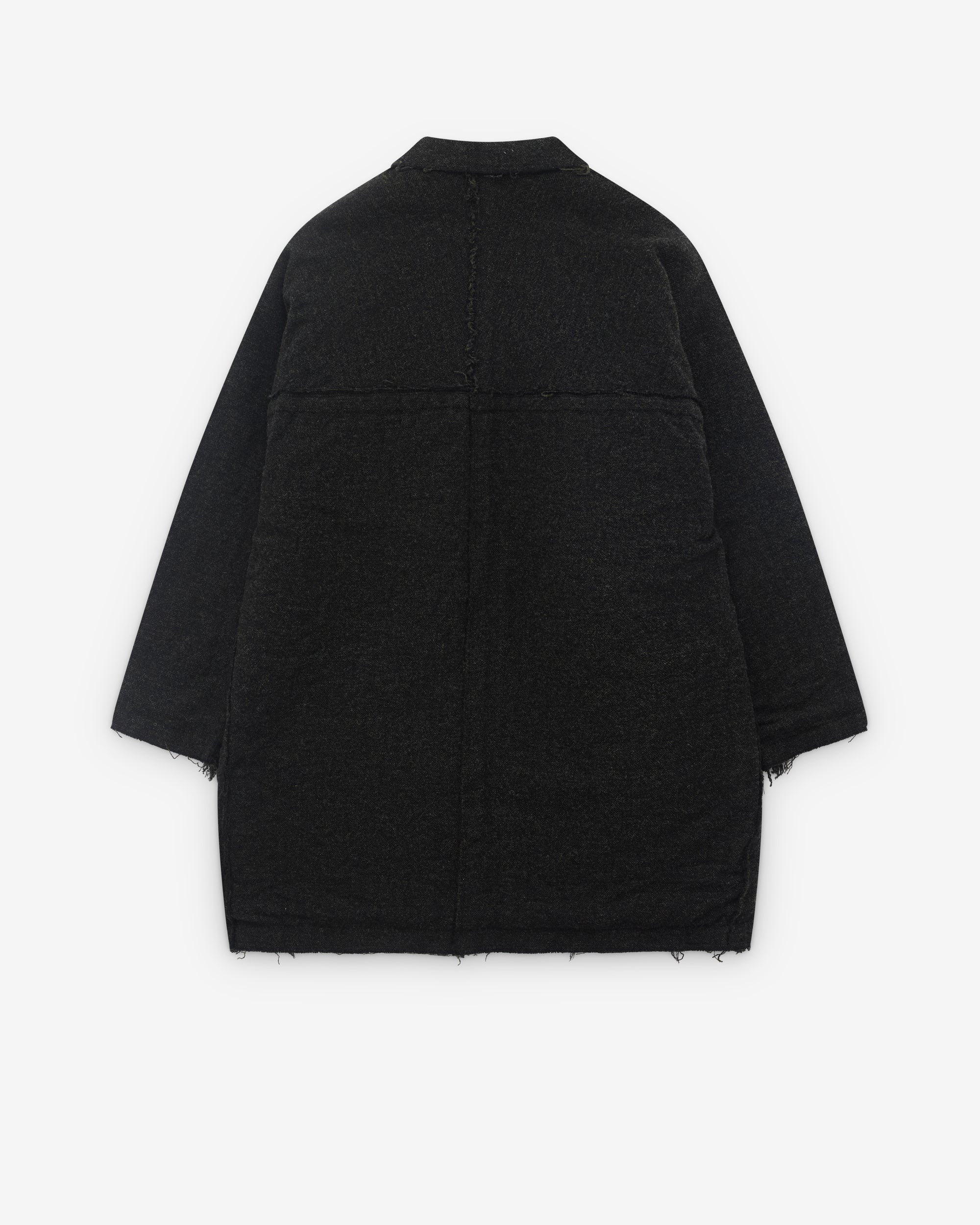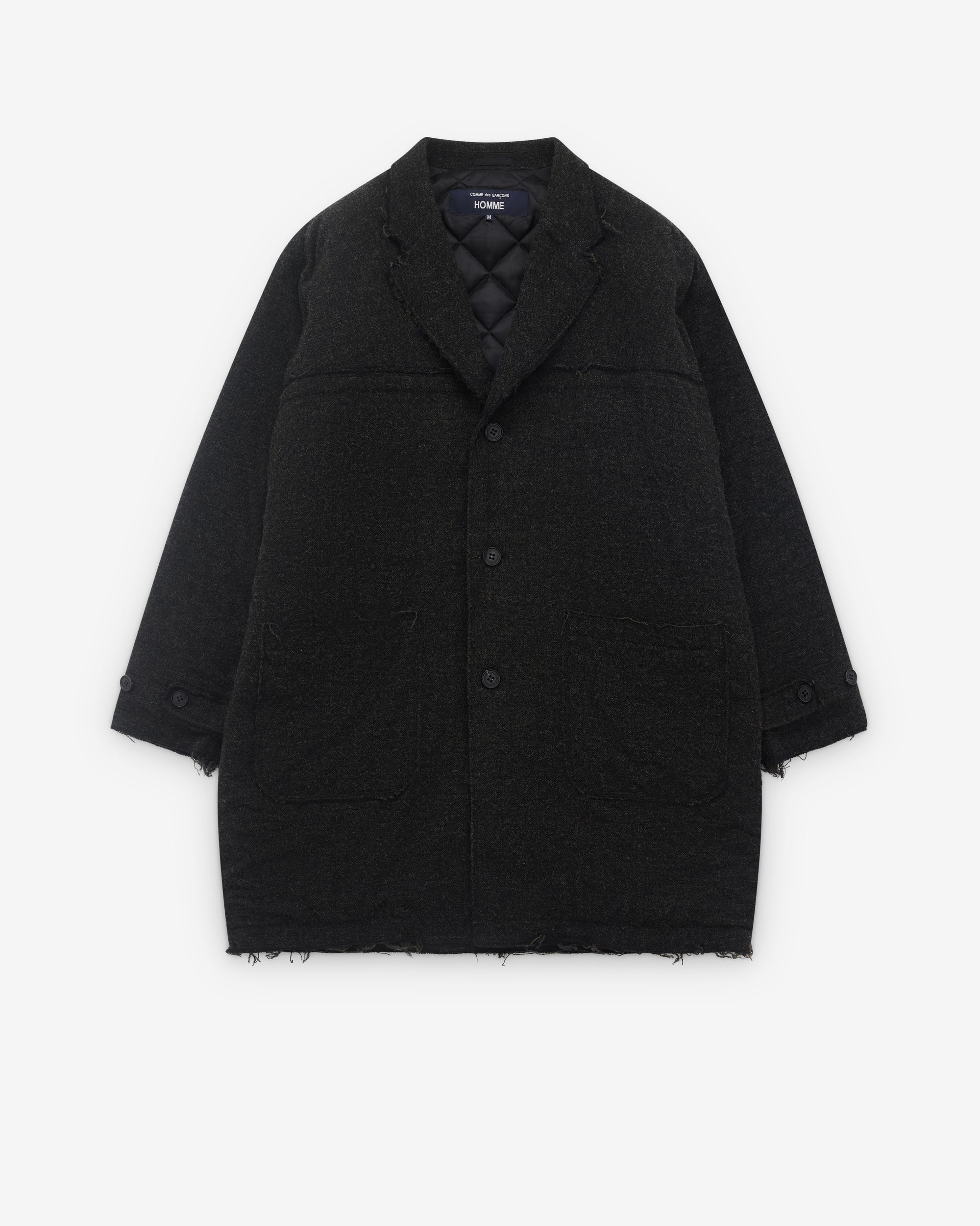 Open collarNotch lapelsQuilted liningRAw hemButton fasteningRelaxed fit