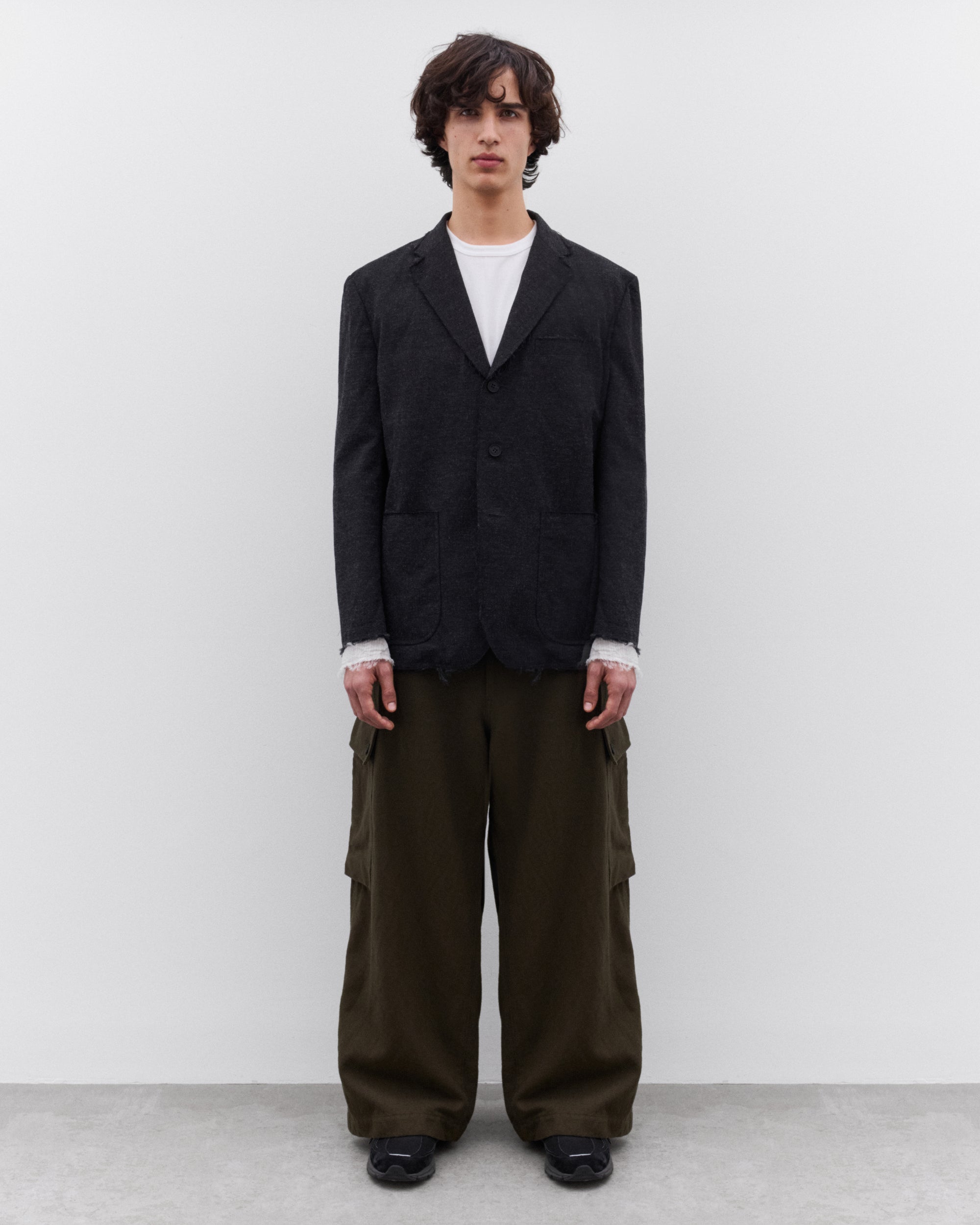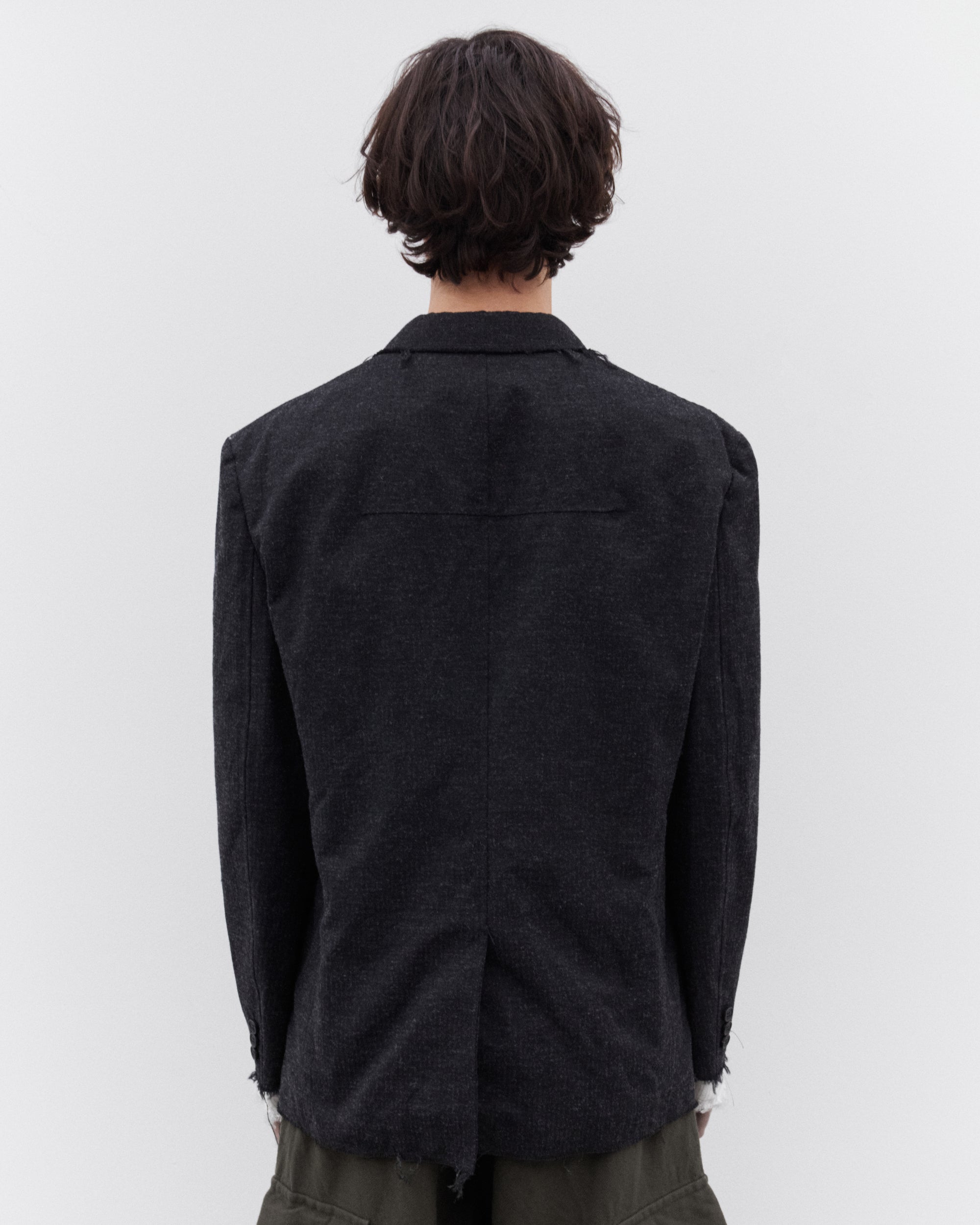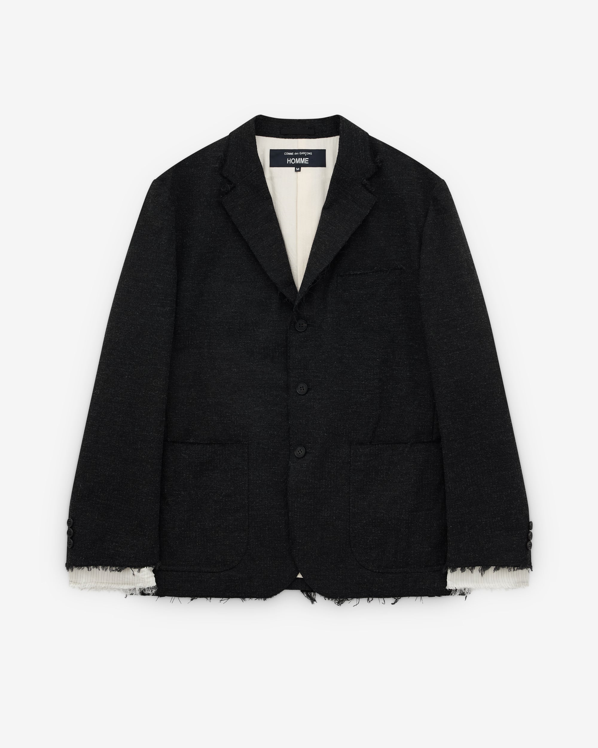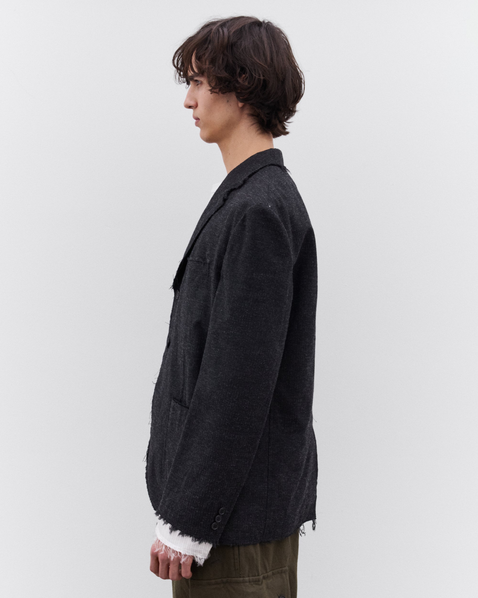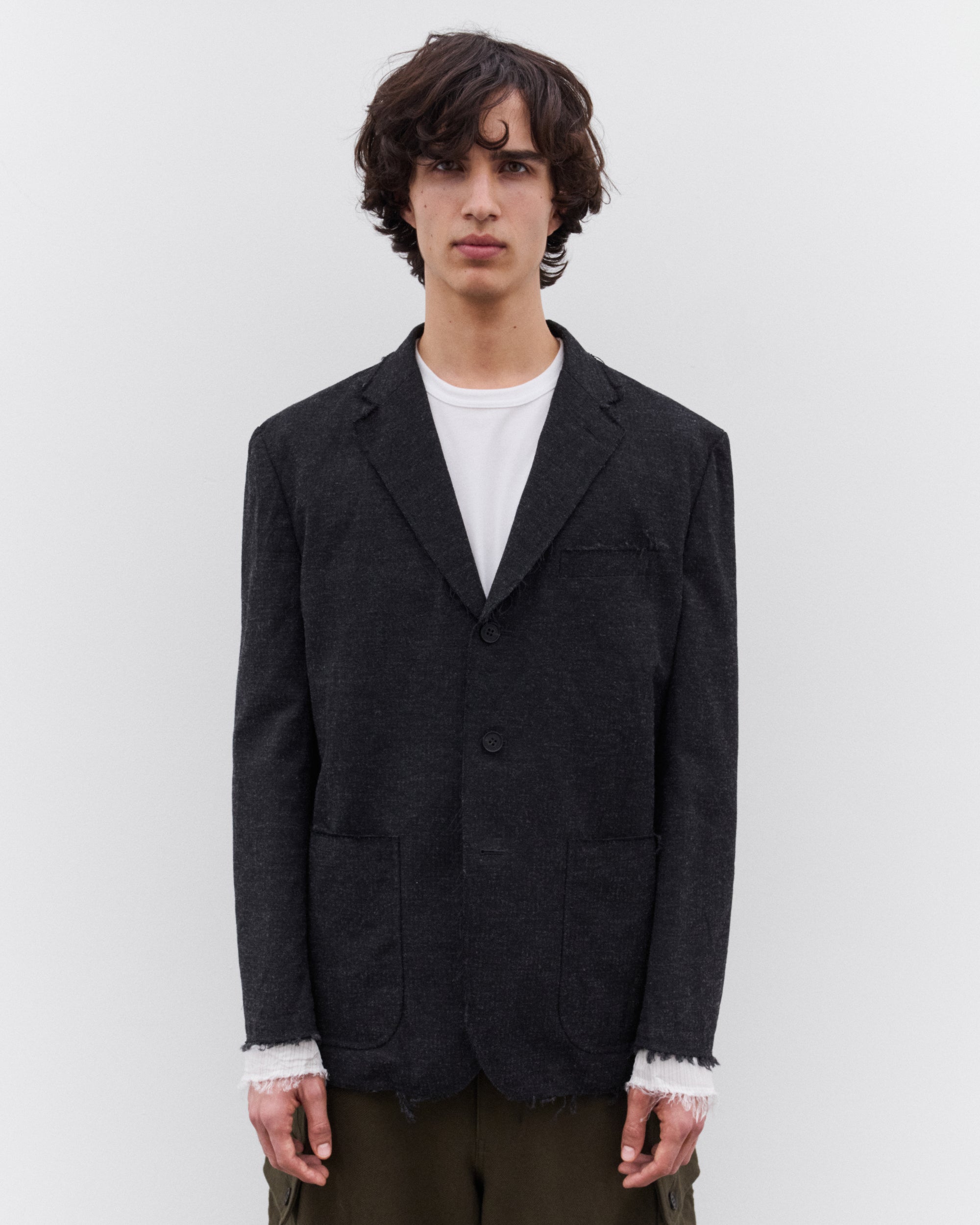Classic notch lapelsPatch pocketsChest welt pocketButton closureRaw hem detailingLined with exposure at sleeves