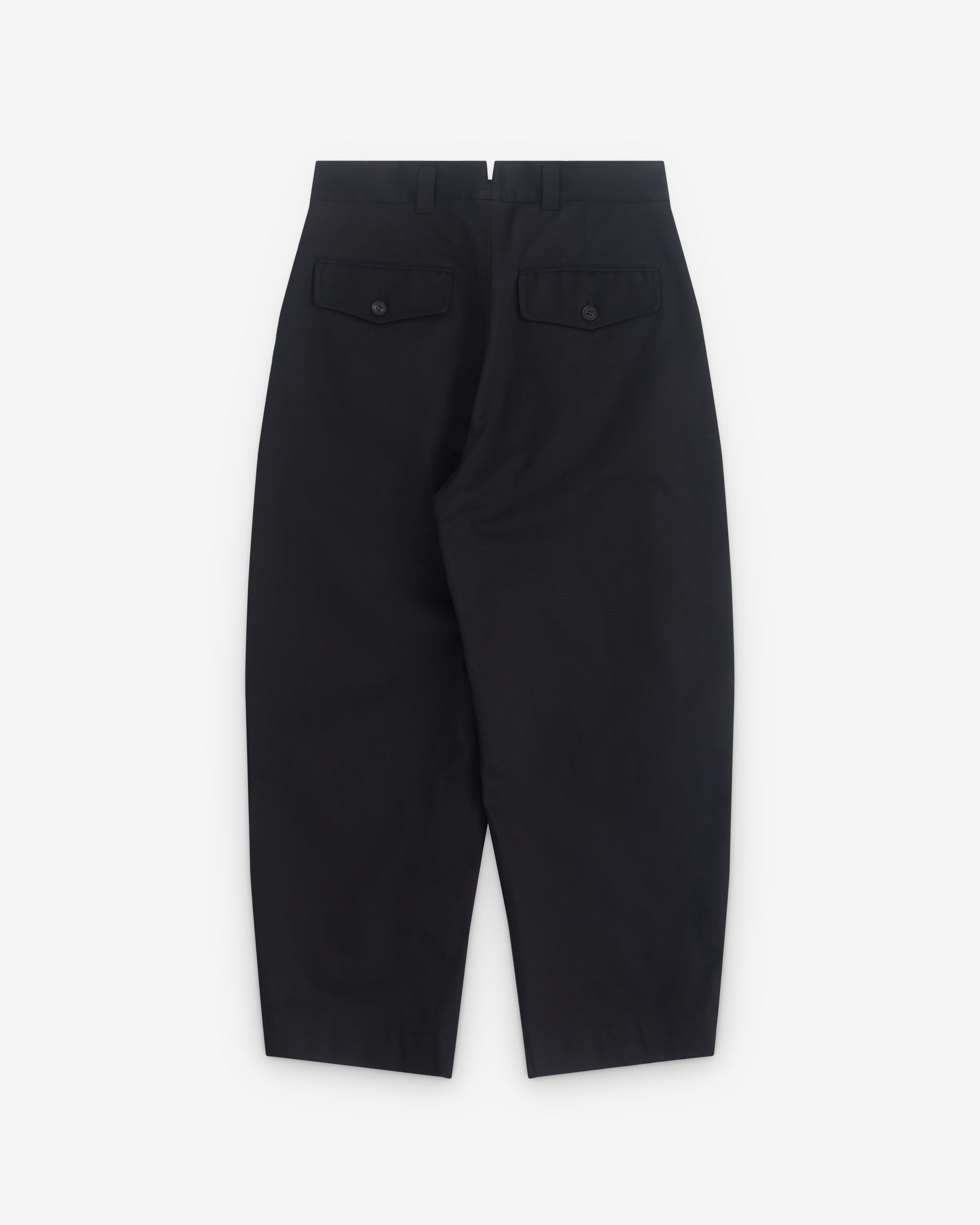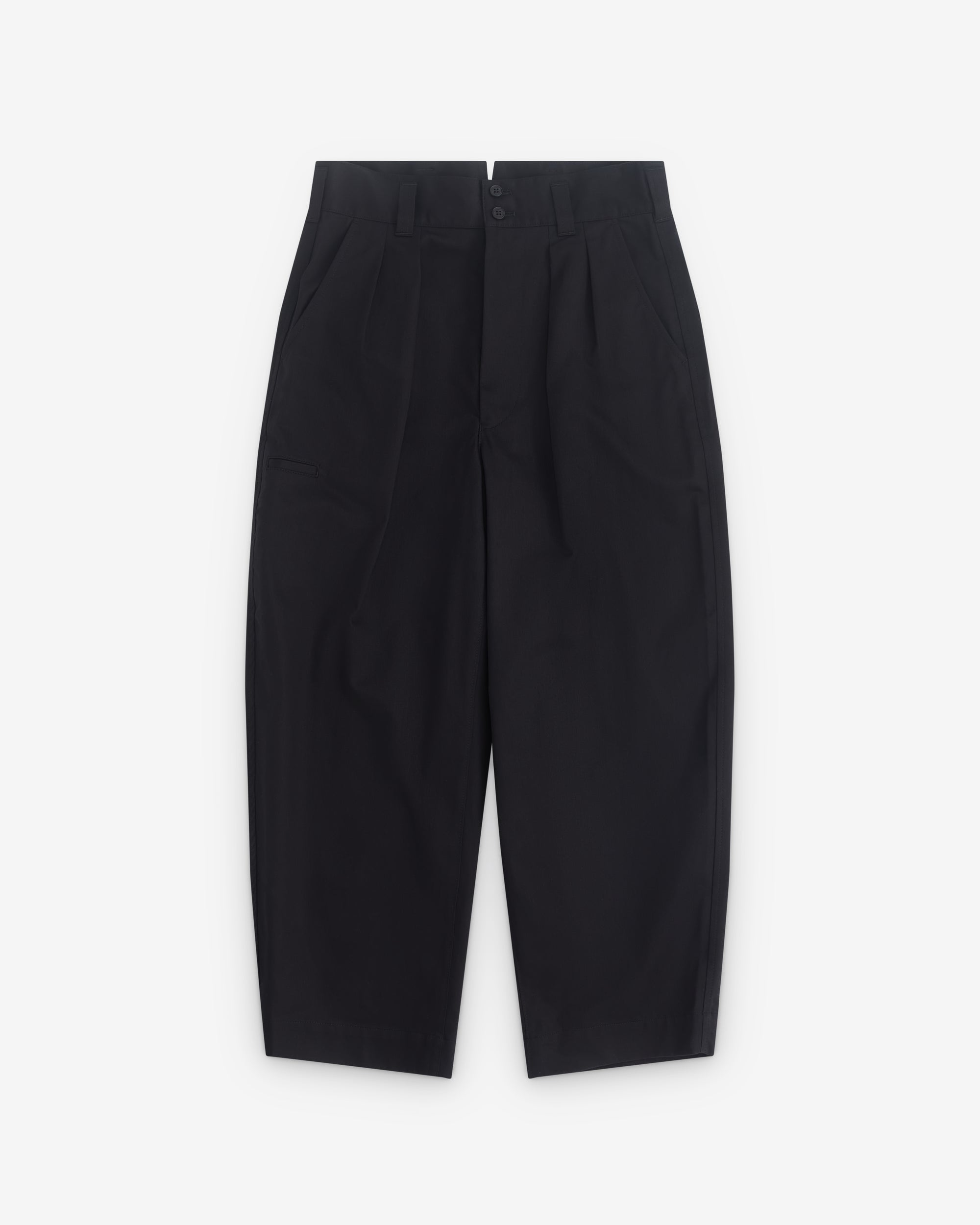 Pleated, barrel legSide slant pocketsDouble button fasteningRear button flap pocketsBelt loops