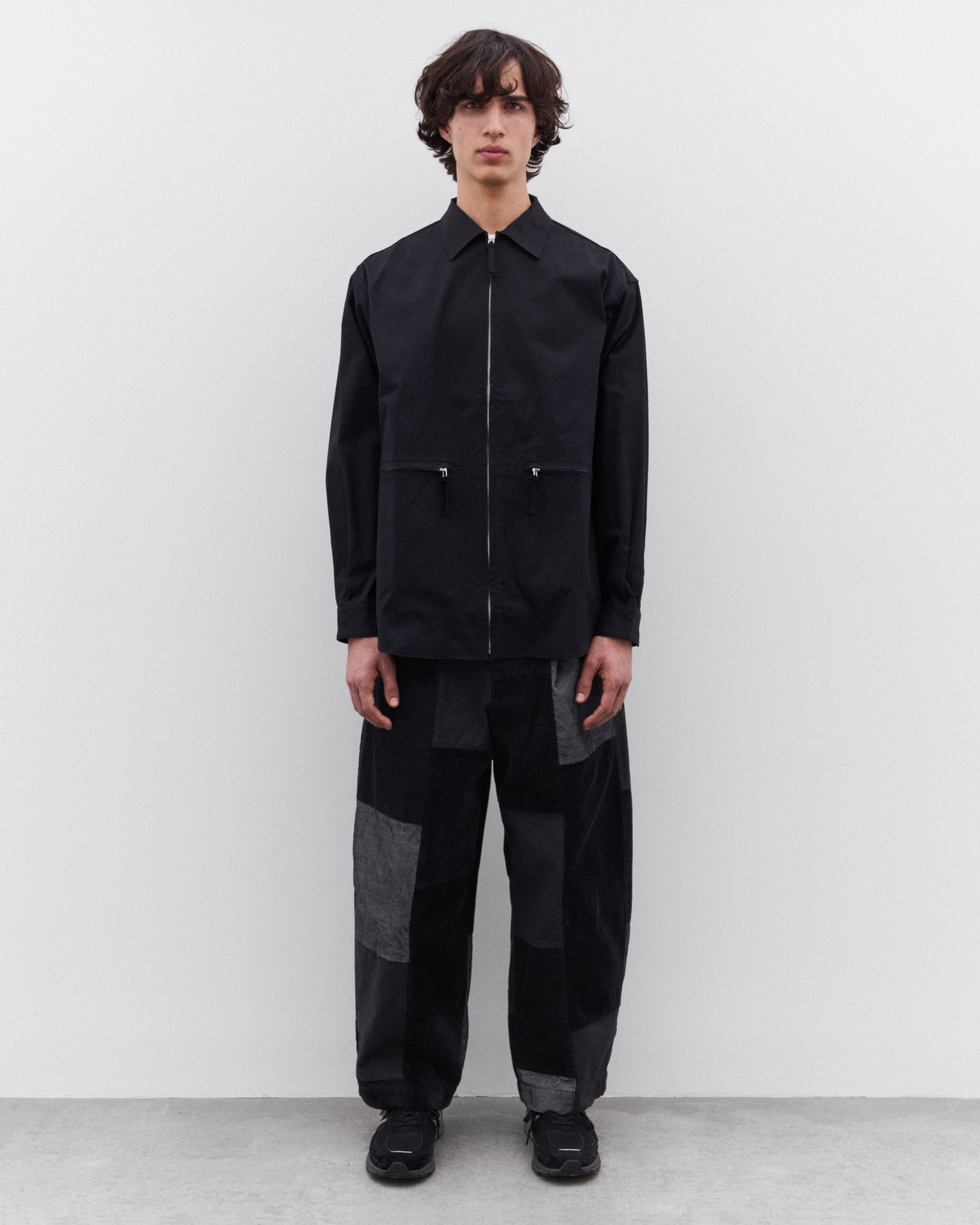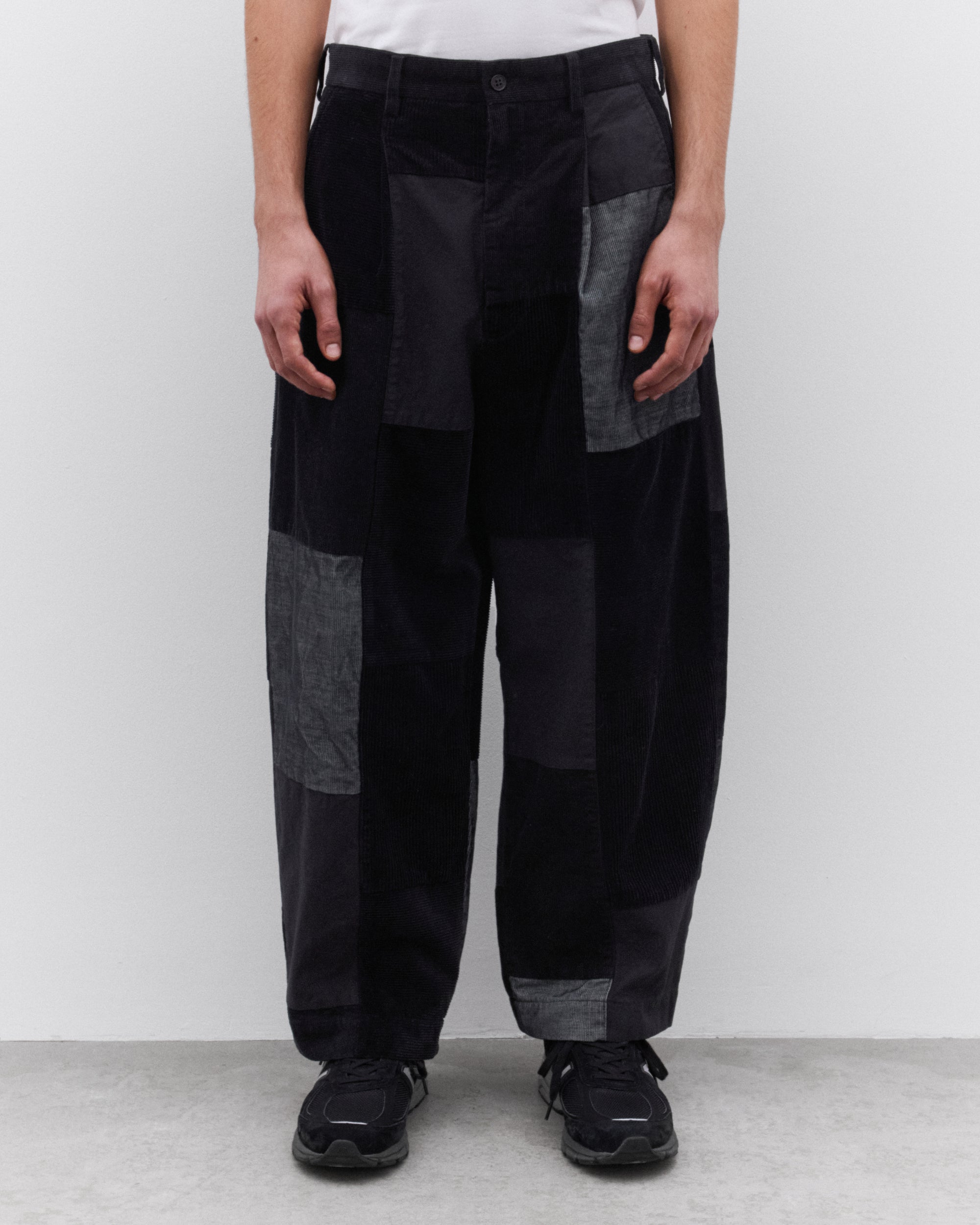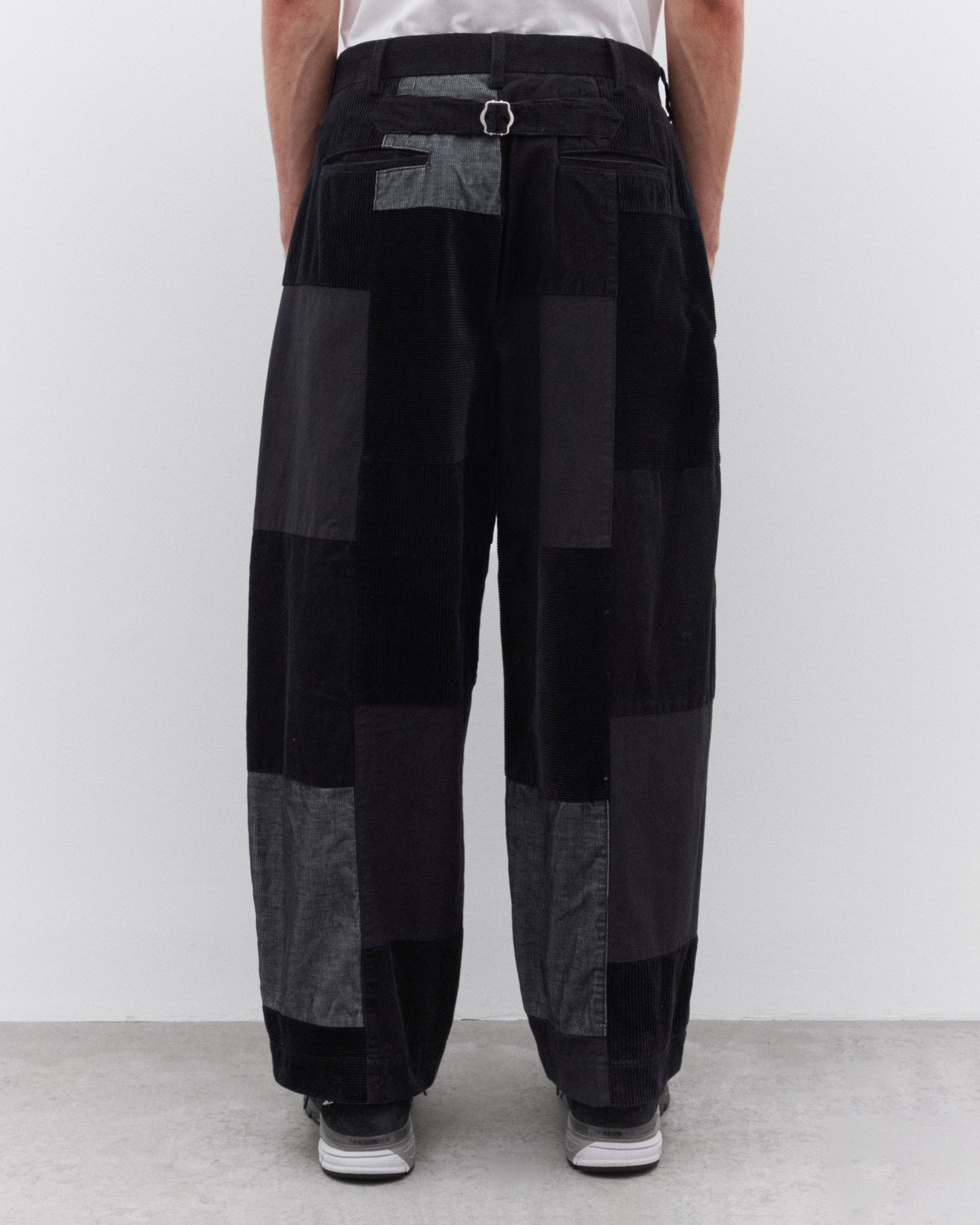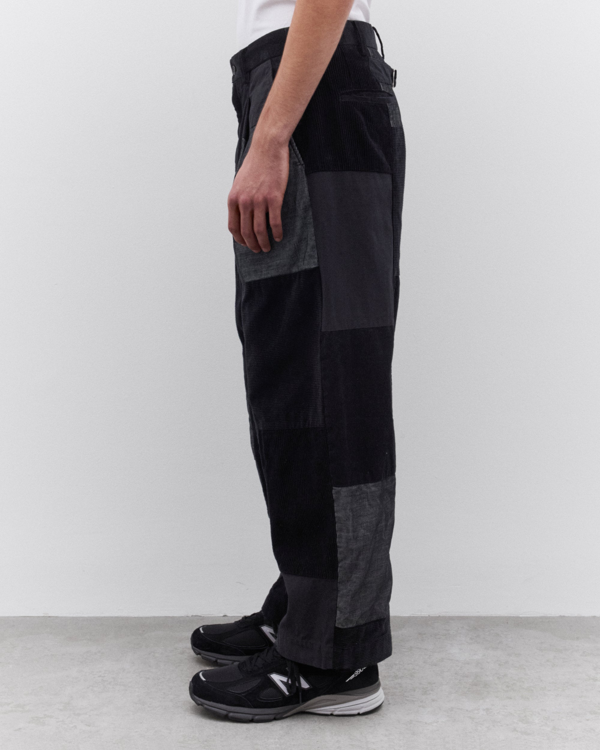 Barrel legPatchwork constructionHigh waistSide slant pocketsButton and zip fly fastening
