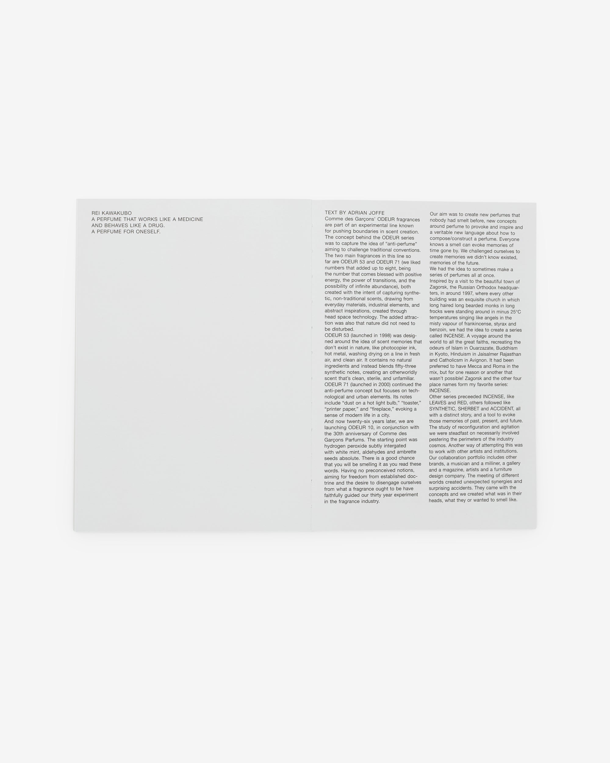 This is a catalogue of that spirit of disruption - of liberation from established doctrine and the desire to disengage from convention. A celebration of thirty years of olfactive and creative freedom, through the unique perspective of Comme des Garçons.