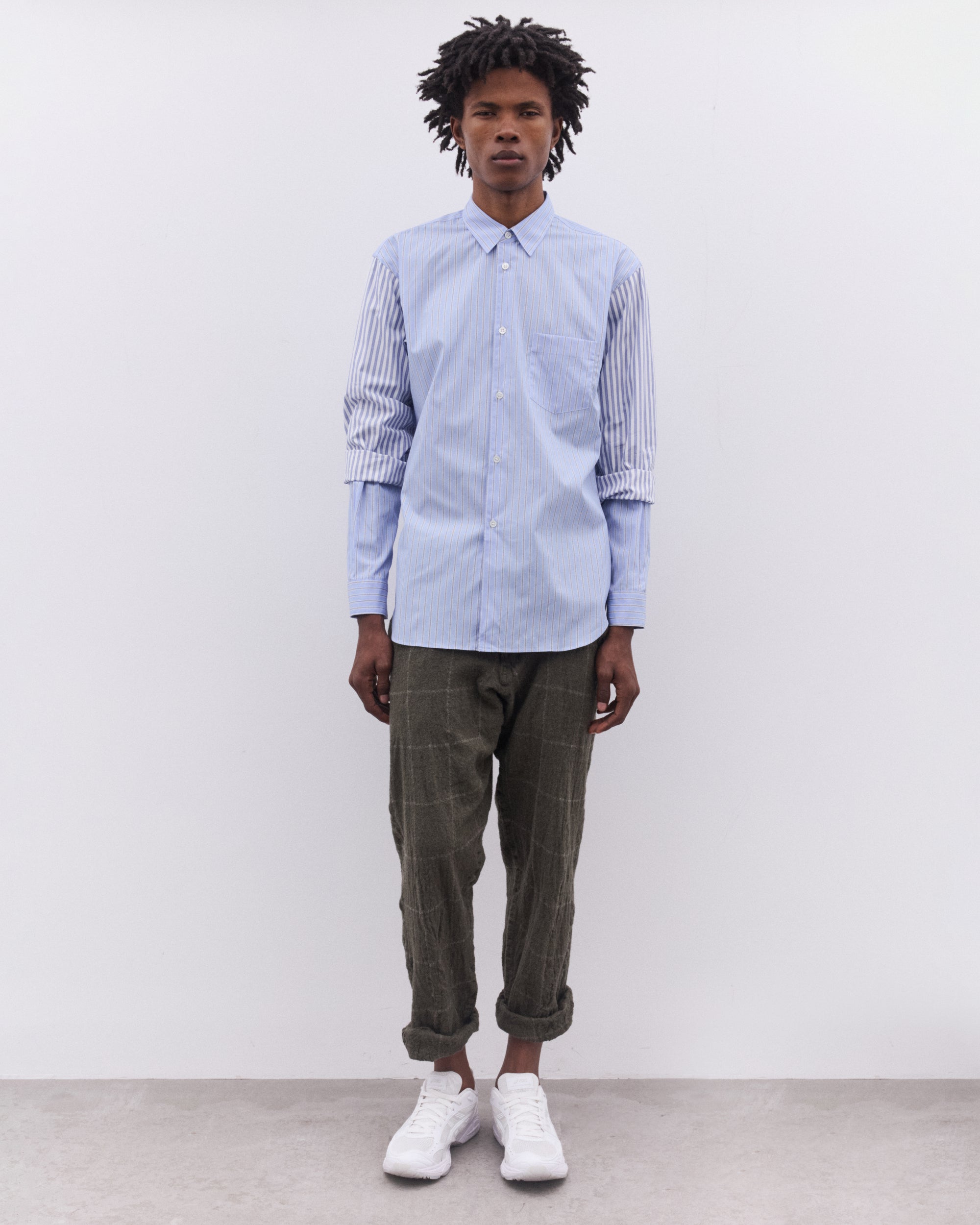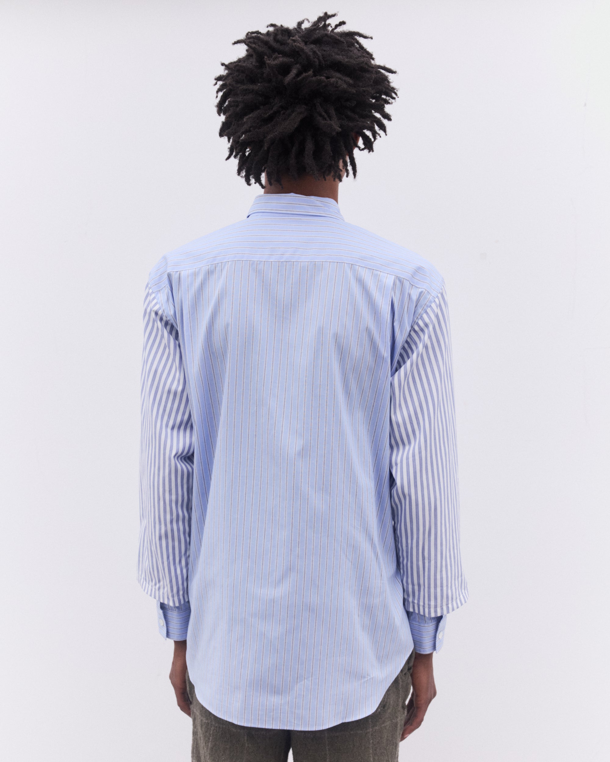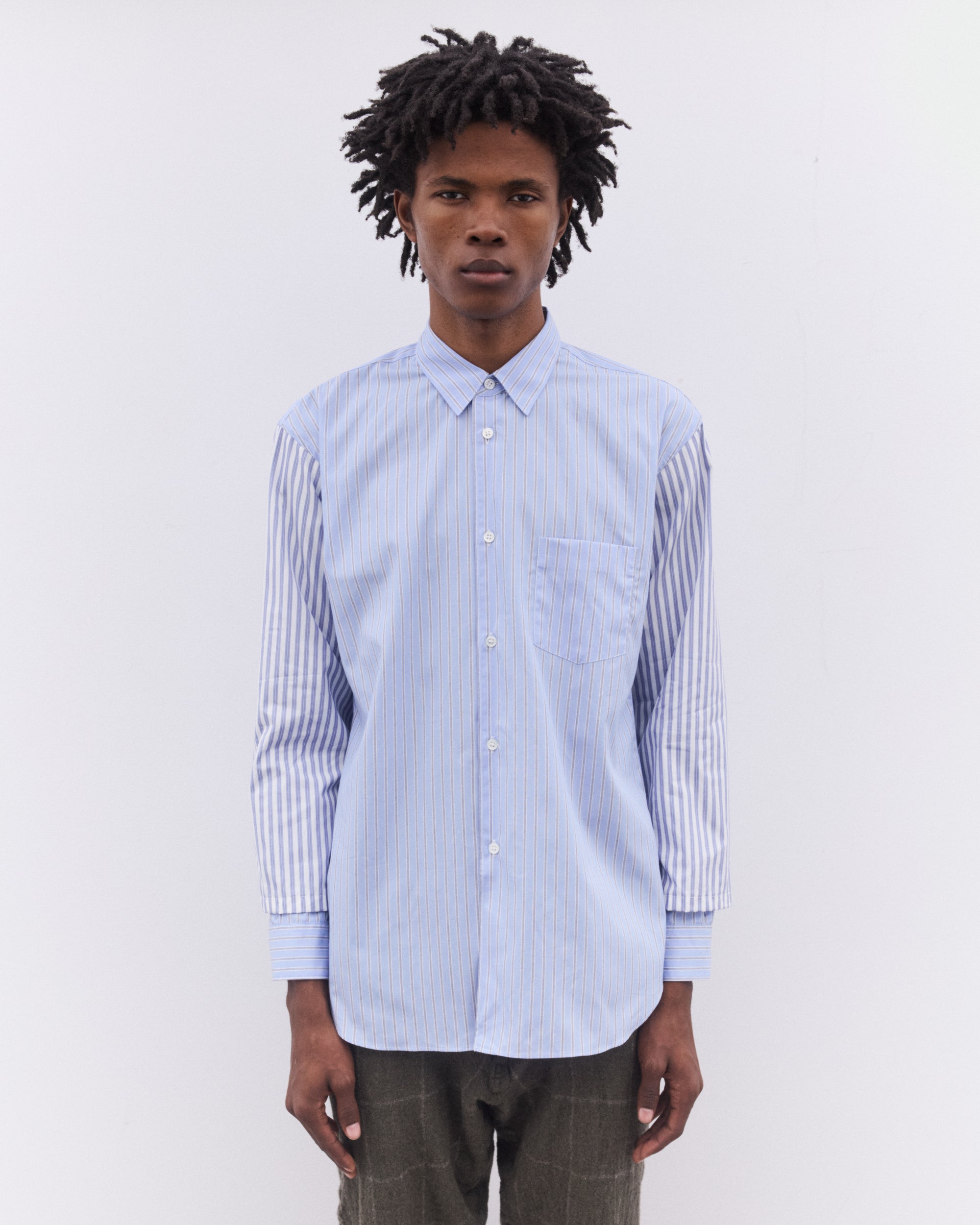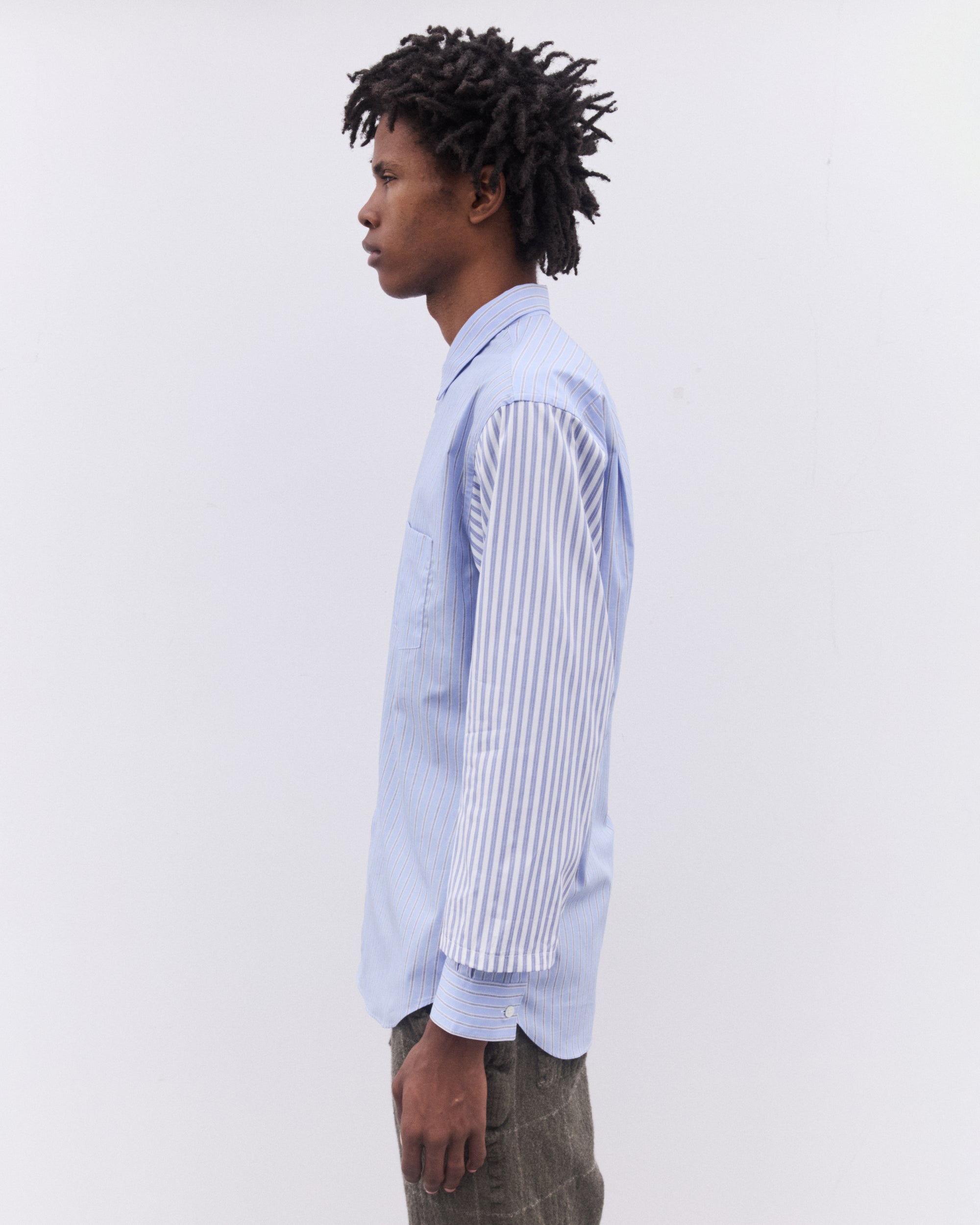 Point collarCurved hemPatch chest pocketButton placketButton cuffsMulti stripe constructionSleeve overlay detail