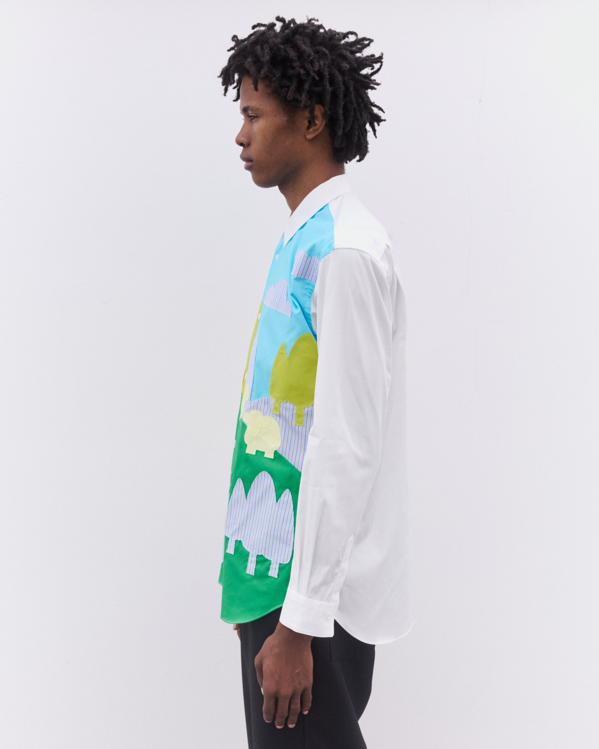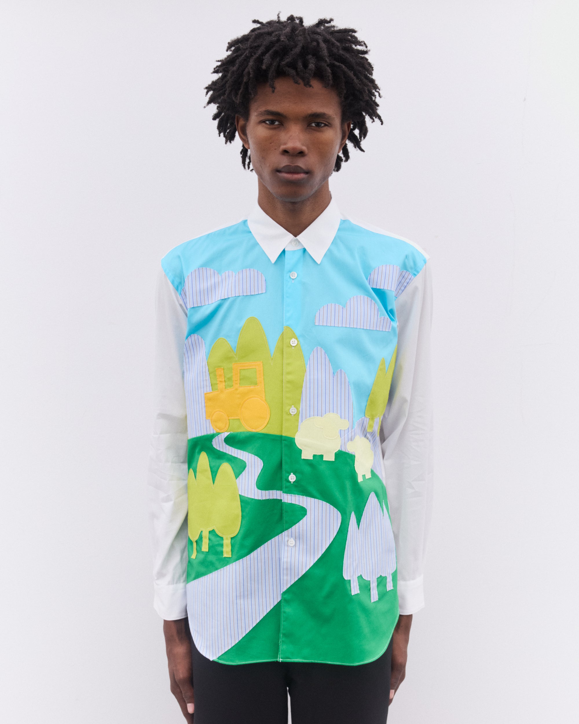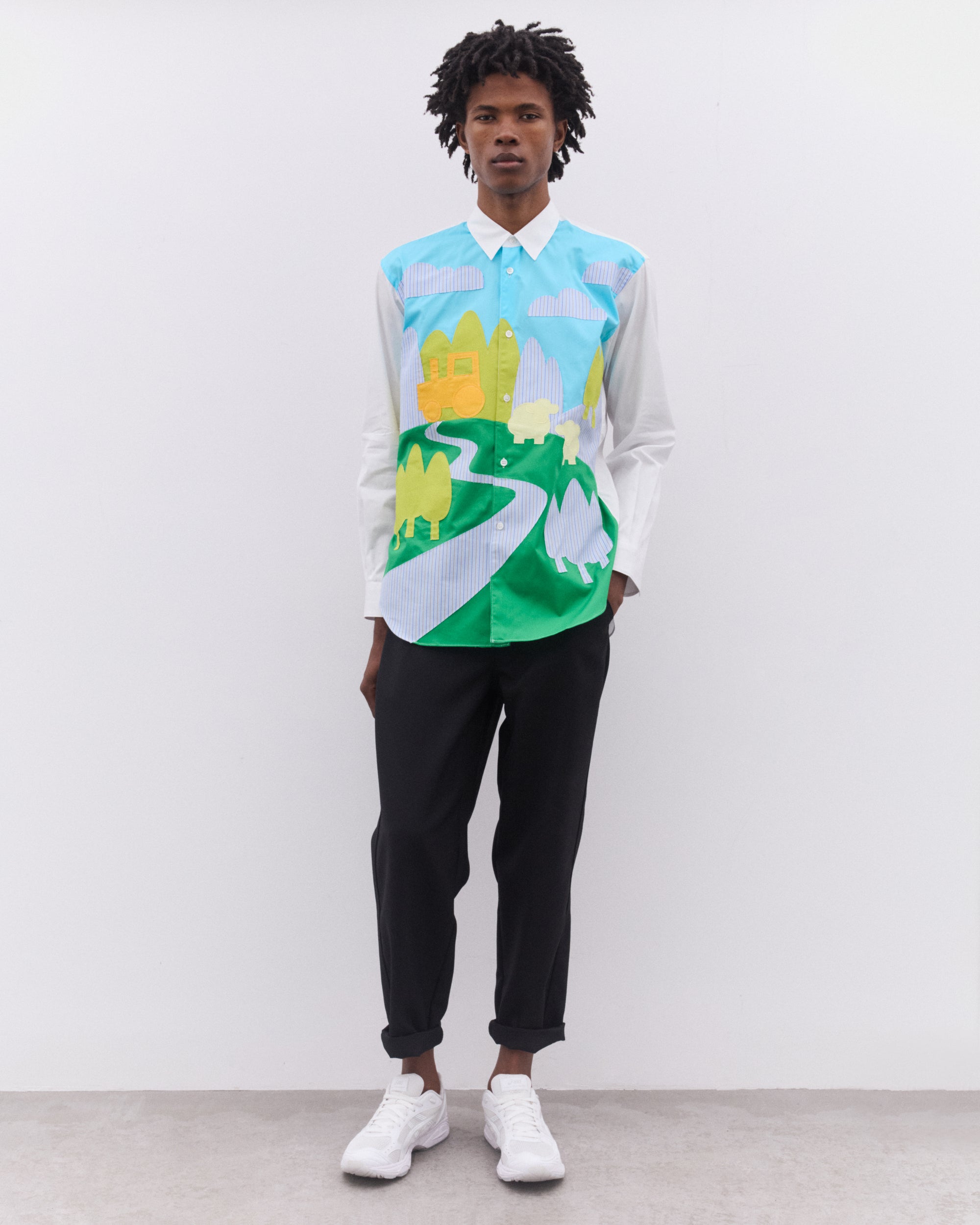 Point collarCurved hemPatch chest pocketButton placketButton cuffsSewn-on farmyard scene