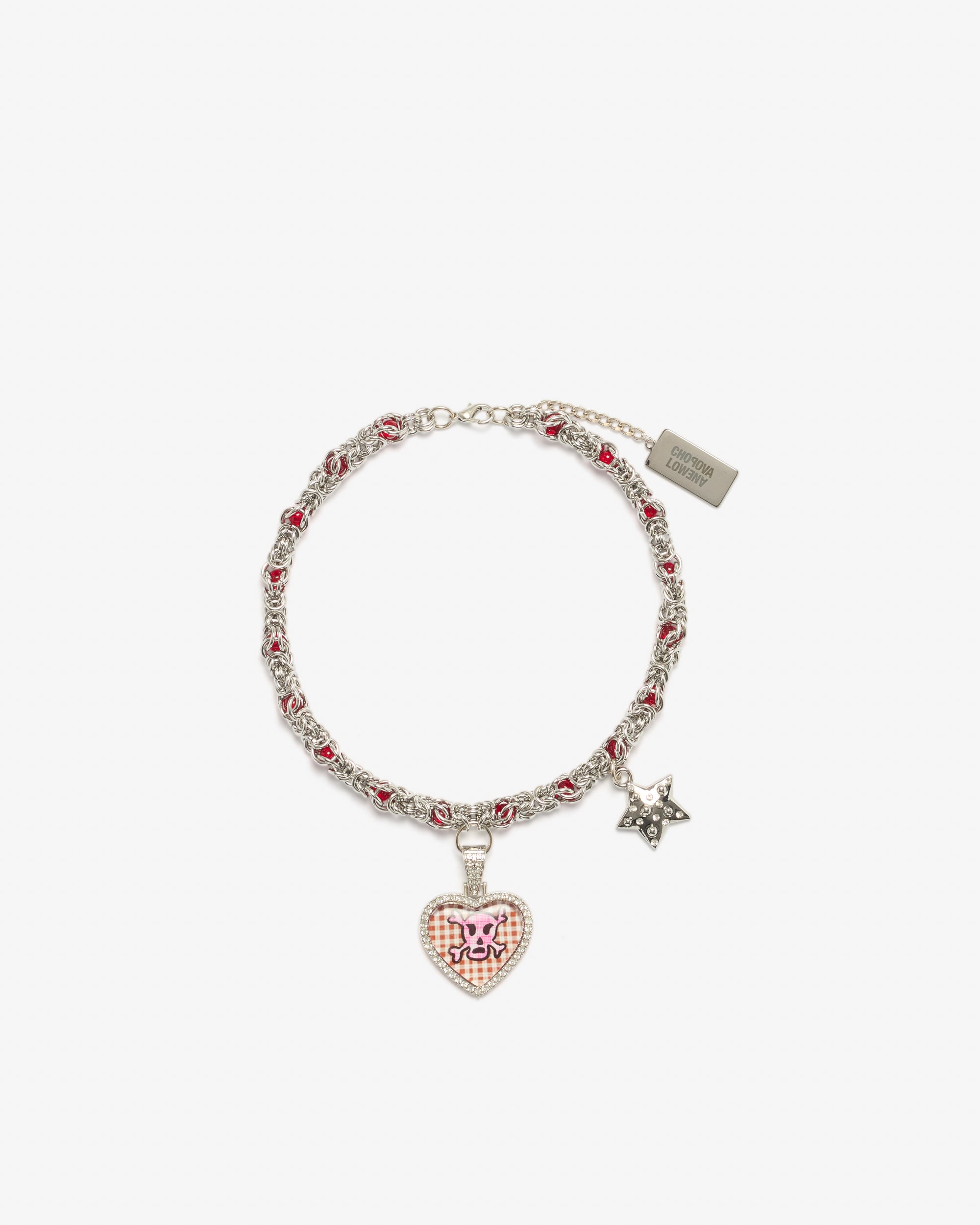 Adjustable carabiner chainCharm at dropEmbossed logo plaque Silver-tone