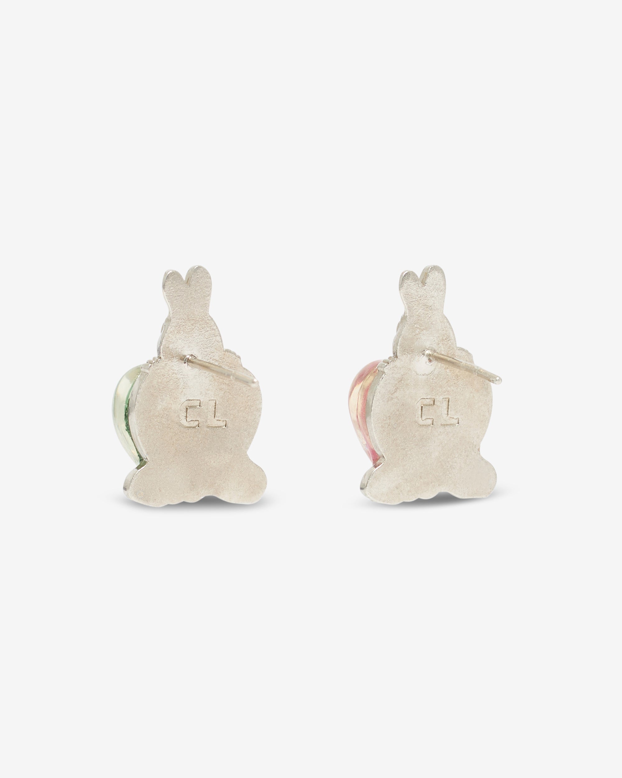 Asymmetric bunny studsSilver-toneGreen and pink resin