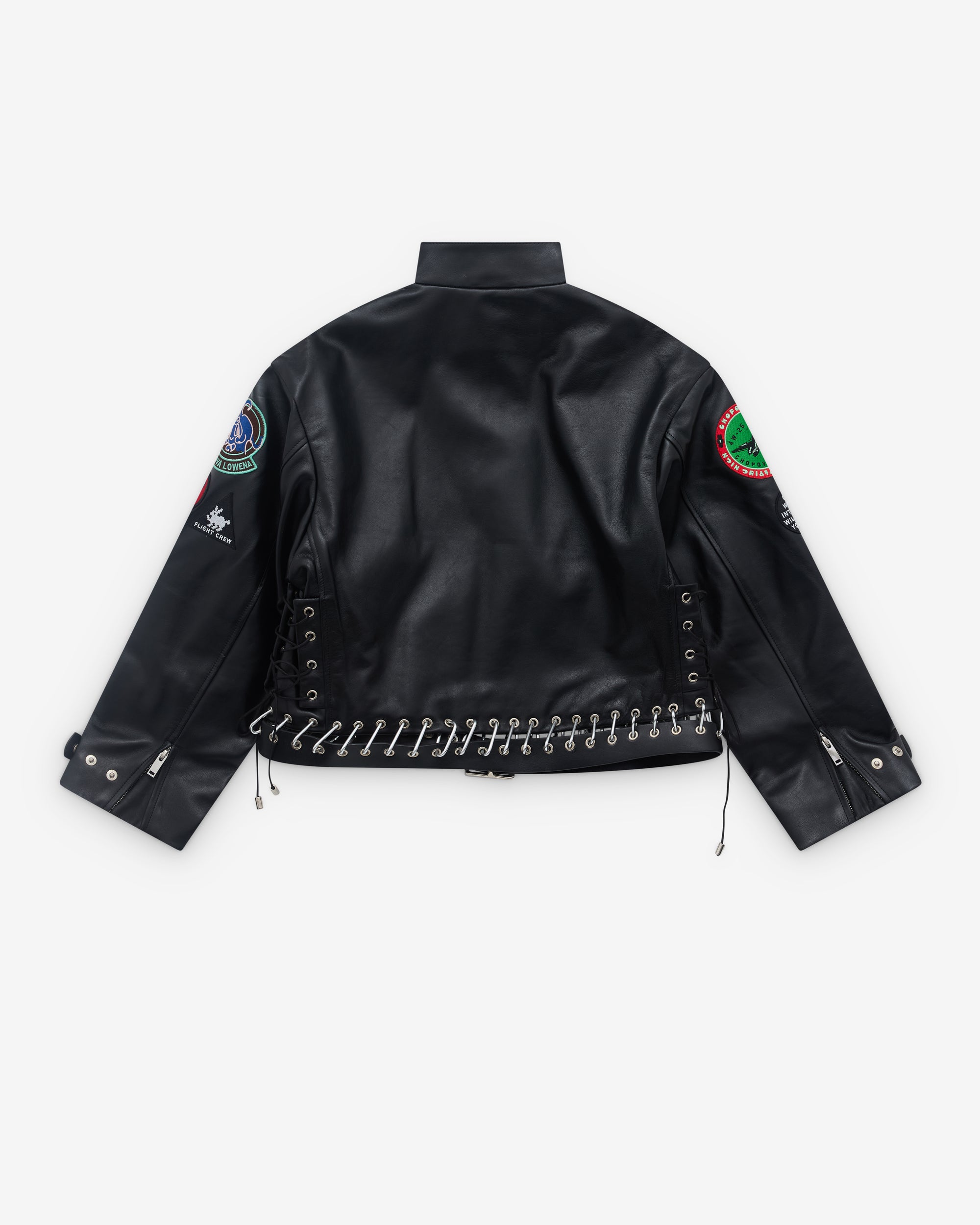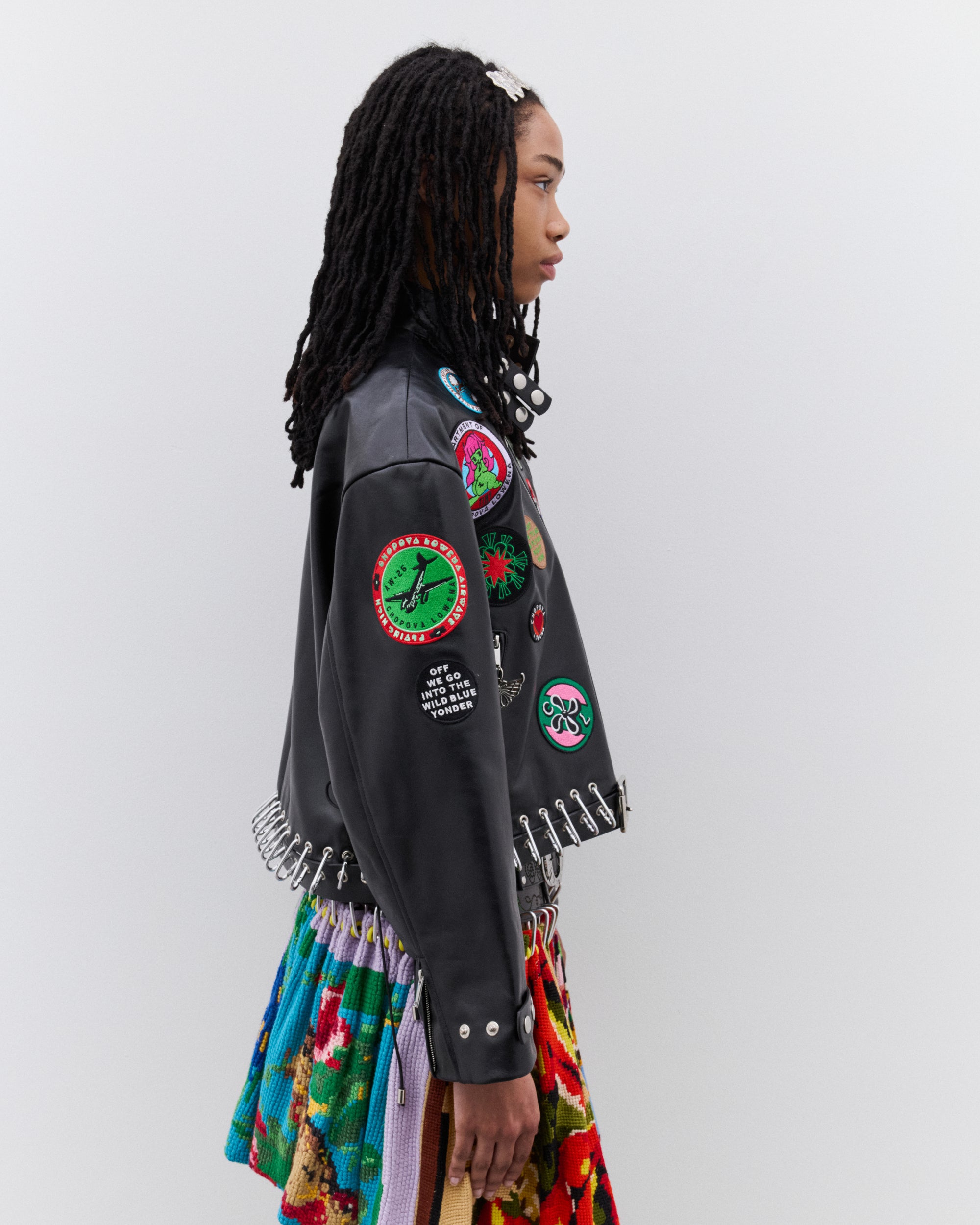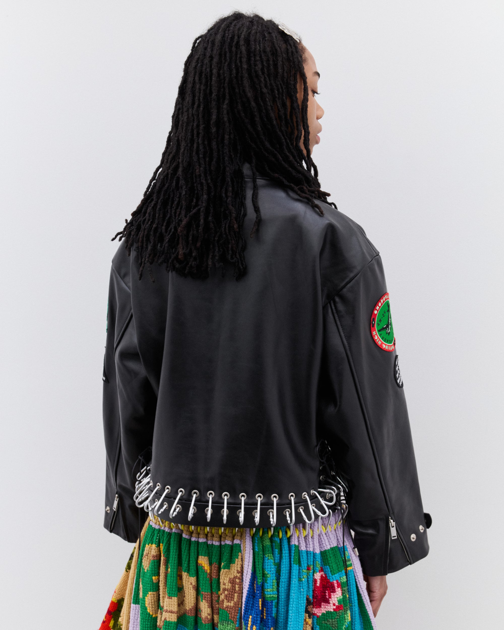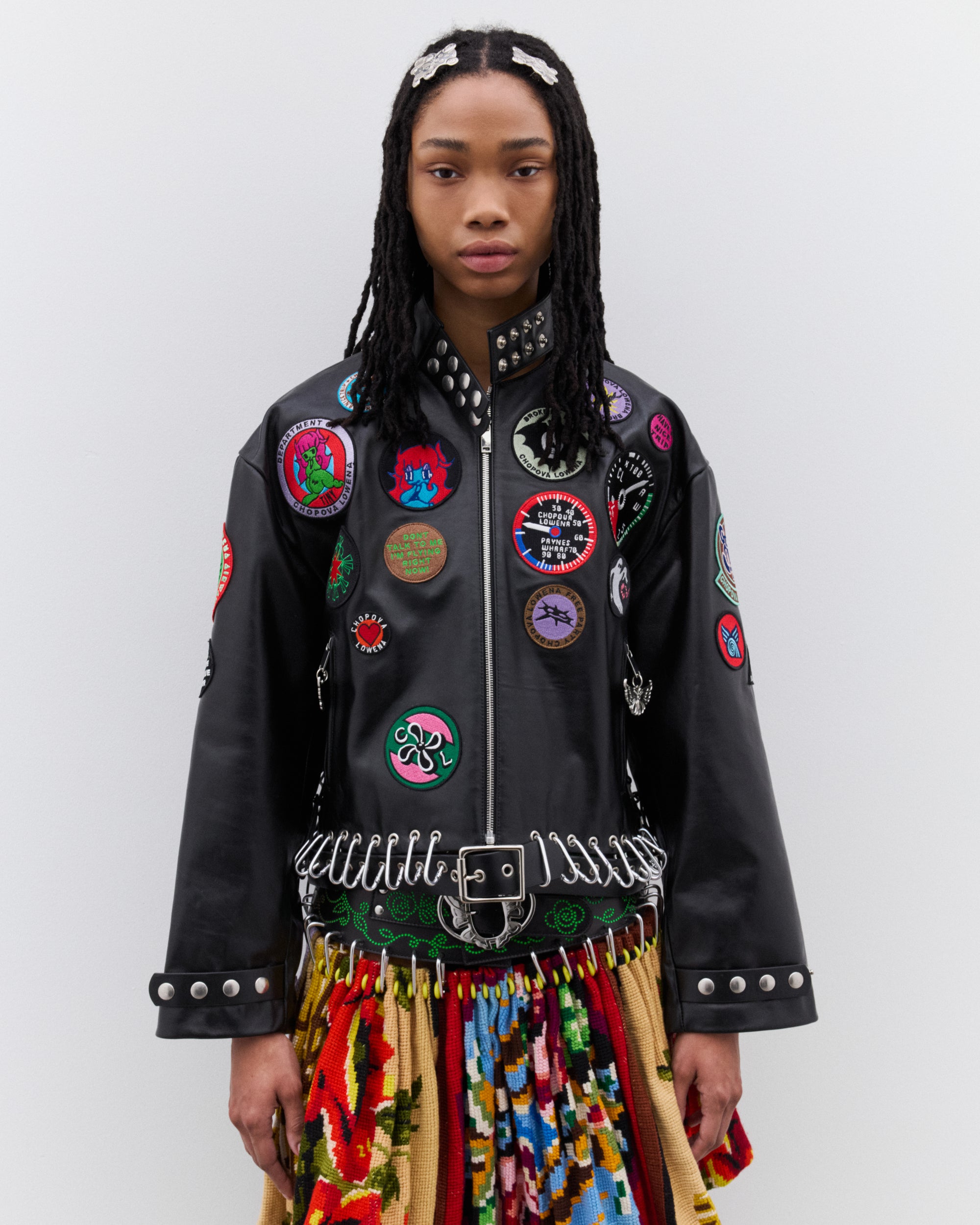 Stand collar with press stud detailZip fastening with charm zip pullCarabiner waistbandAll-over graphic patchesSilver-tone hardware