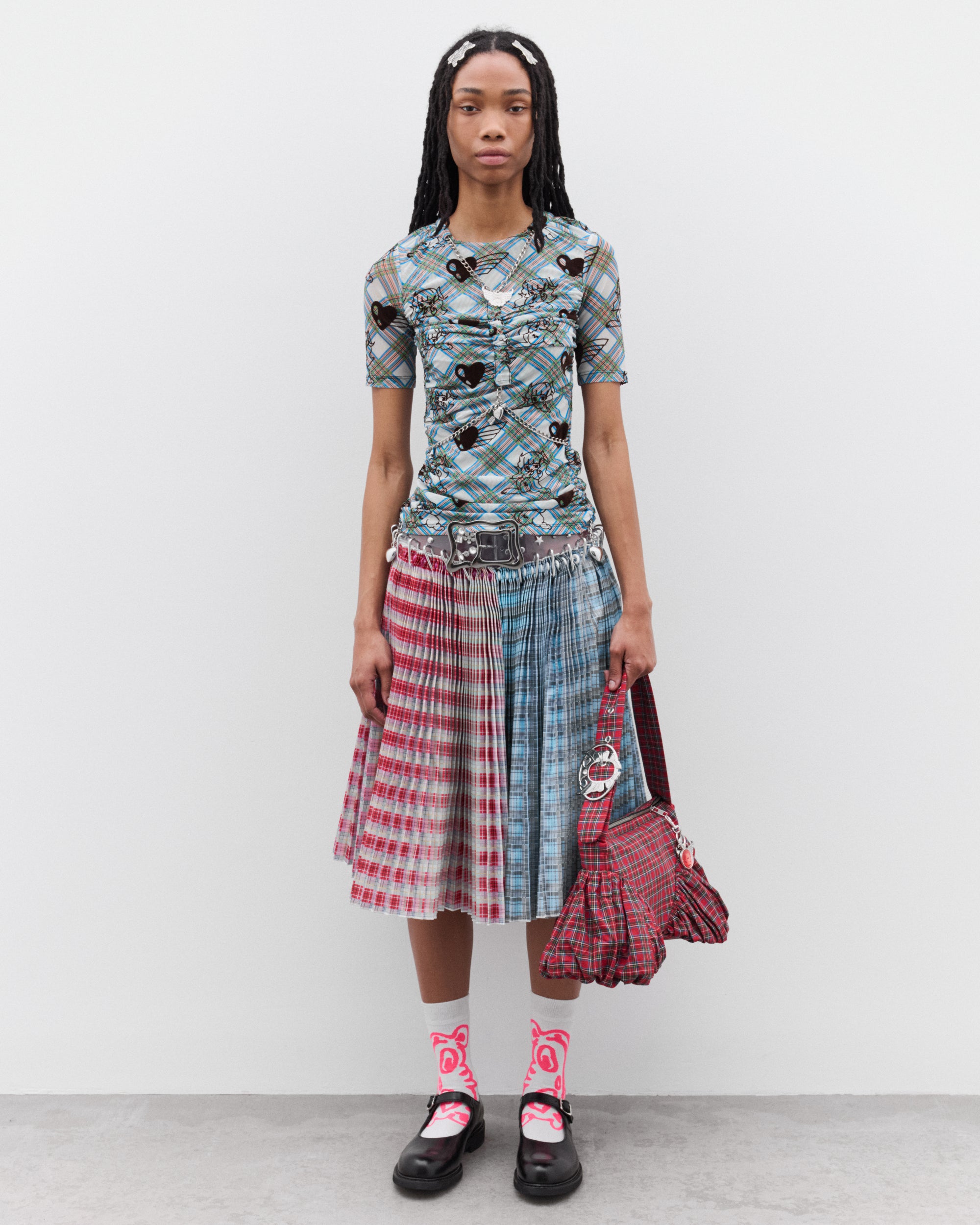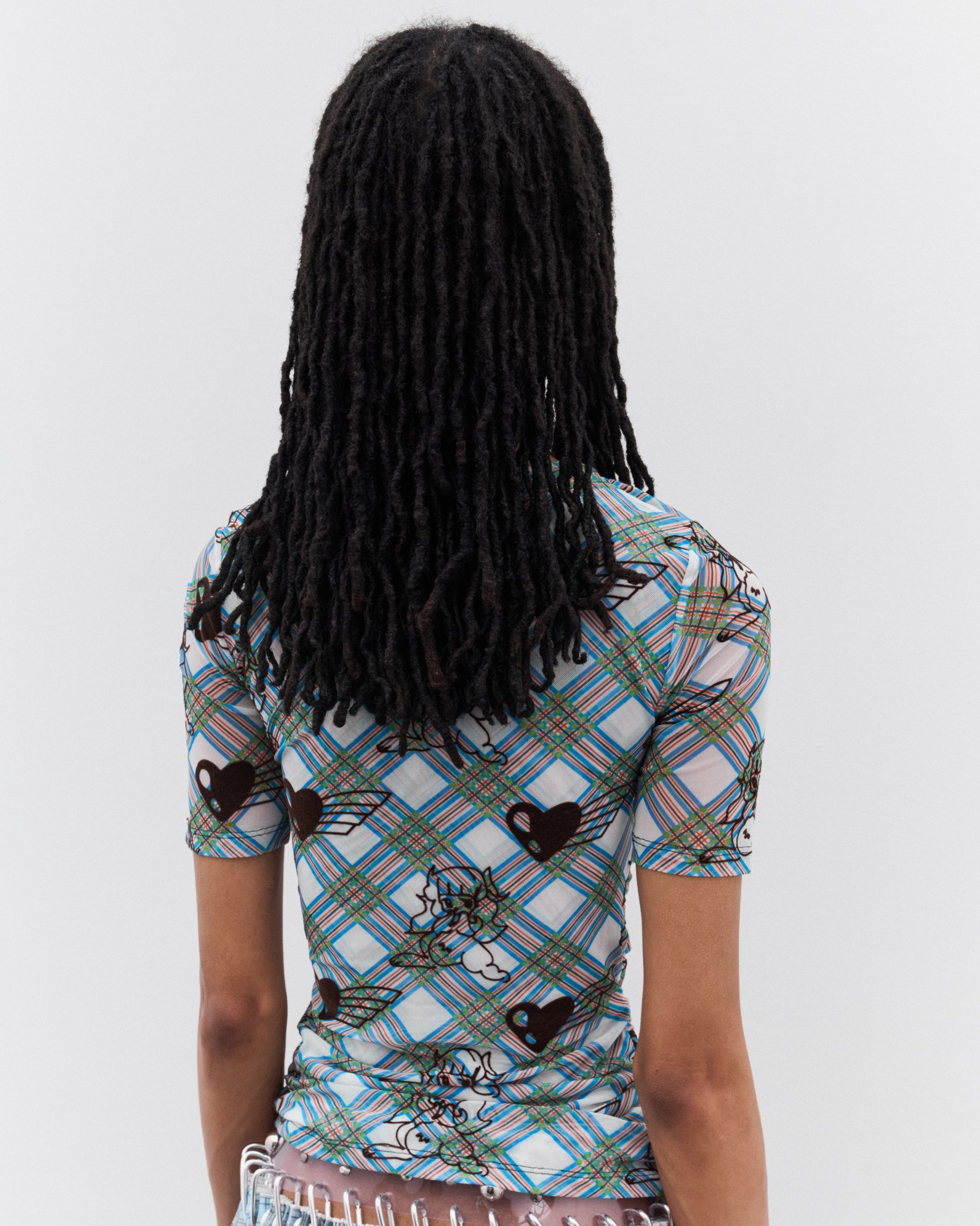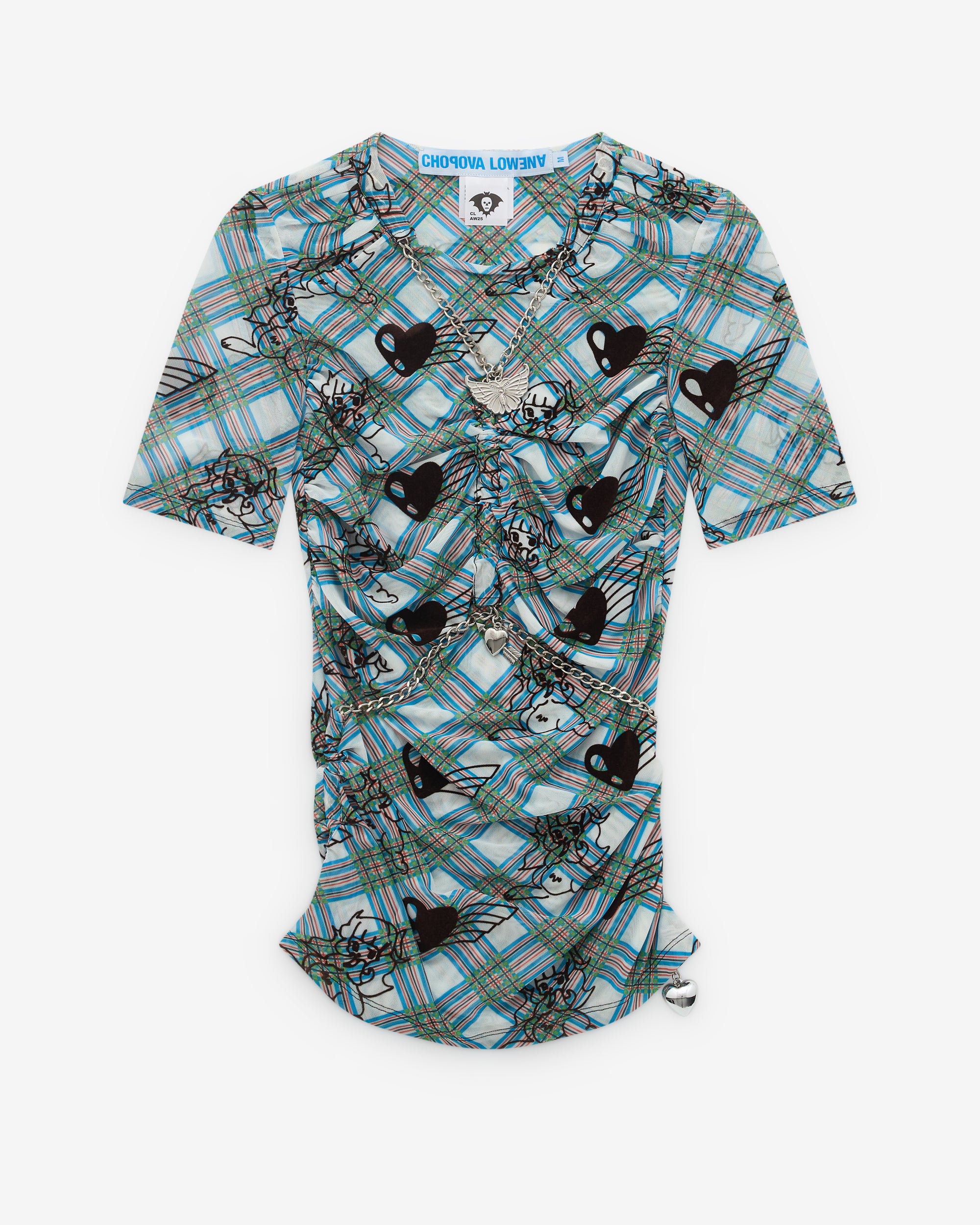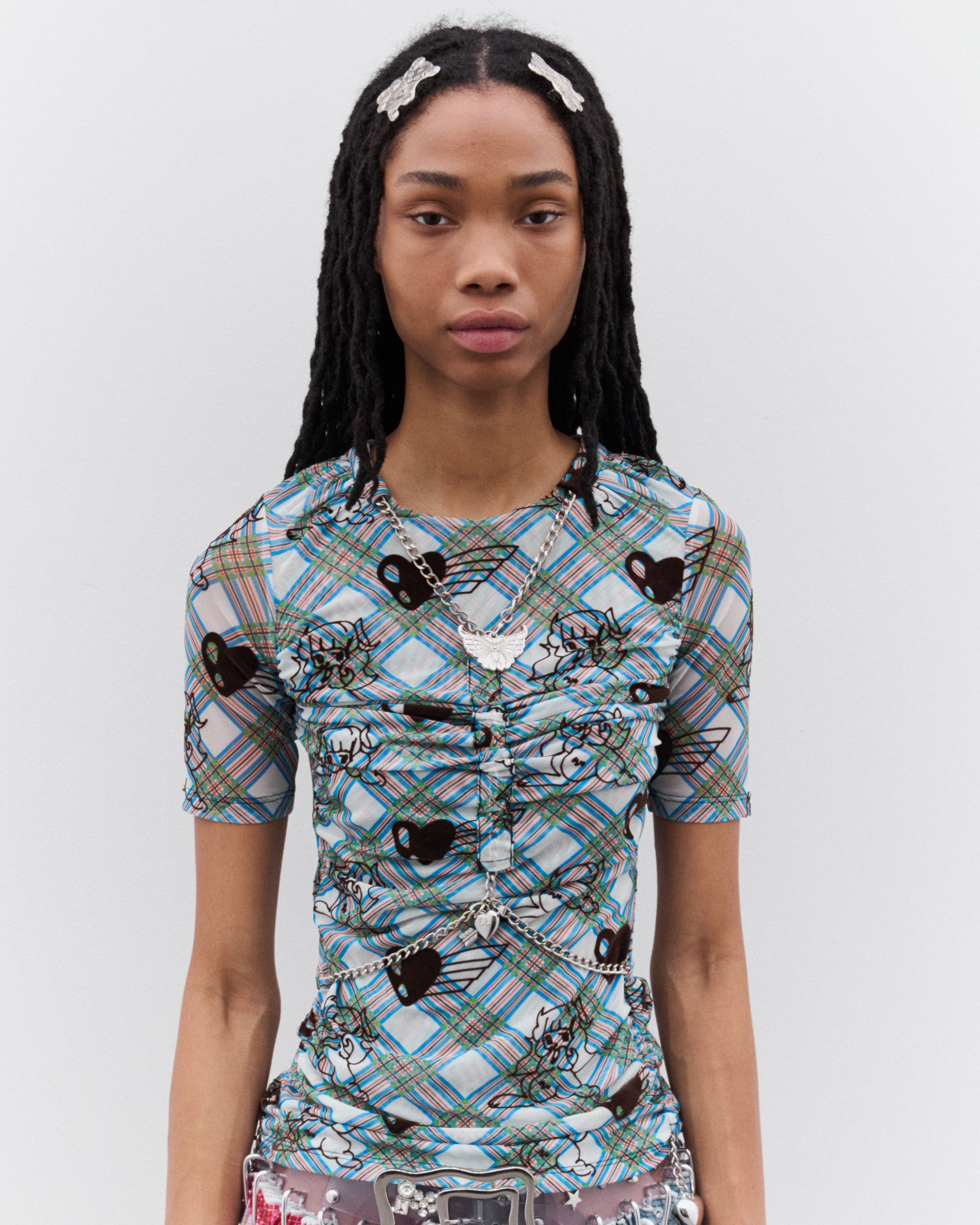 Blue tartan mesh shirtDouble layer mesh body Ruched bust and waistIntegrated chainBlack flockingCrewneck Short sleeve
