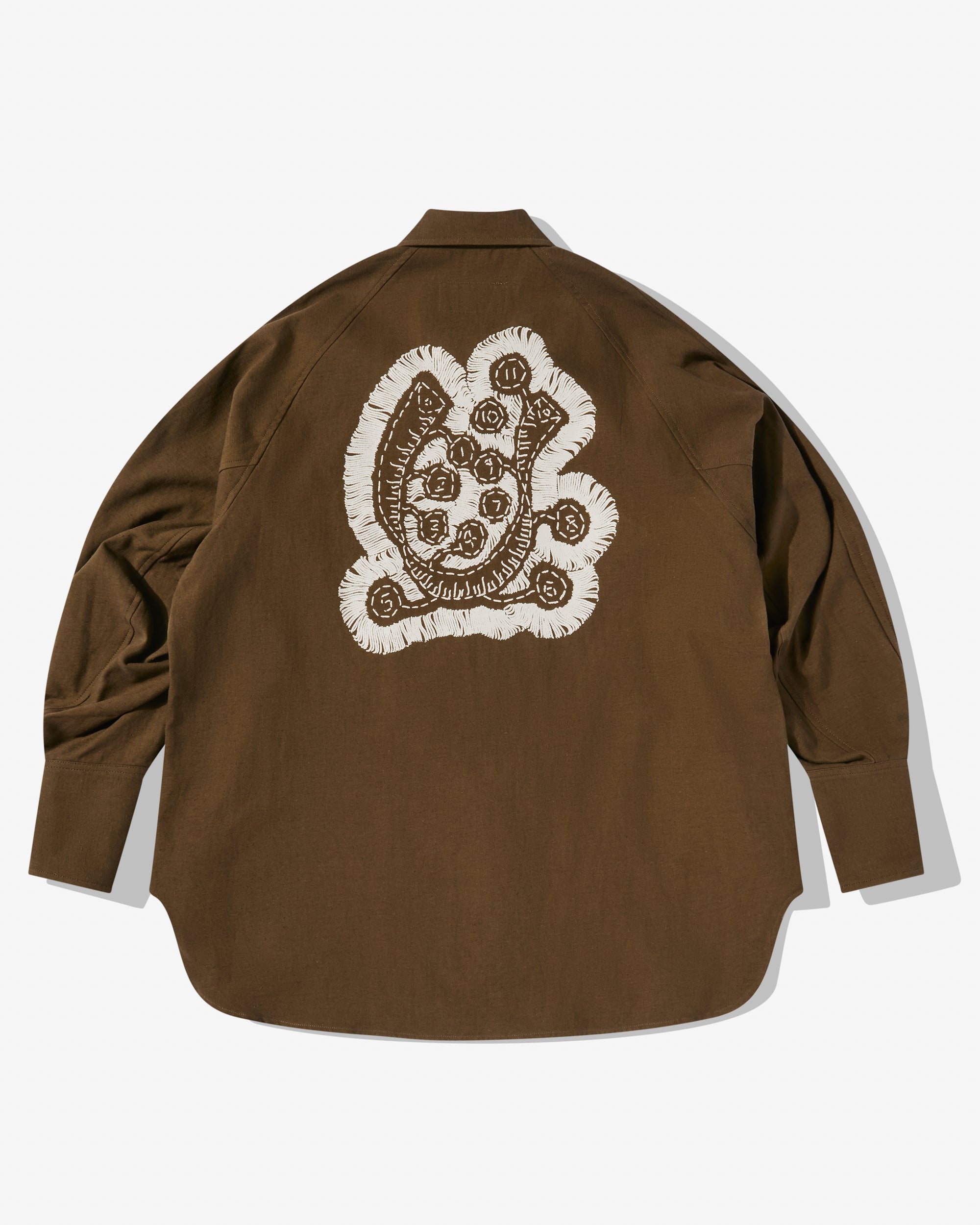 Classic collarCurved hemButton fasteningButtoned cuffsEmbroidered graphic at rearRaglan sleeve