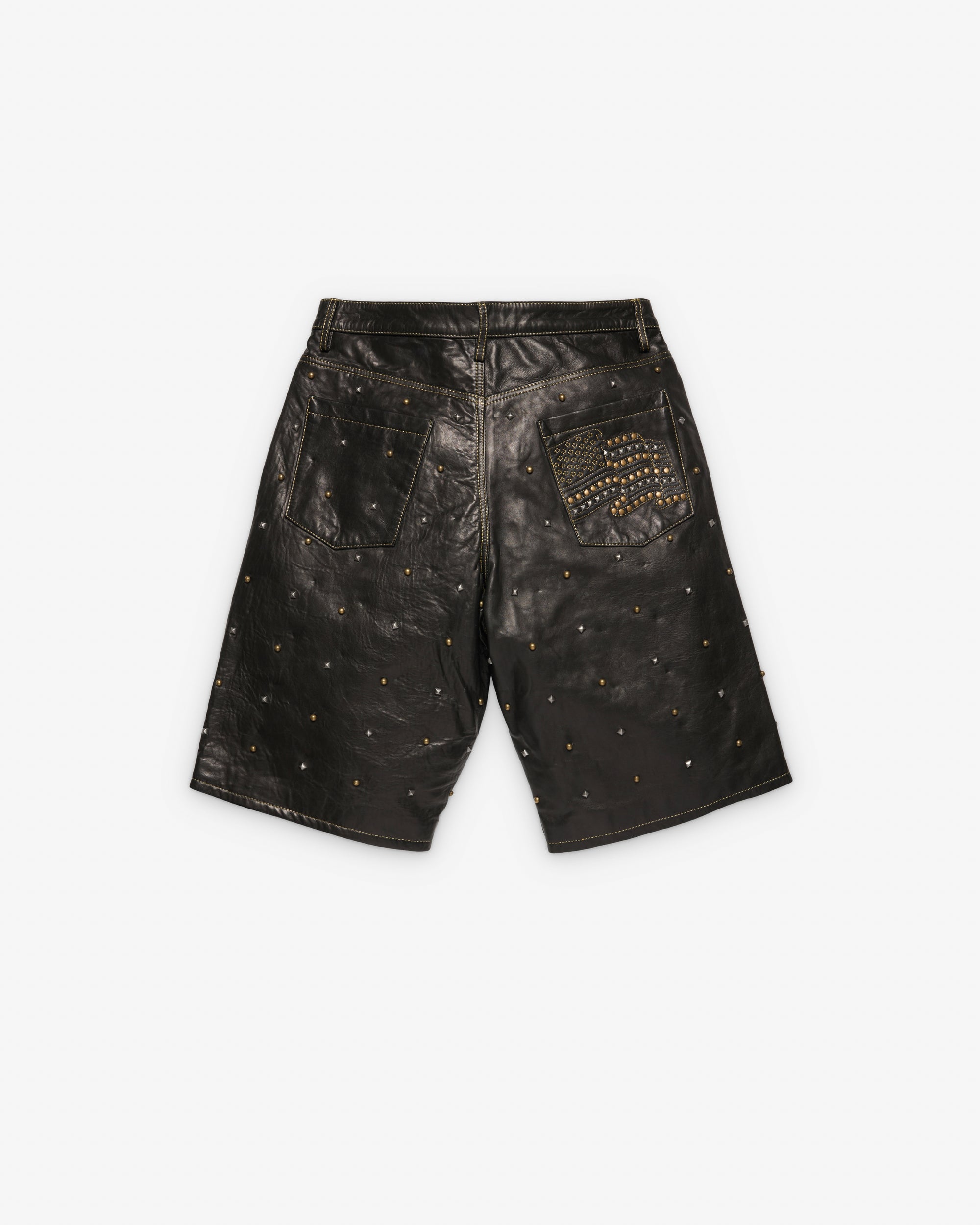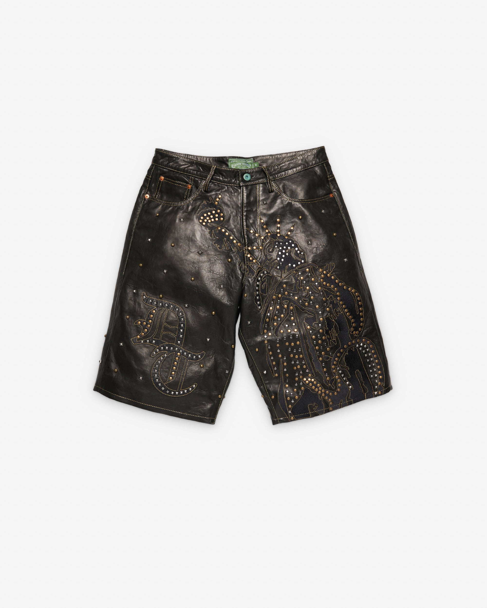 Five pocket construction Button waist, zip flyMetal rivet detailingStatement brass and oxidized stud appliqué throughoutFinished with gold thread embroider