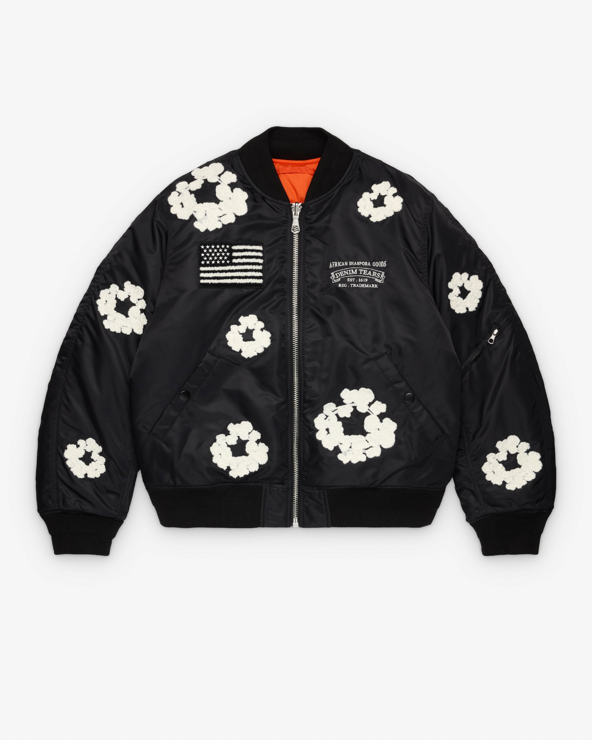 Classic MA-1 shapeZip front closureReversibleCotton wreath motif throughoutPocket on armTwo front pockets