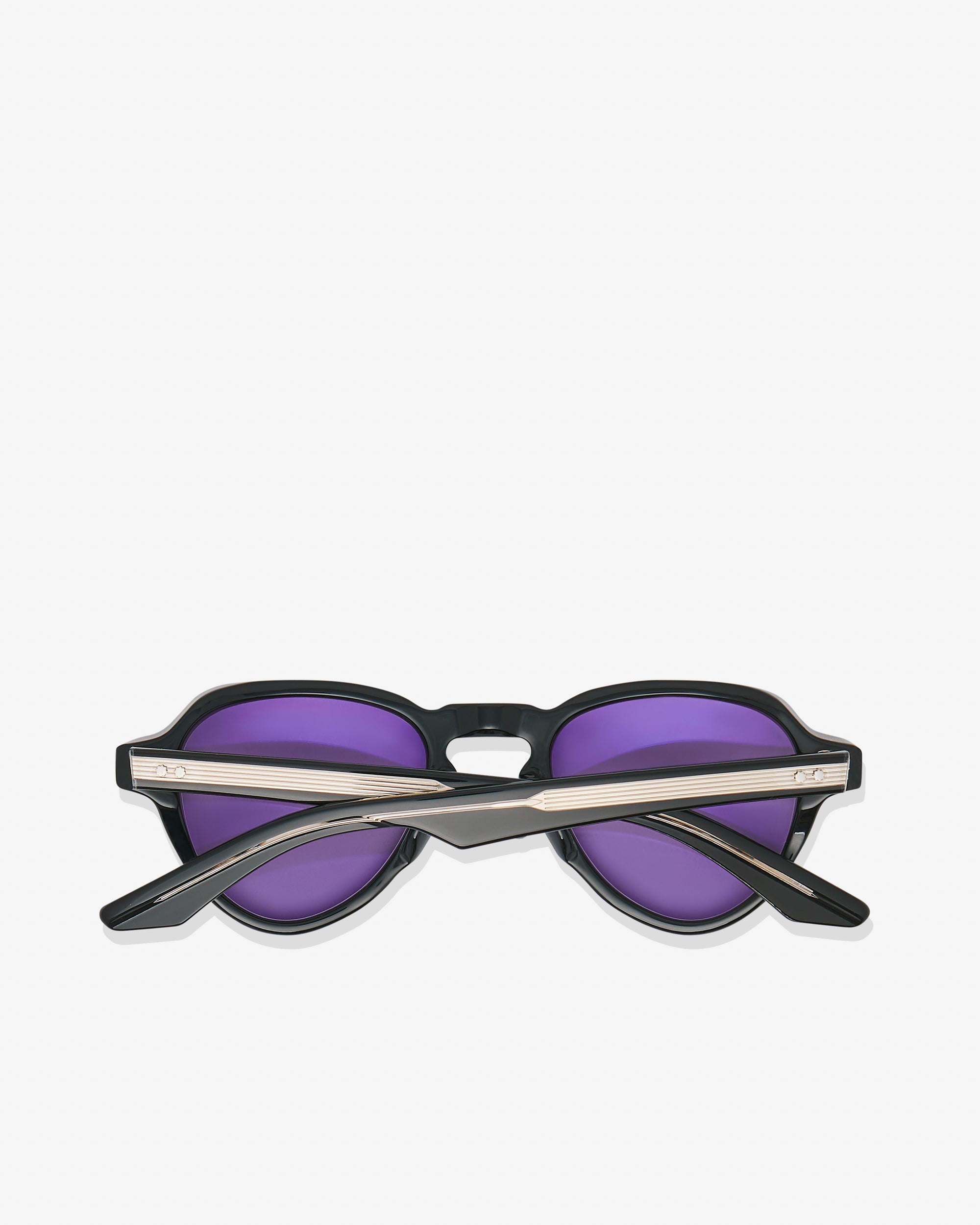 Black double laminated 10mm cured cellulose acetate frame with custom double laminated temples featuring precious metal hardware and purple lenses