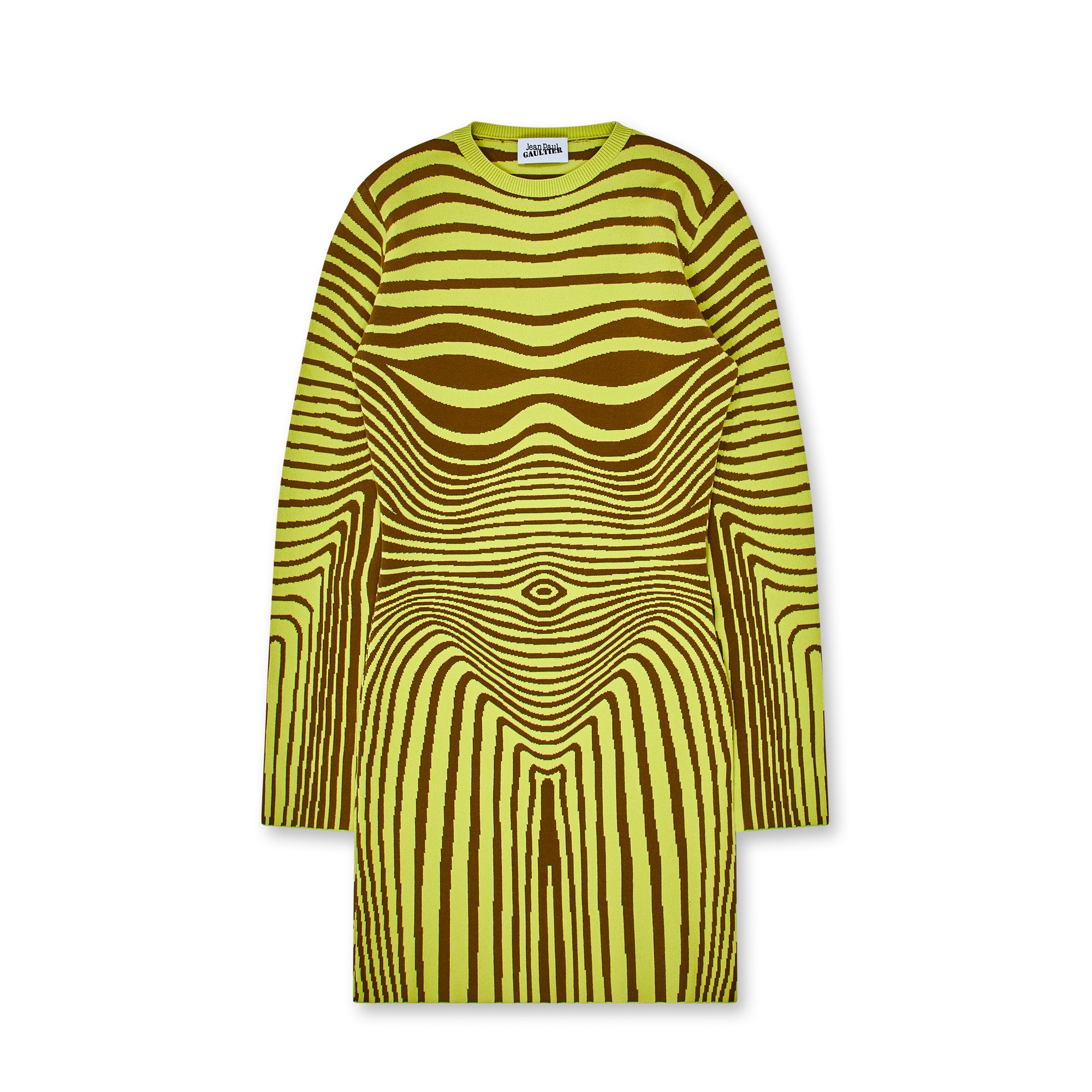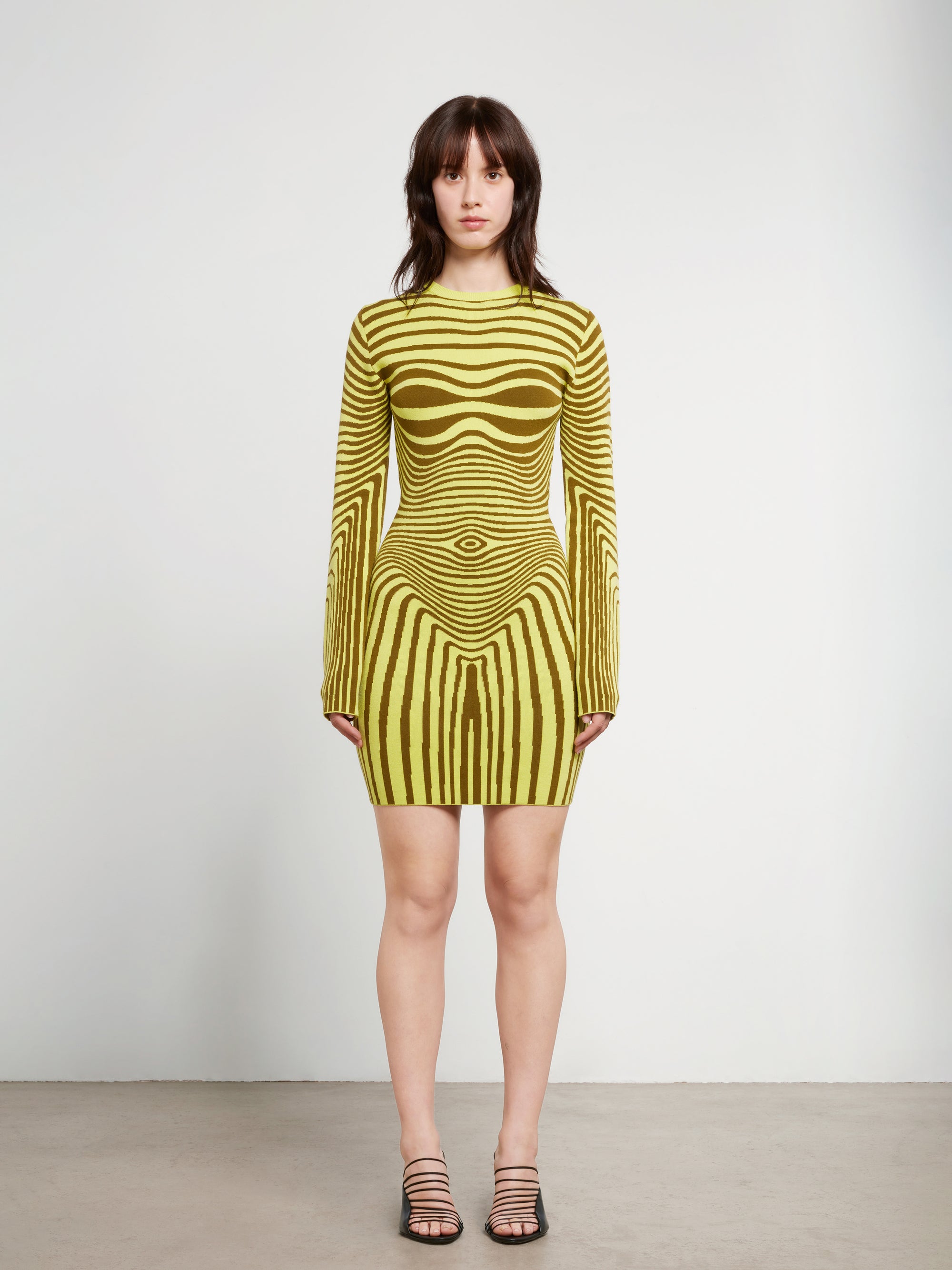 Short jacquard viscose dress with lime and khaki stripes along body.