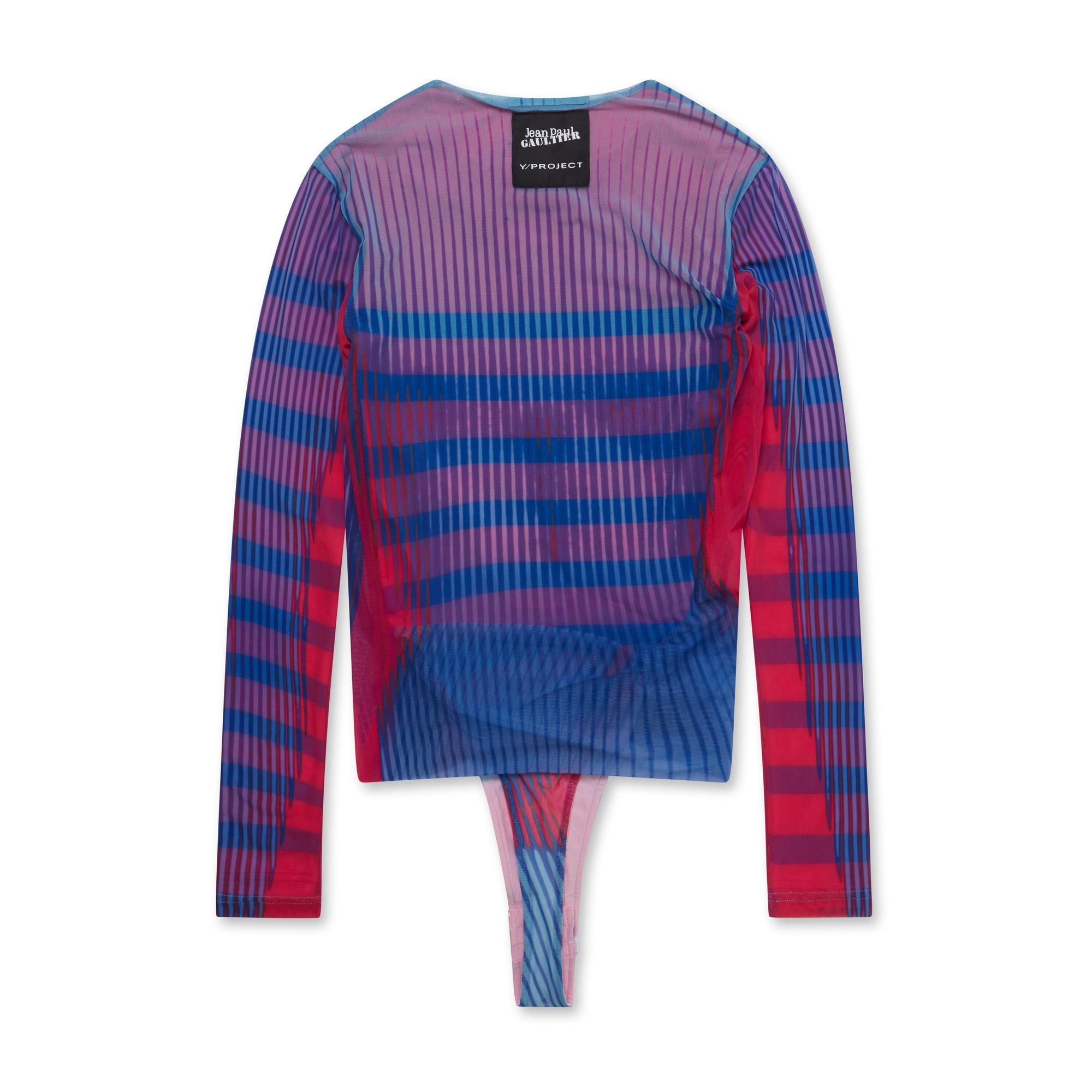 Jean Paul Gaultier x Y Project fitted, long sleeve, Body Morph print bodysuit features an attached mesh cover that can be draped and adjusted in different ways, creating interesting texture and volume along the sleeves and torso.