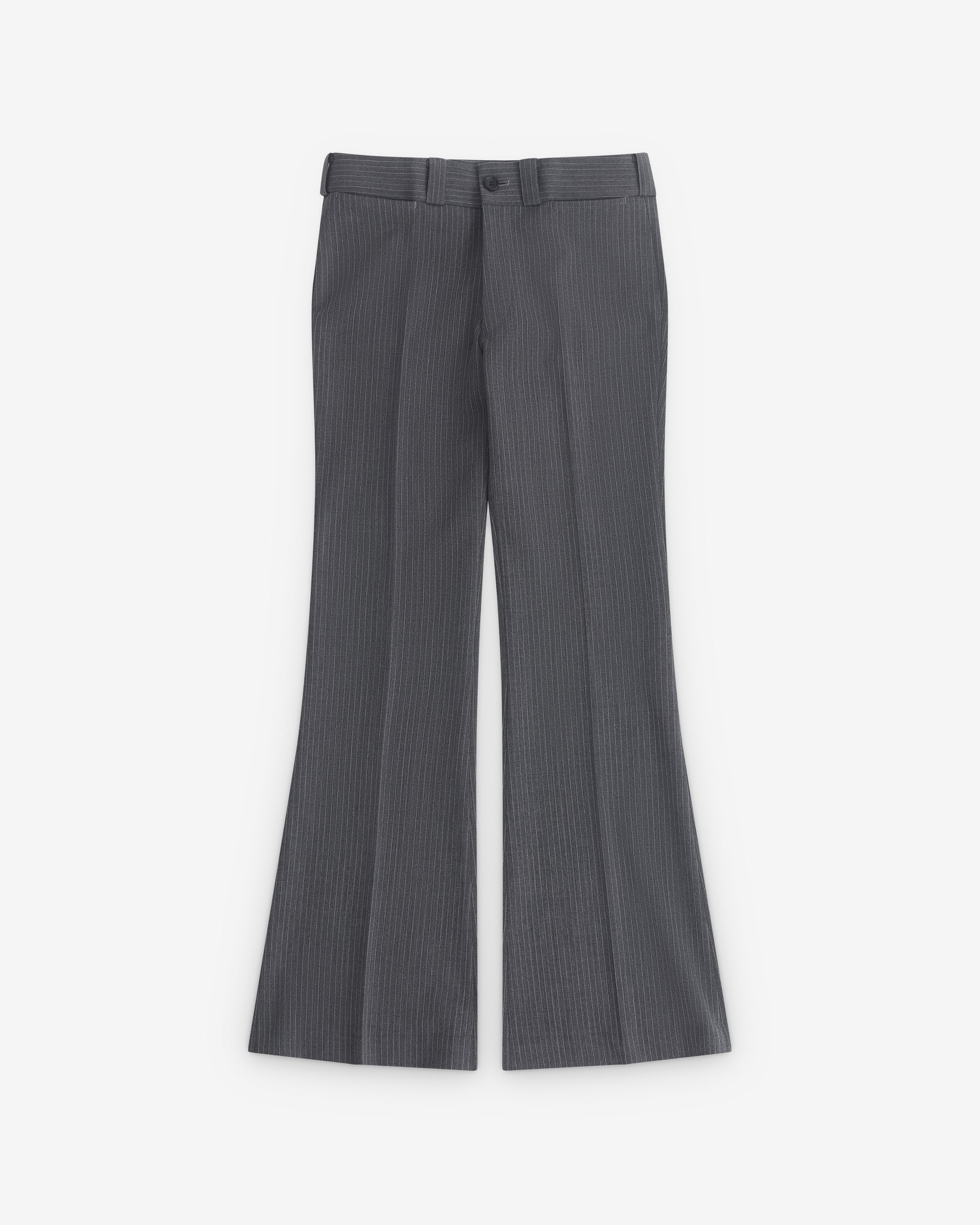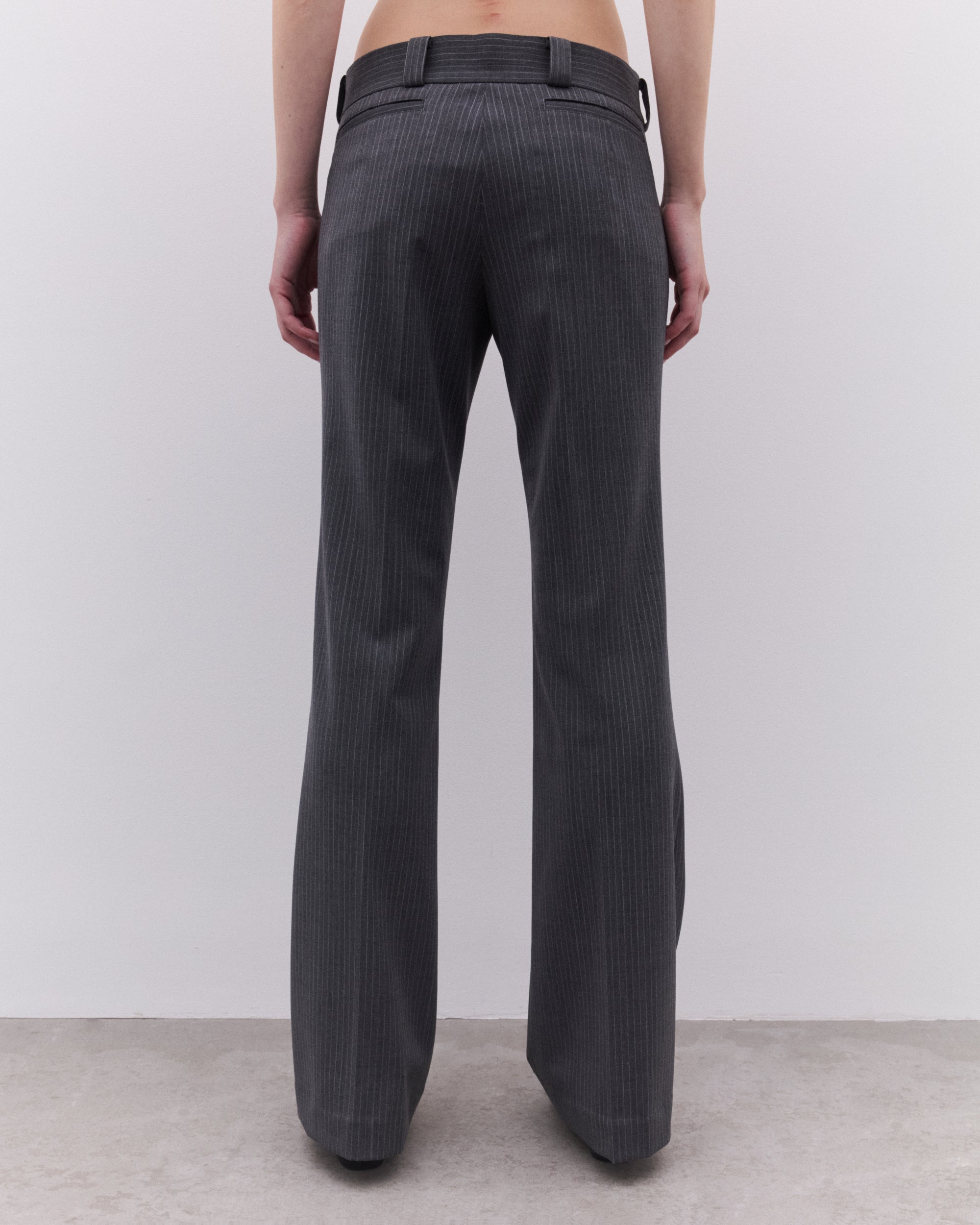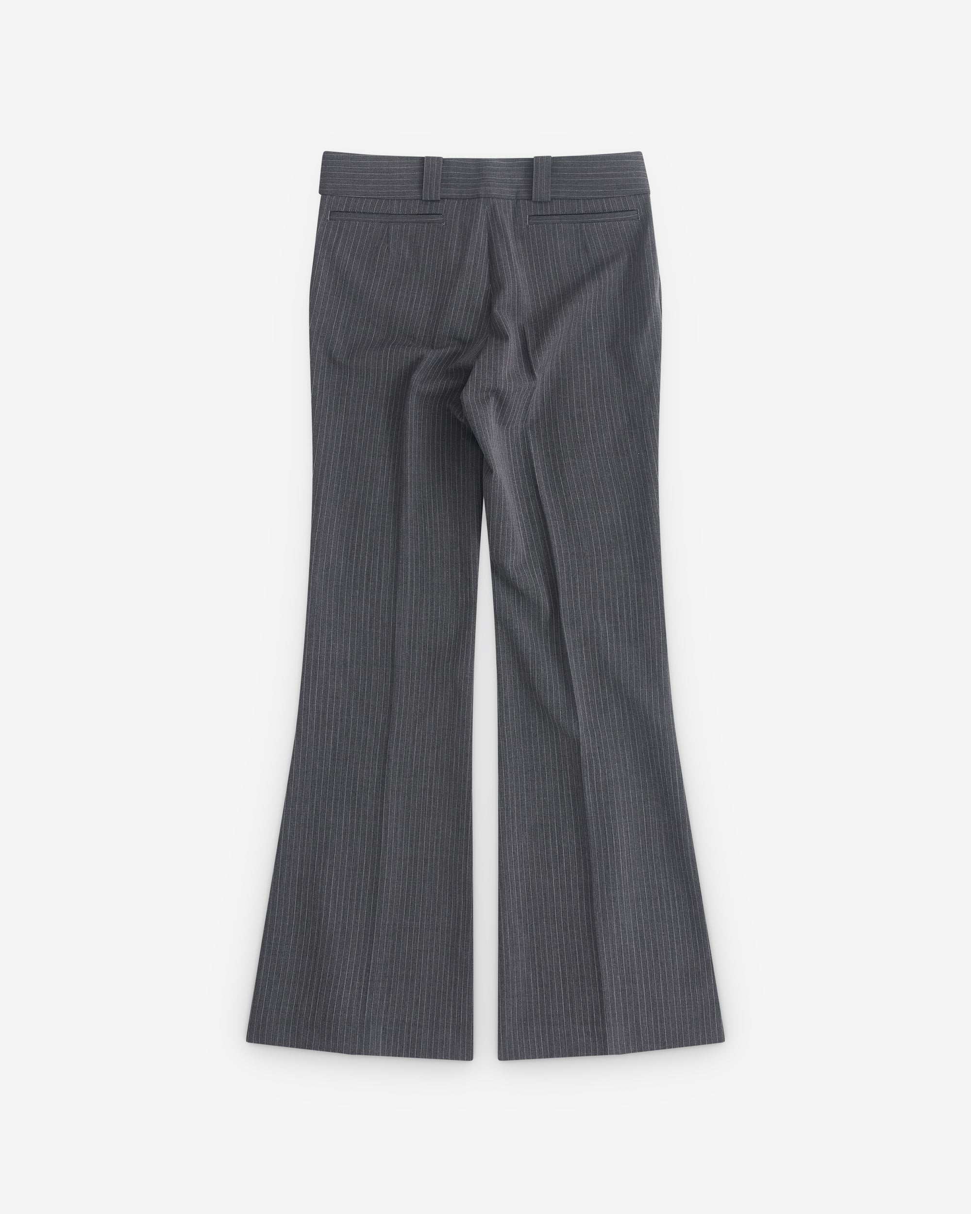Low waistPinstripeBootcutBelt loopsButton and zip fly fasteningRear welt pockets