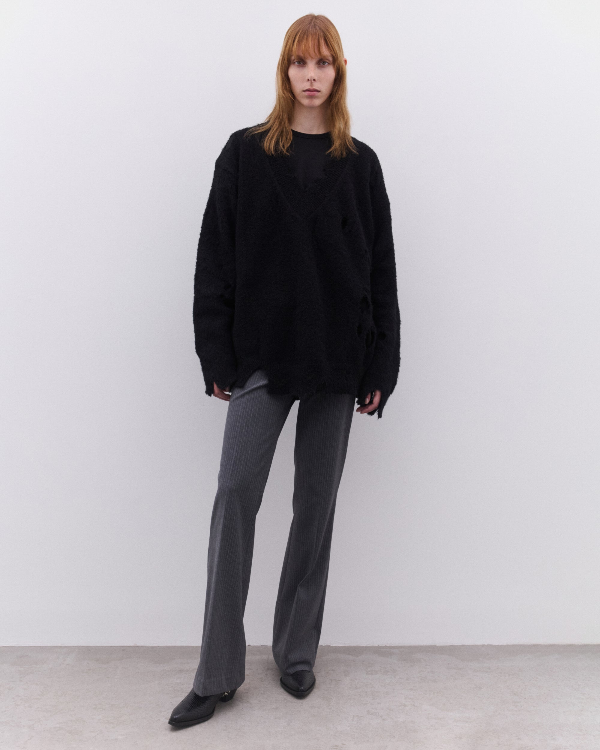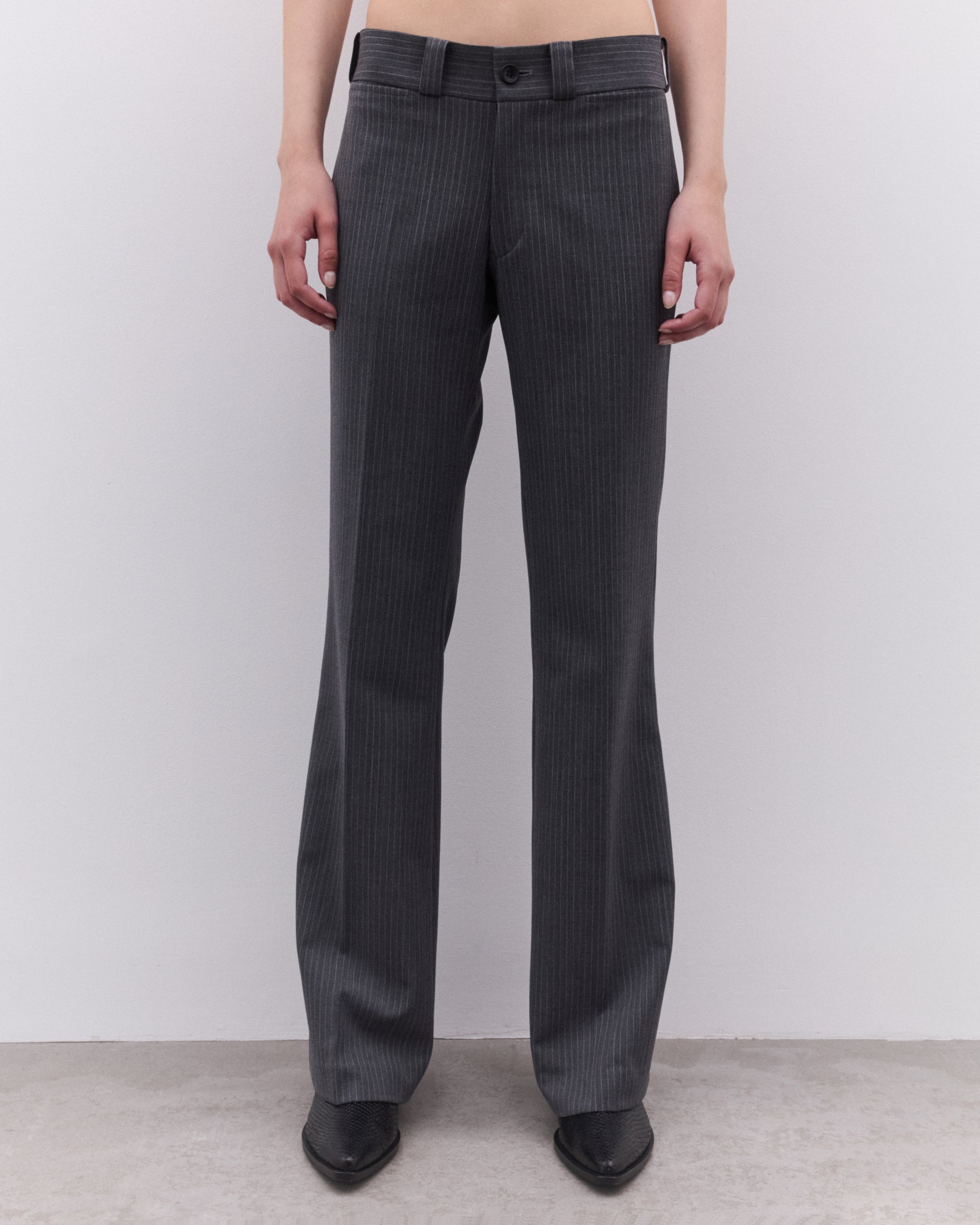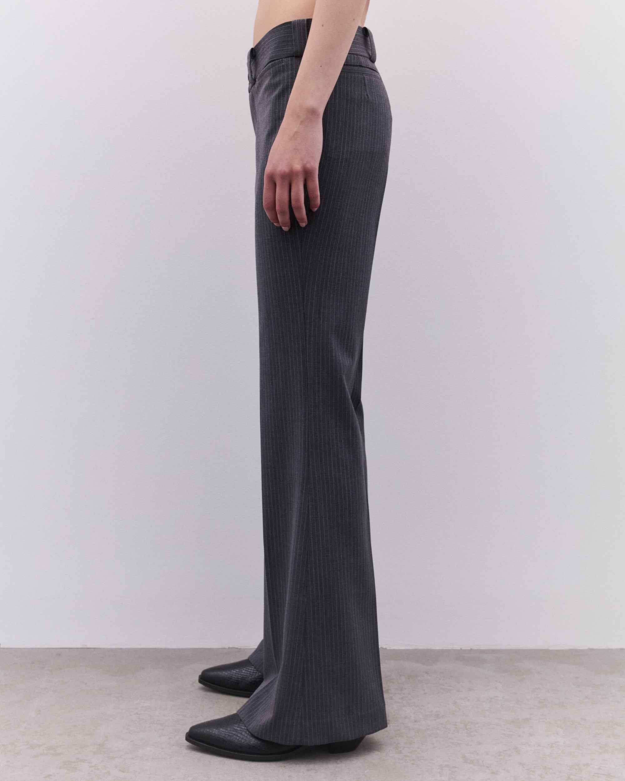 Low waistPinstripeBootcutBelt loopsButton and zip fly fasteningRear welt pockets