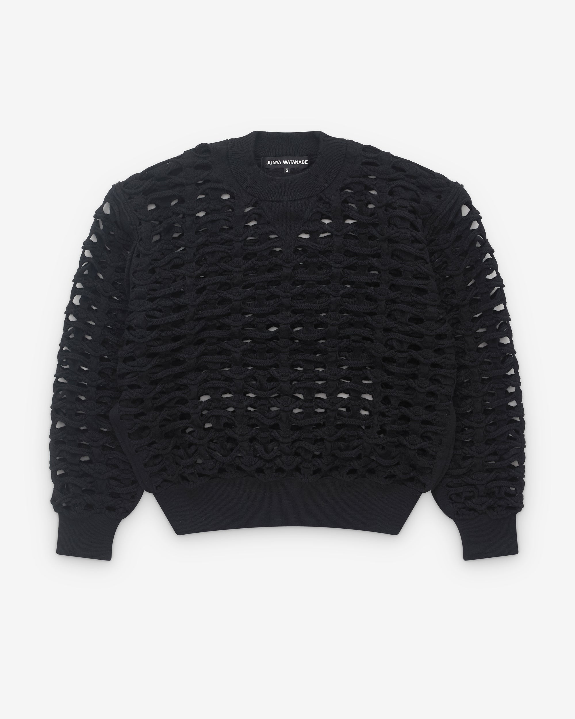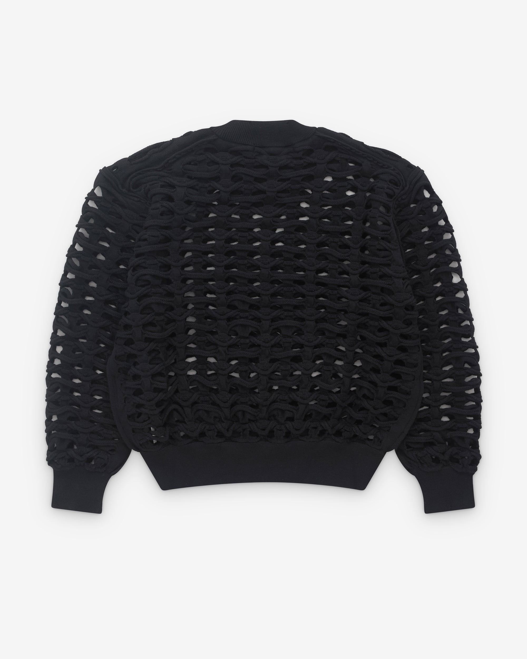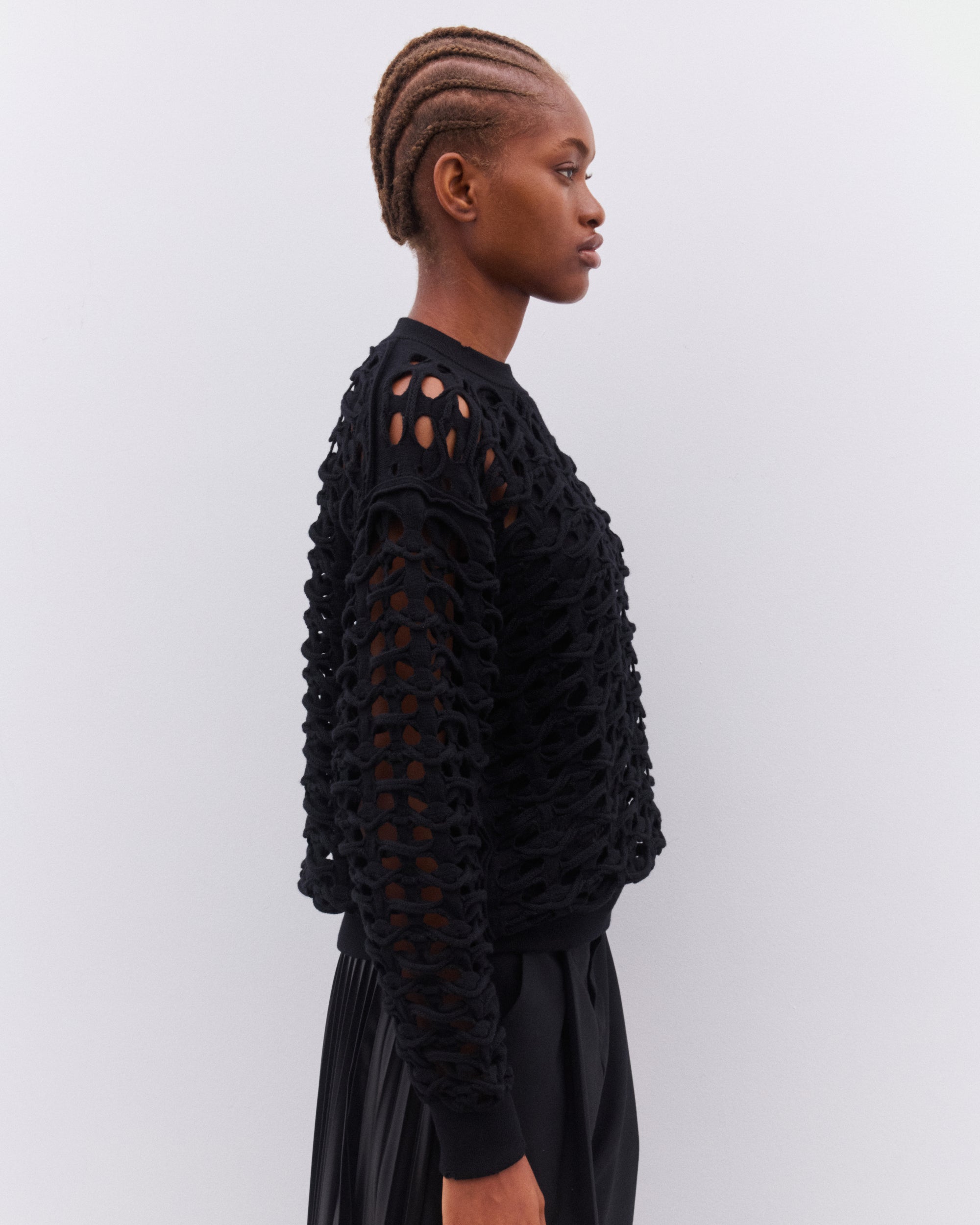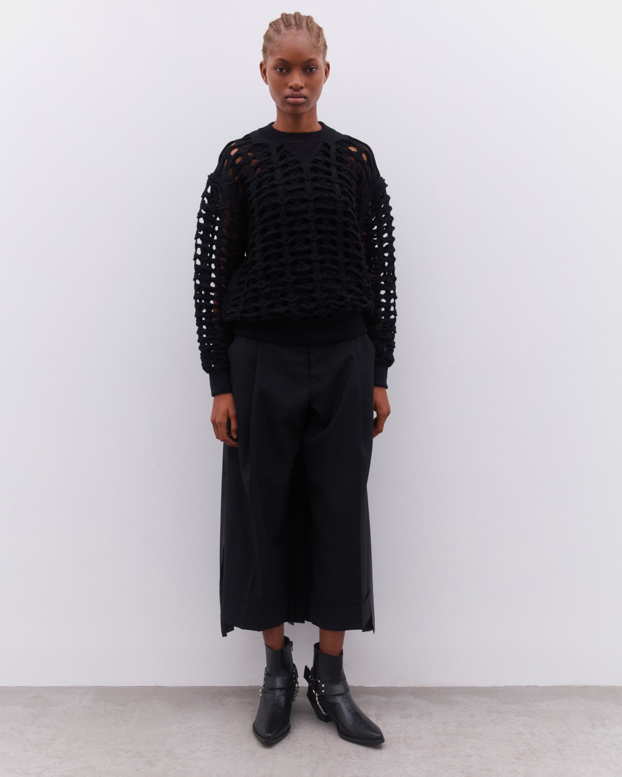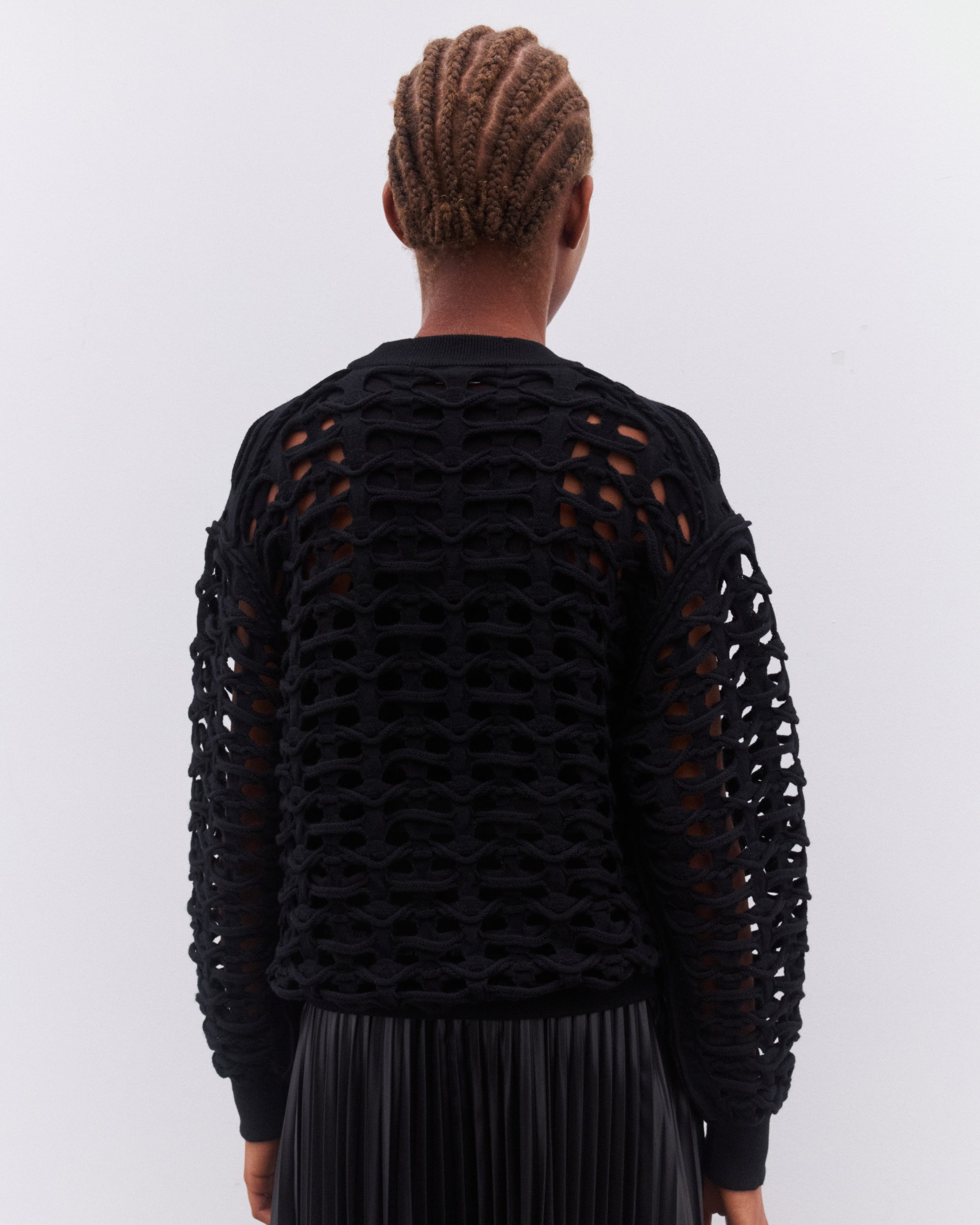 Round neckRib knit trimsOpen knit constructionBoxy fitDropped shoulders